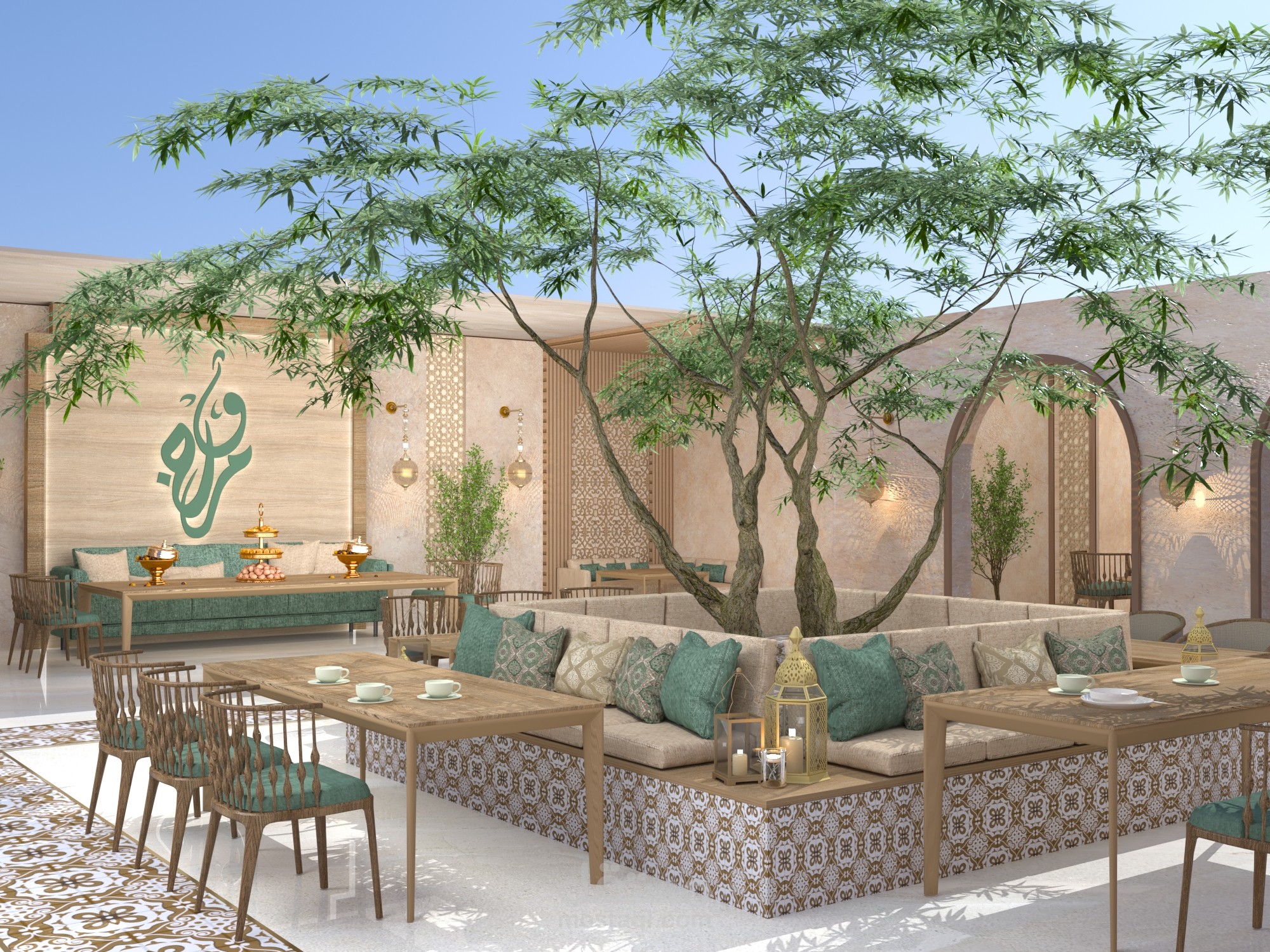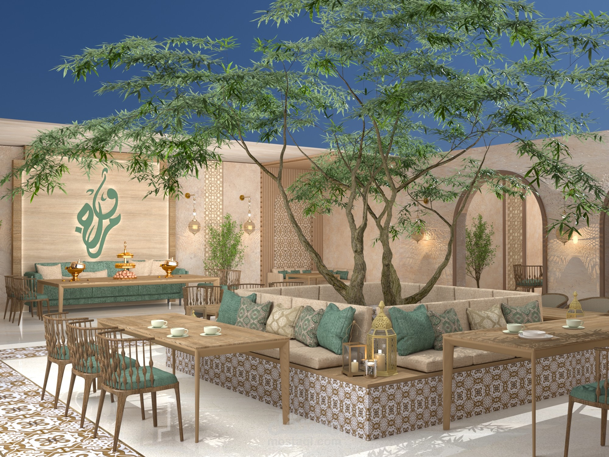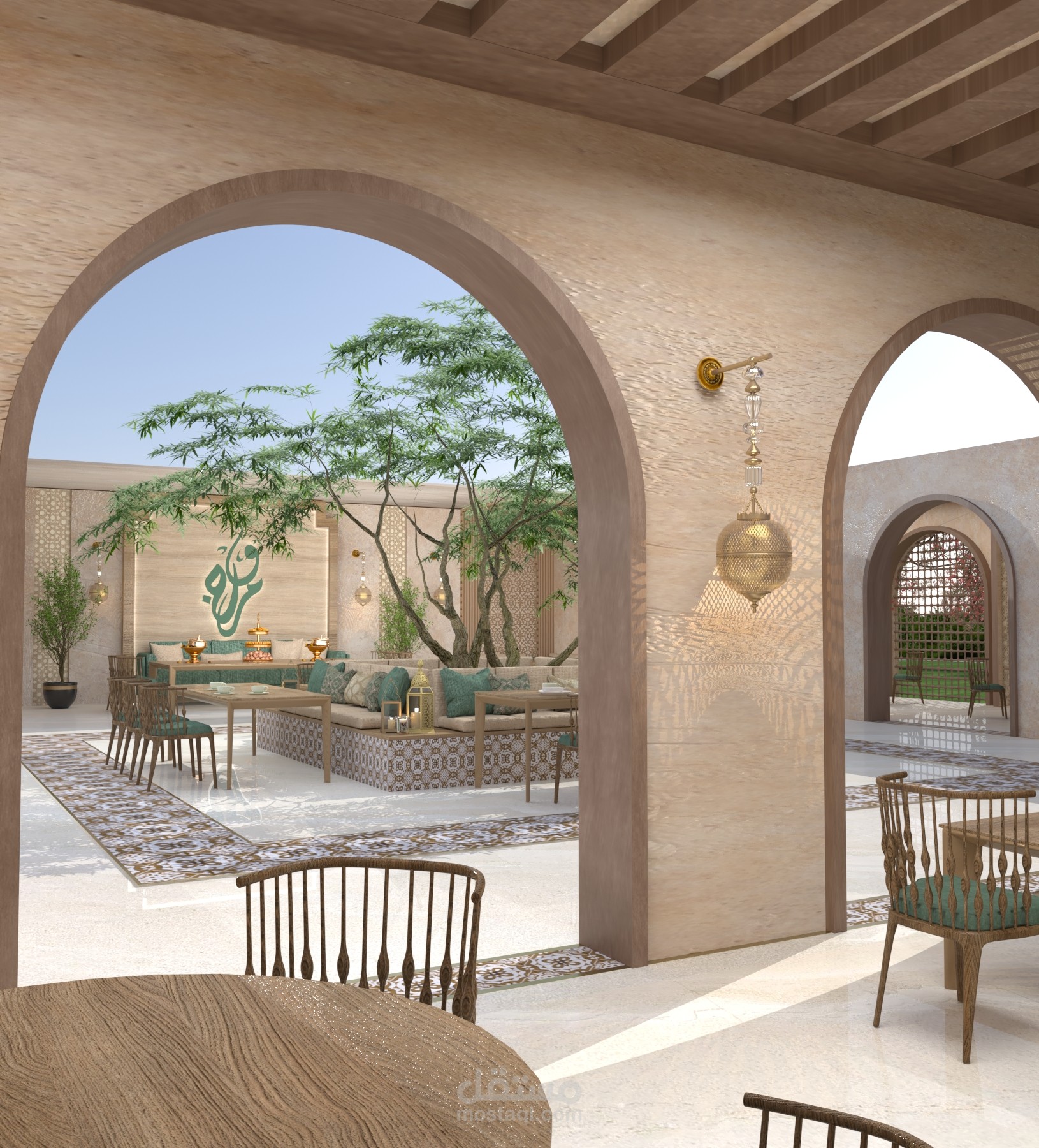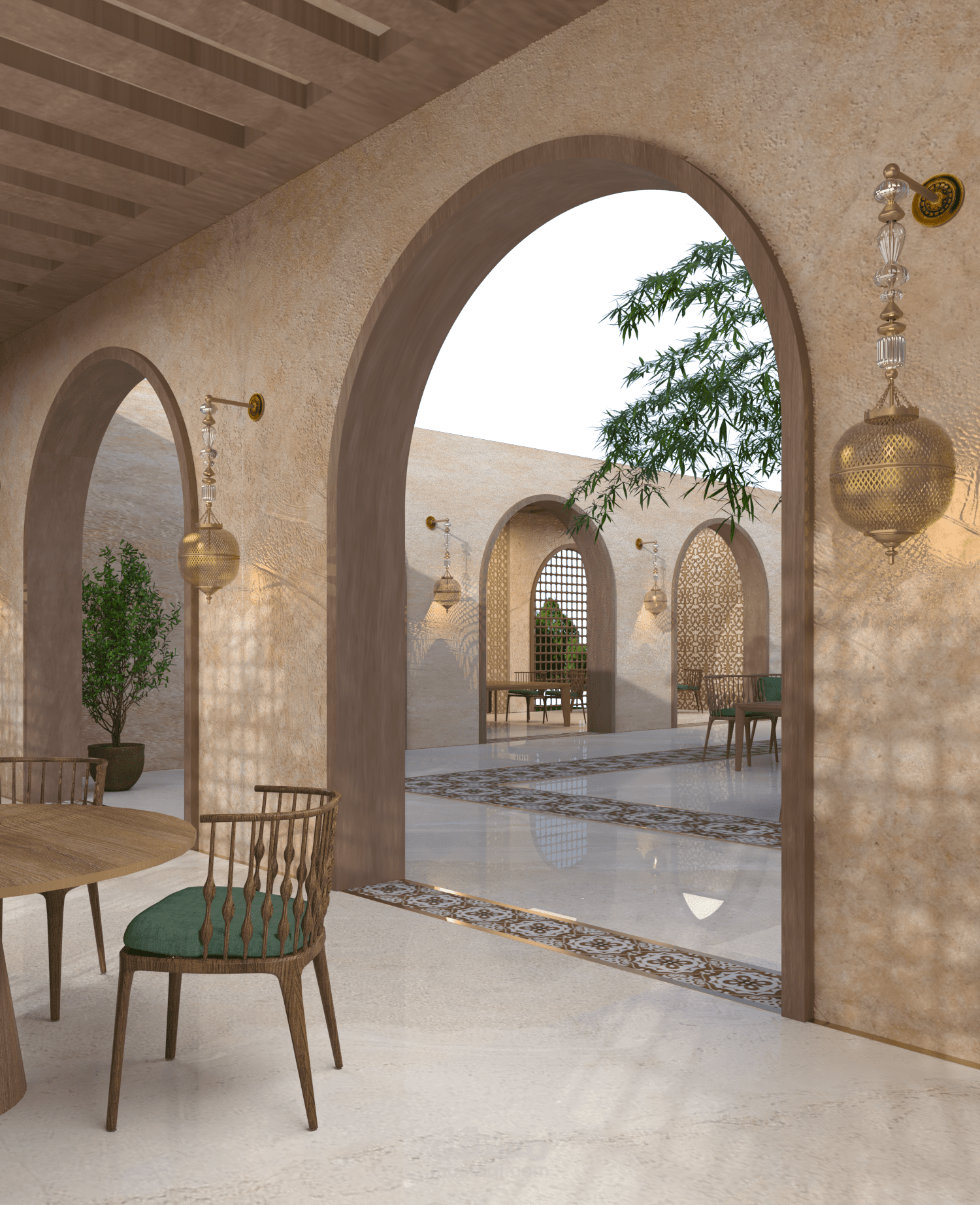 لقد قمتُ بتصميم مطعم مستوحى من الطراز الإسلامي، مع مراعاة أسس التصميم الإسلامي في عدة جوانب: