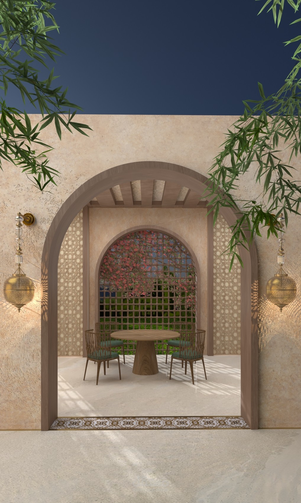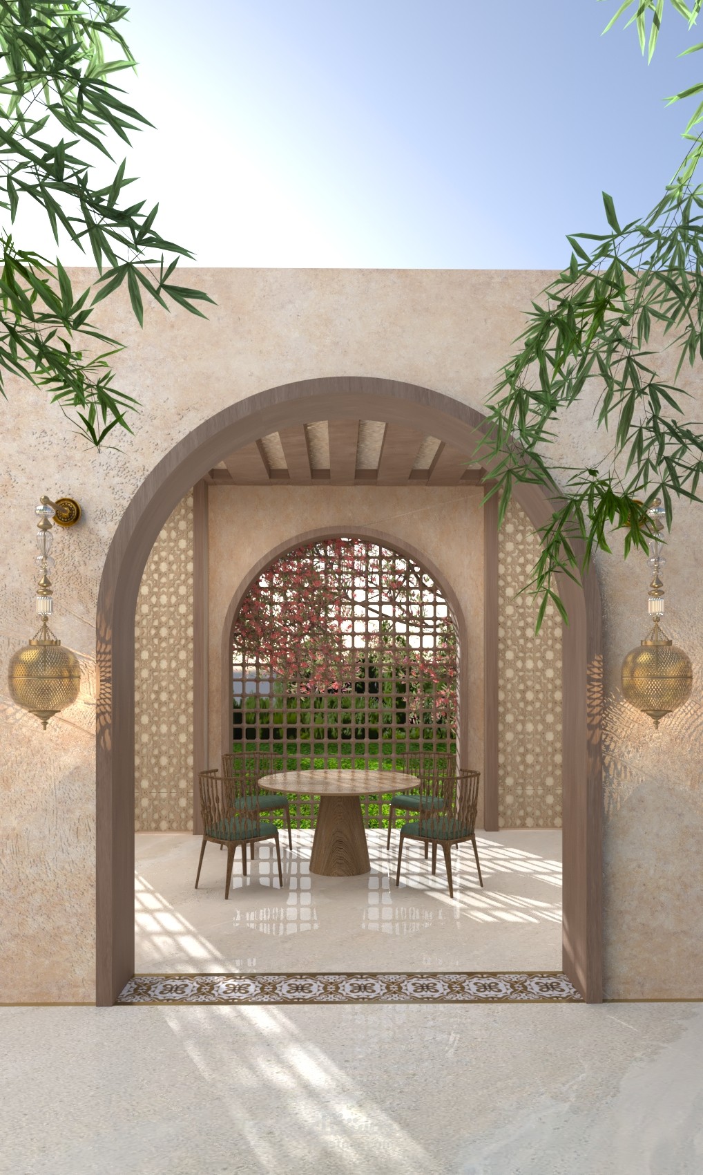 العناصر الخضراء: أدمجتُ النباتات الداخلية في التصميم لخلق جو هادئ ومريح، مستوحى من الحدائق الإسلامية التقليدية التي تعزز الشعور بالسكينة والانسجام مع الطبيعة.