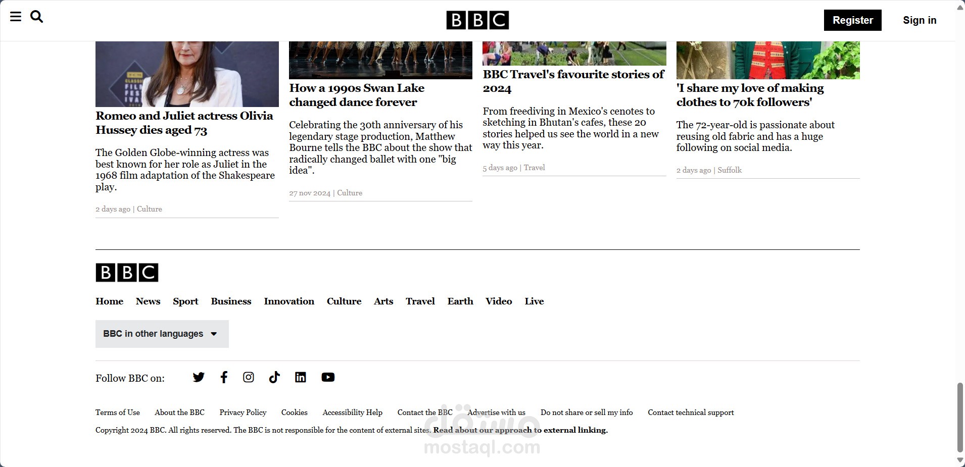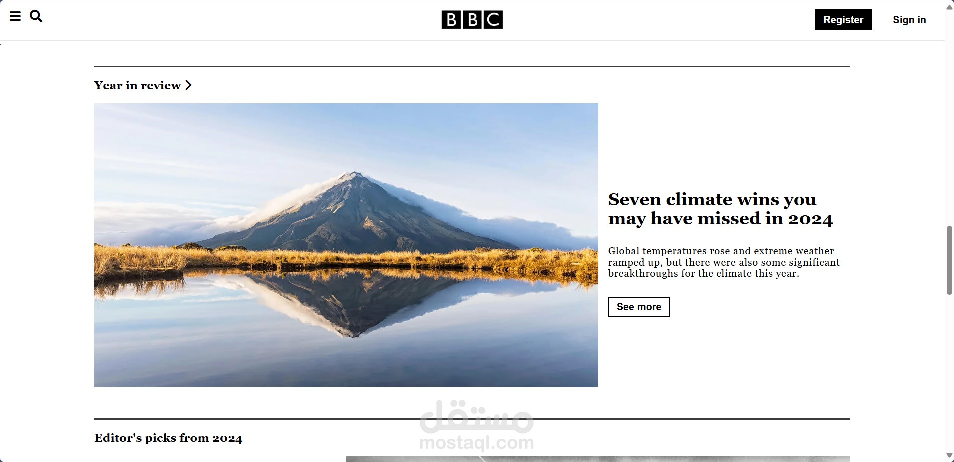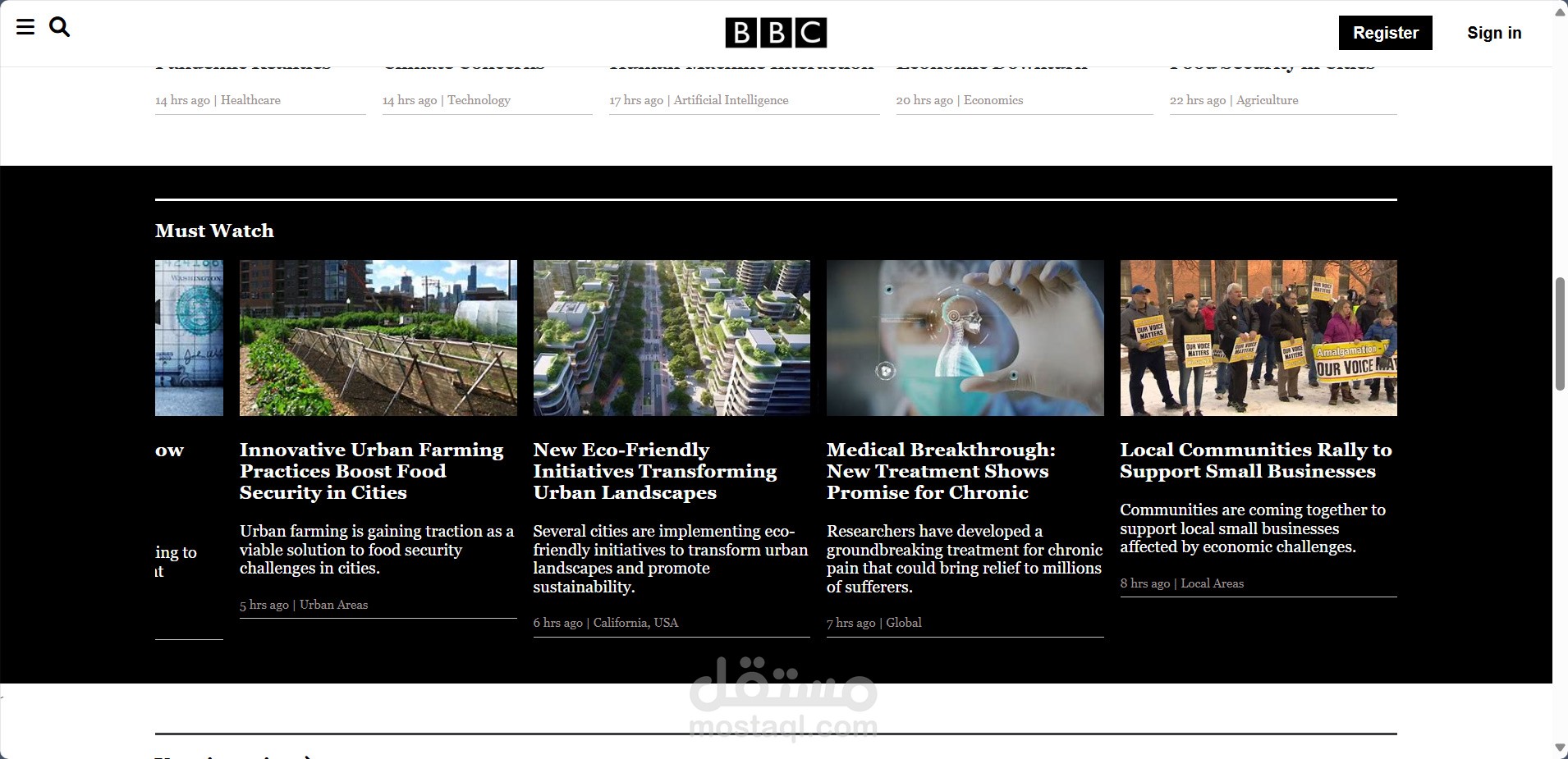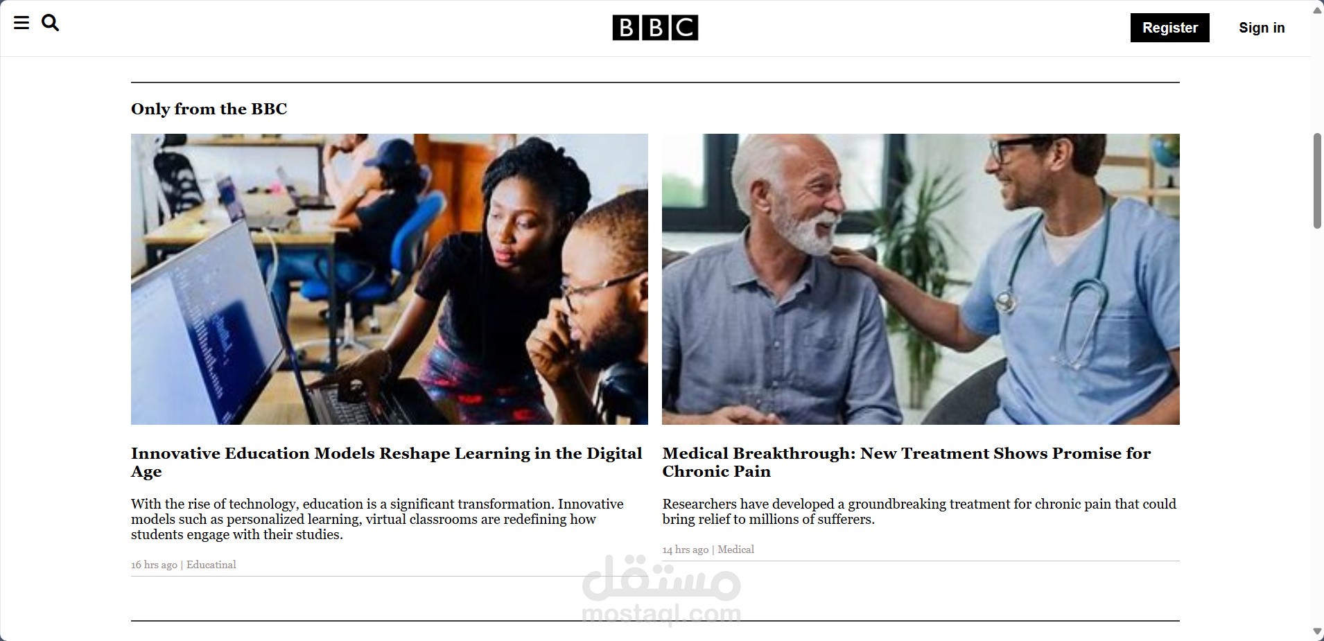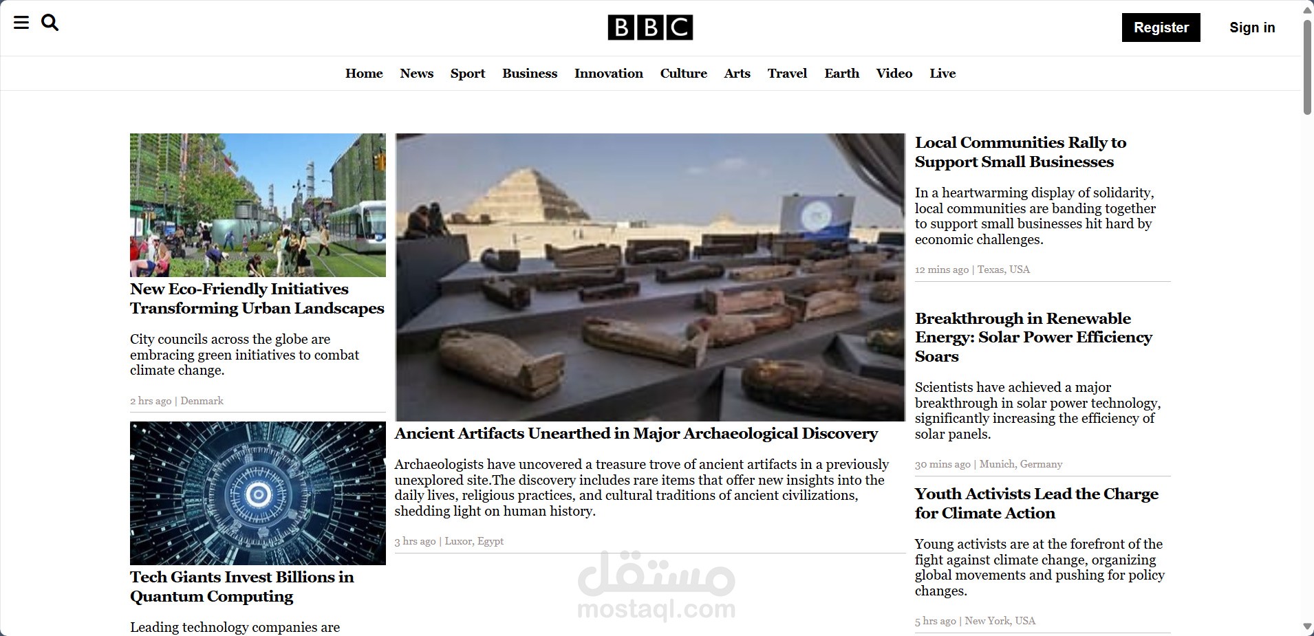 طورت صفحة هبوط متجاوبة مستوحاة من تصميم بي بي سي للأخبار باستخدام HTML وCSS. التصميم يتميز بتخطيط نظيف مع شبكة منظمة، ترتيب الخطوط بشكل هرمي، وتنقل سلس. ركزت على محاكاة واجهة إخبارية احترافية تتكيف بسهولة مع الأجهزة المكتبية والمحمولة