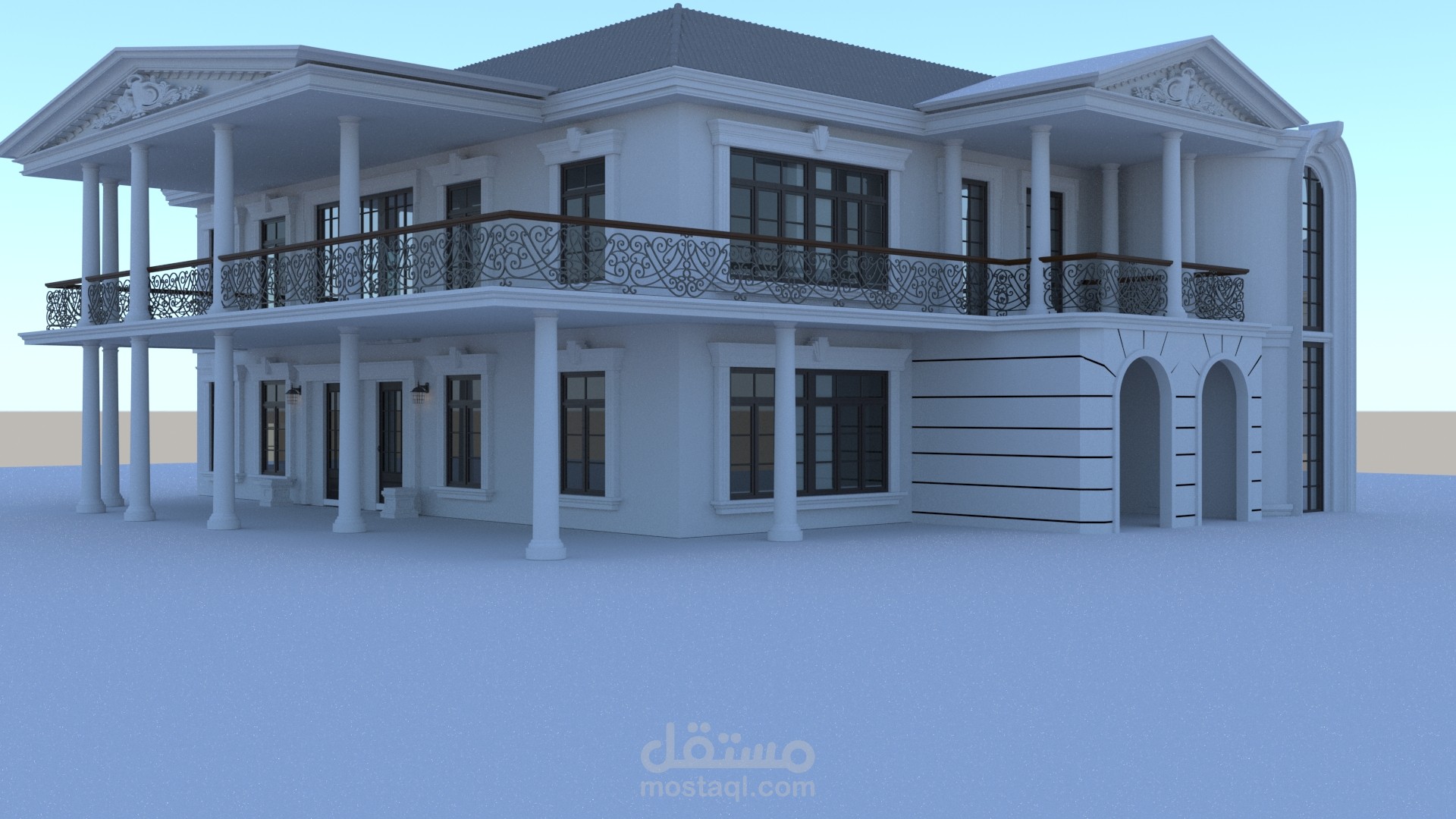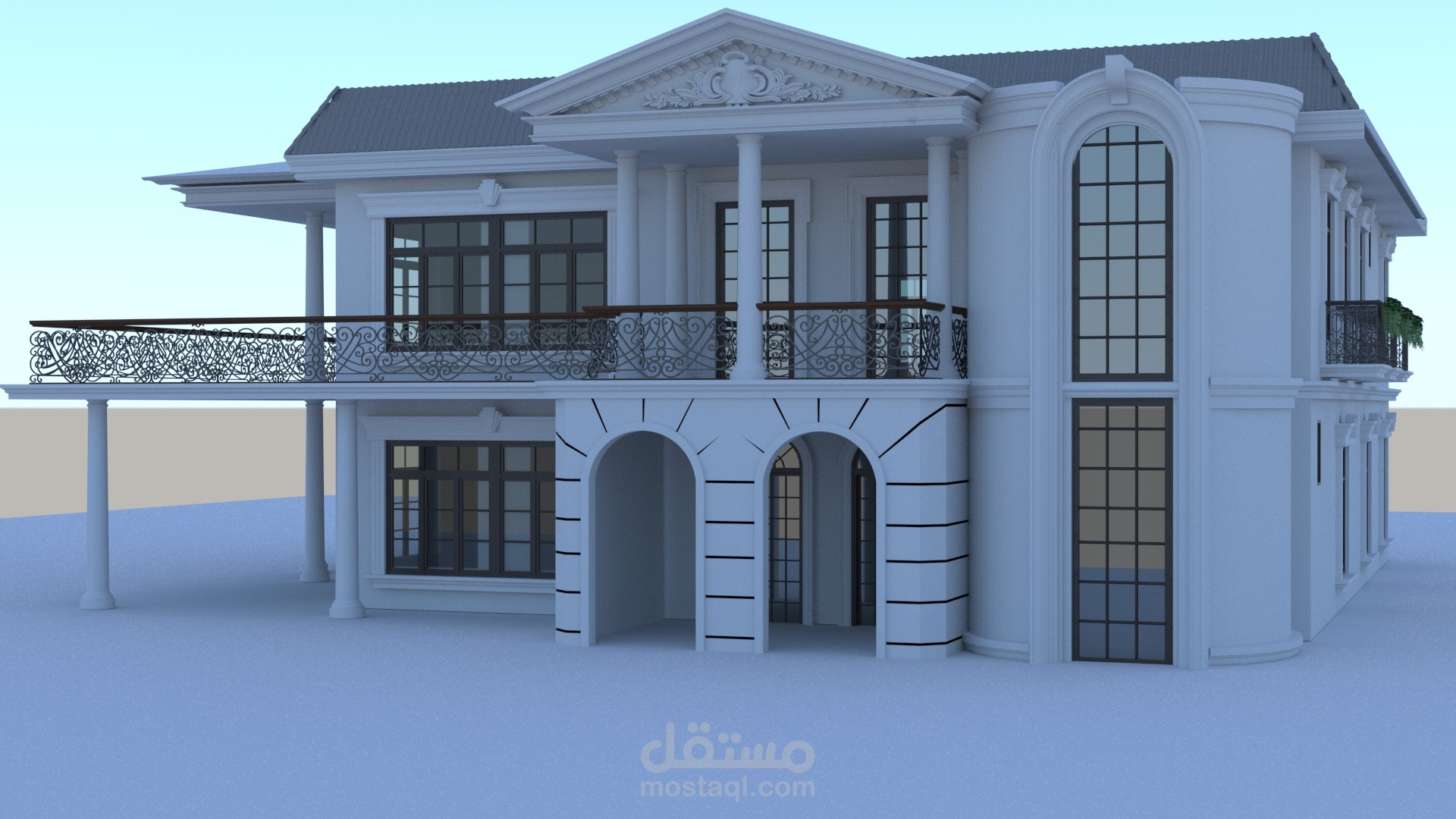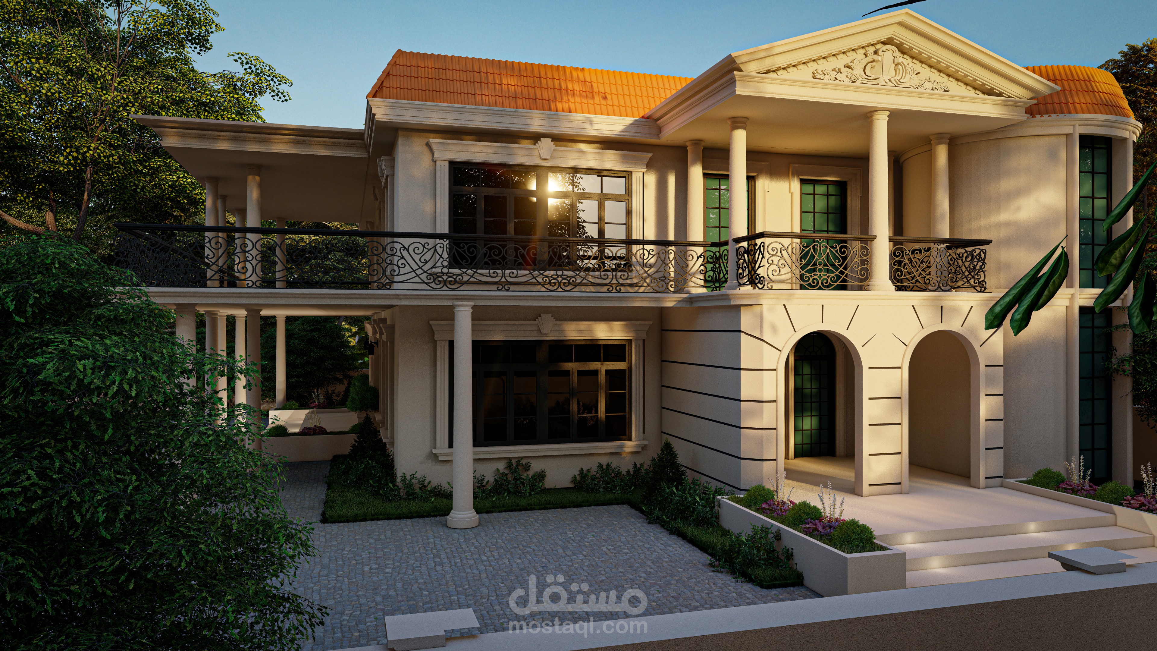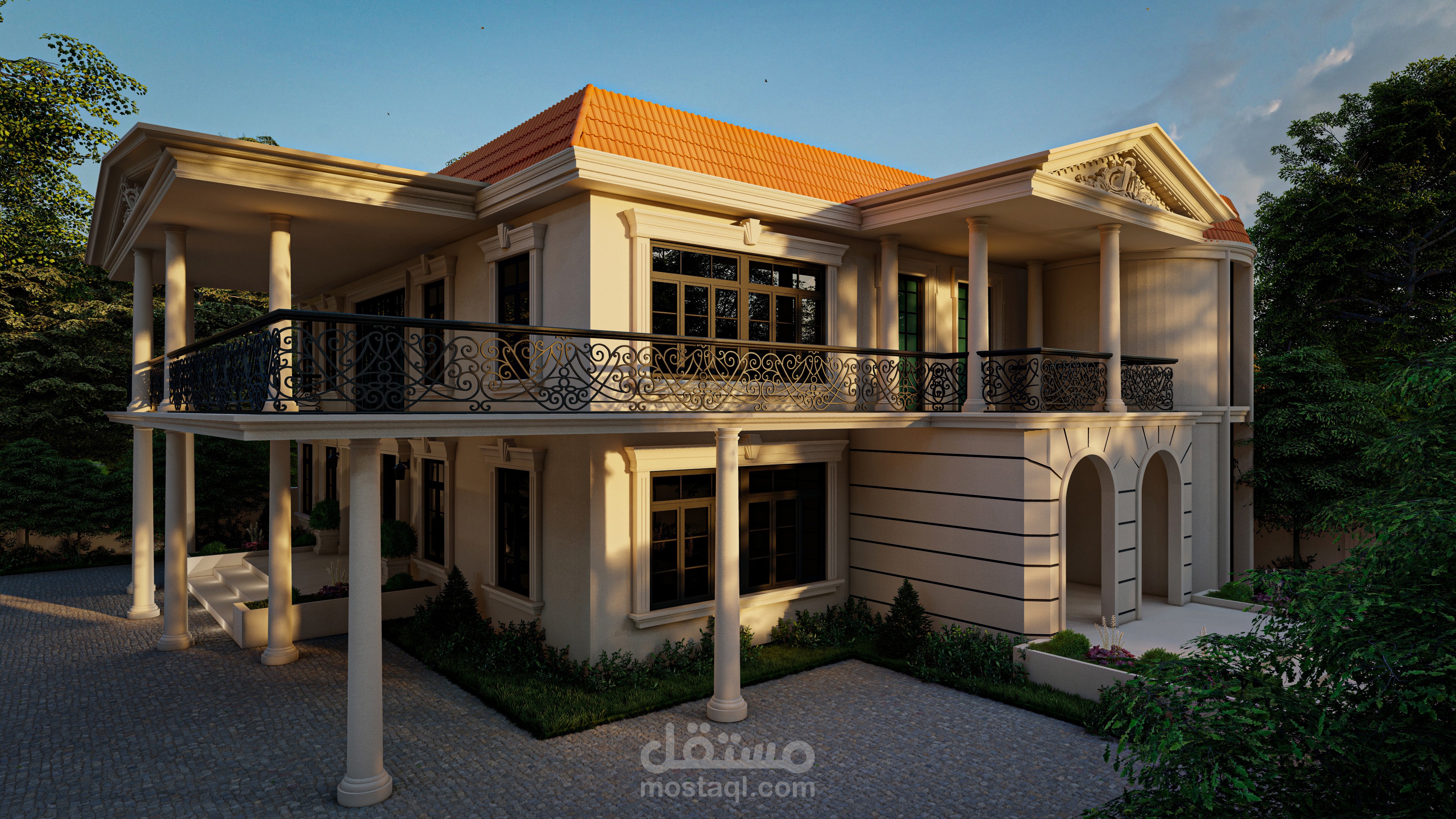 تم تصميم الفيلا باعتماد ستايل #الكلاسيك تلبية لطلب العميل مع استخدام القرميد كعامل للحماية من الحرارة الزائدة في تلك المنطقة كما أضفى عامل جمالي على تصميم الفيلا.