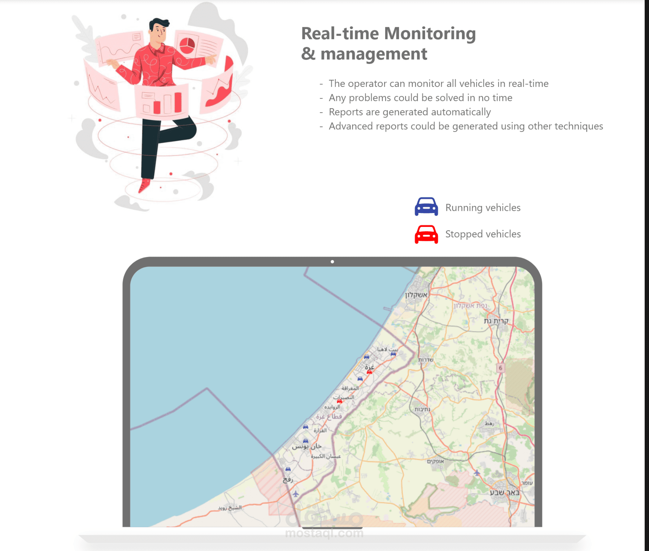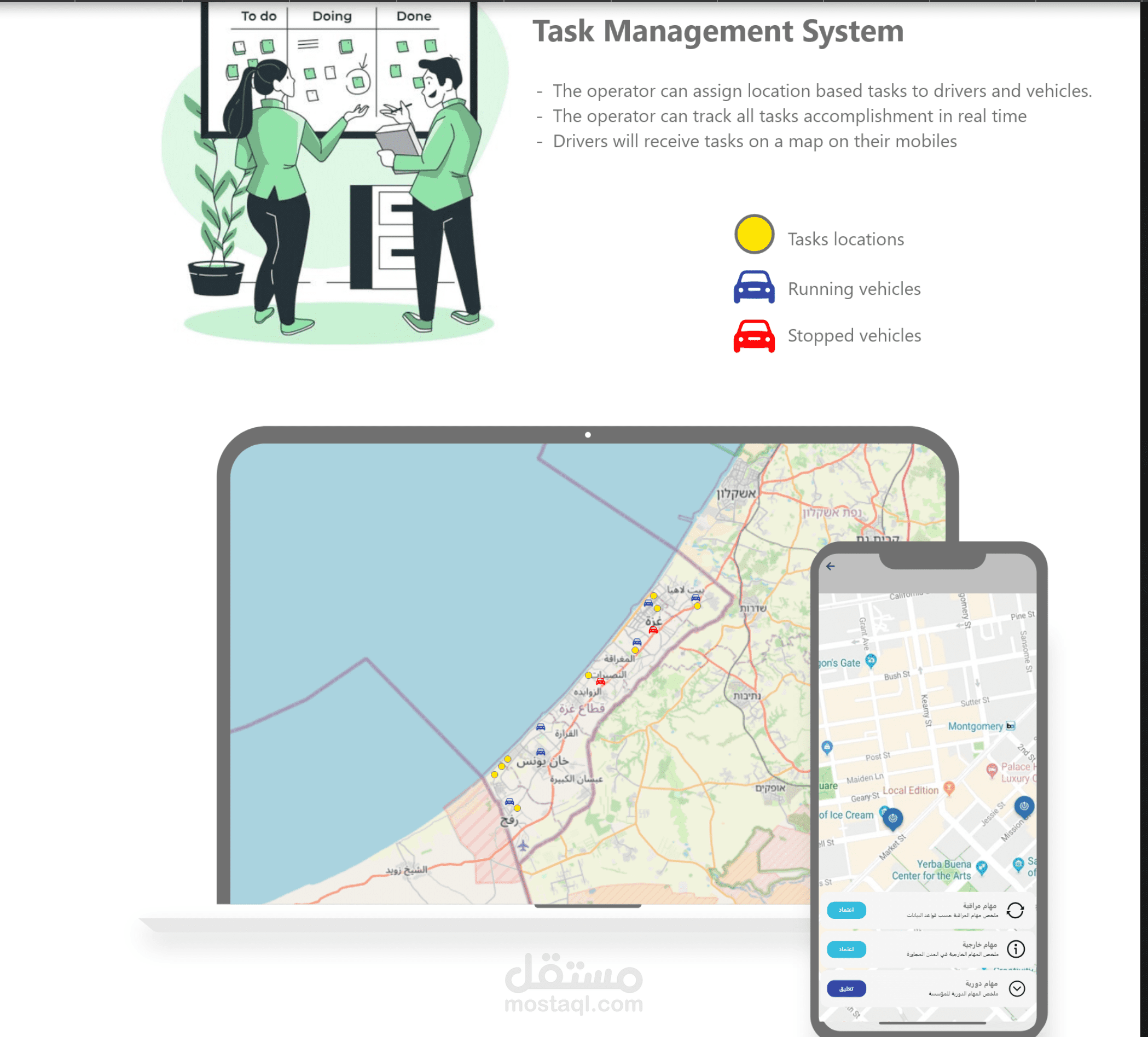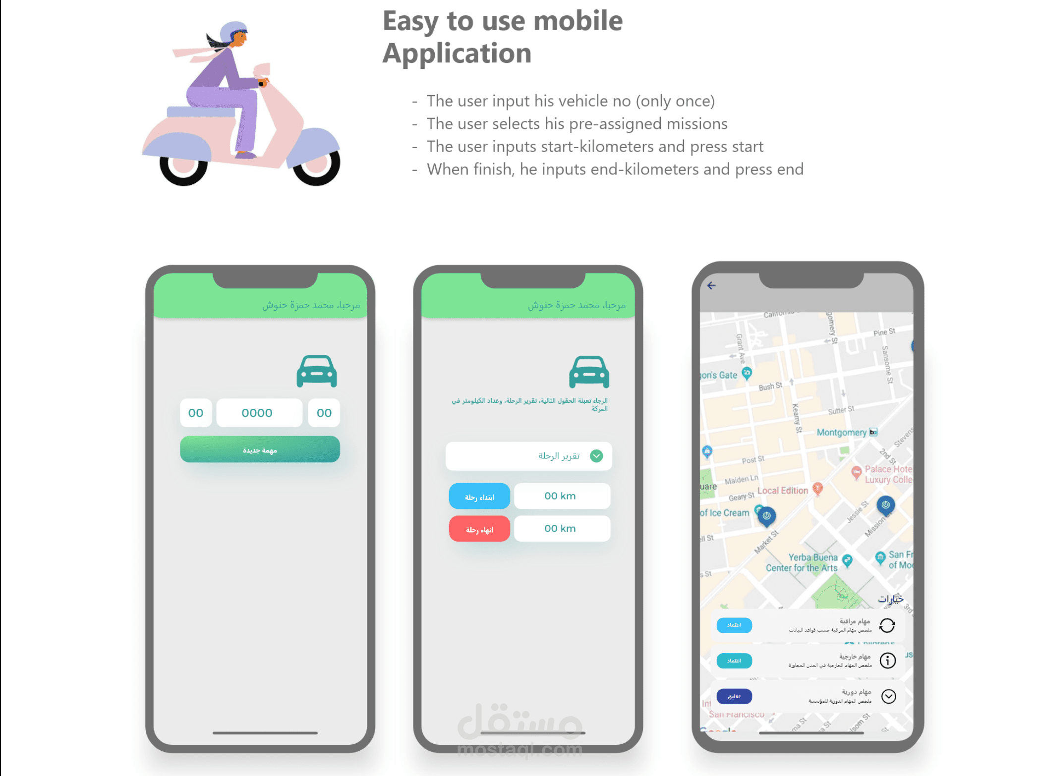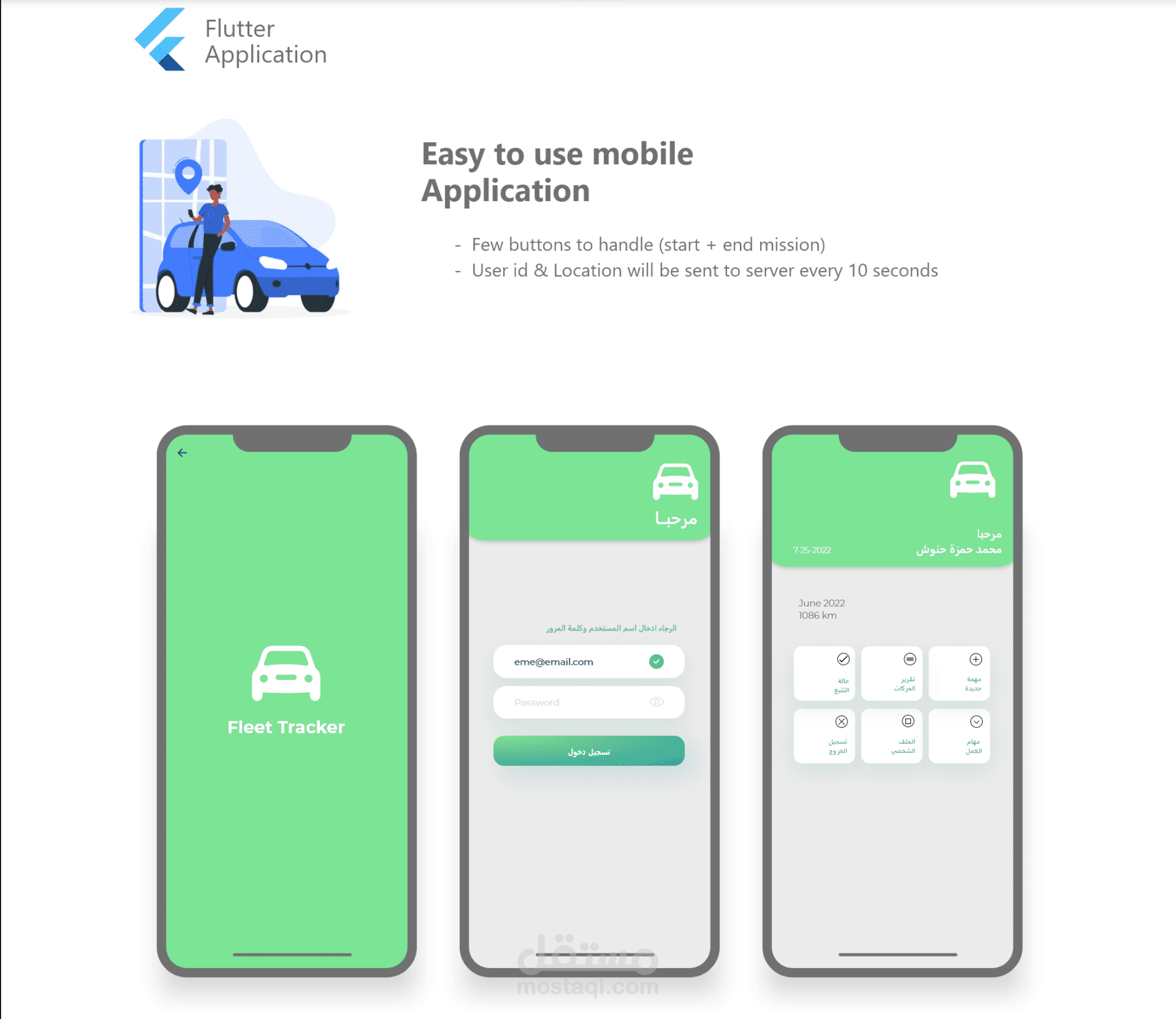 تم تطوير تطبيق بسيط وسهل الاستخدام يتيح للمستخدمين تتبع المركبات والمهام الموكلة إليهم. يتميز التطبيق بما يلي: