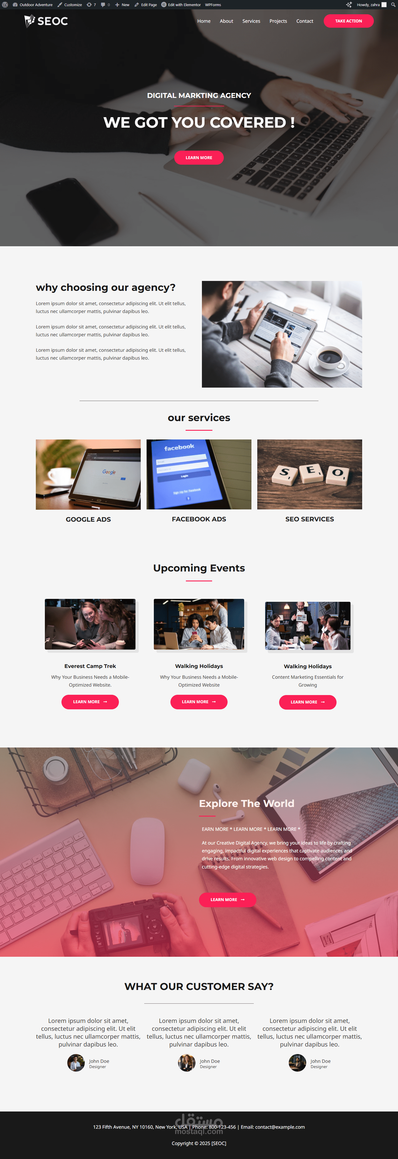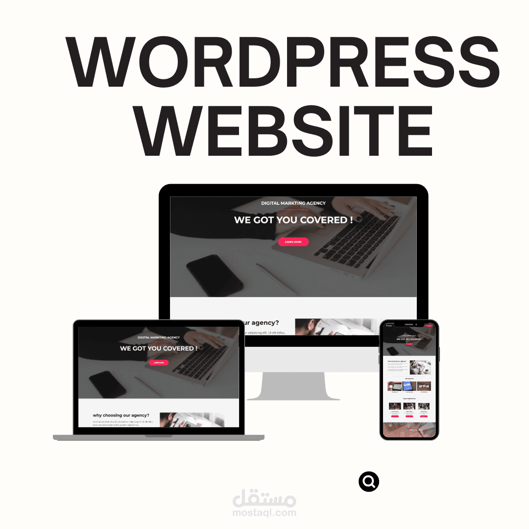 "تم تصميم وتطوير موقع إلكتروني احترافي للتسويق الرقمي باستخدام منصة ووردبريس، بهدف تقديم حلول تسويقية متكاملة للشركات والأفراد. الموقع يتميز بتصميم أنيق وعصري يعكس هوية العلامة التجارية، مع واجهة مستخدم (UI) جذابة وتجربة مستخدم (UX) سلسة لضمان تصفح مريح وسريع على جميع الأجهزة (Responsive Design).
