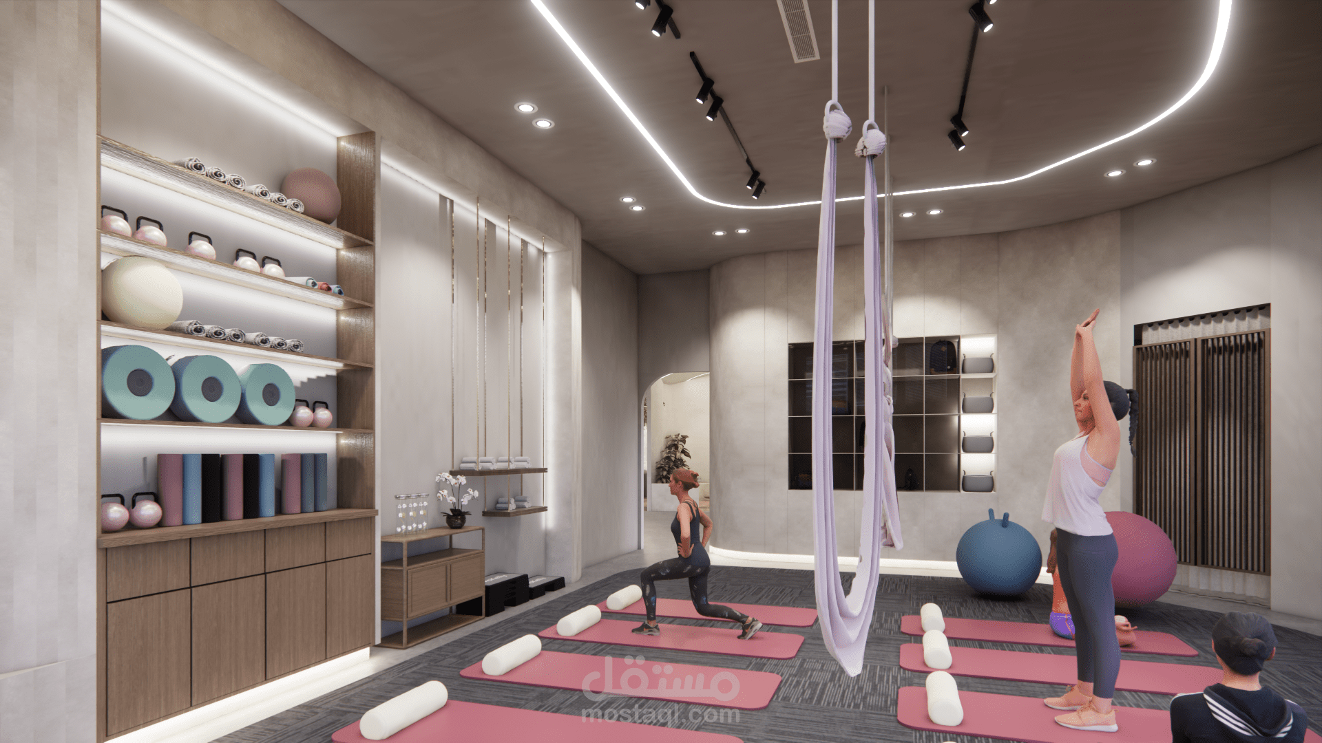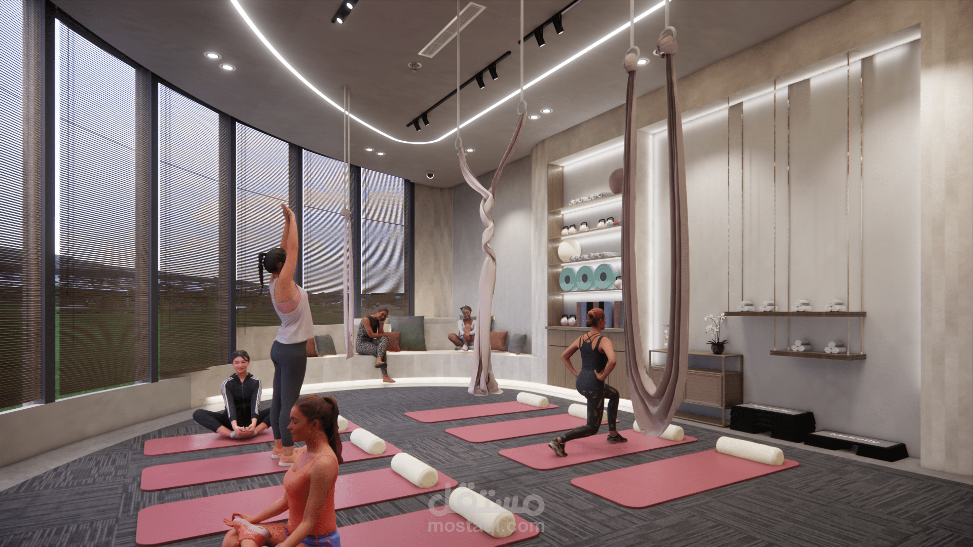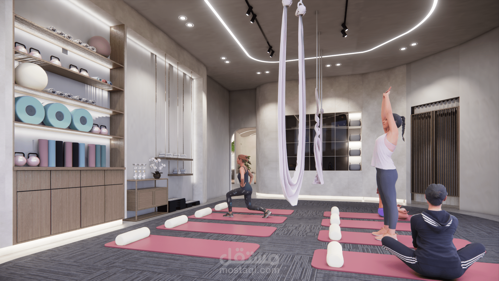 صالو يوجا بتصميم بسيط عصري مع توفير غرفة غيار داخلية