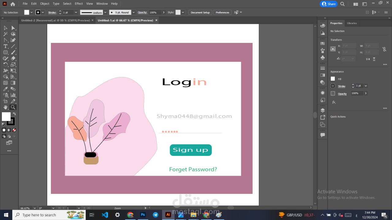 تصميم صفحة واجهة مستخدم (Login أو أي شاشة أخرى) مخصصة باستخدام برنامج Adobe Illustrator.