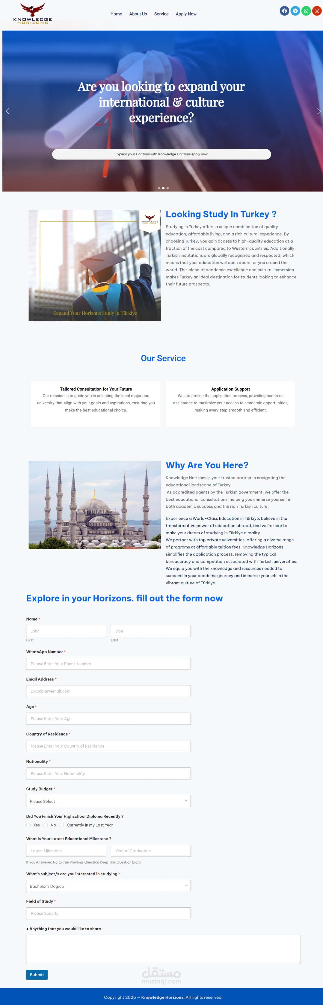 موقع "نولدج هورايزونز" هو وكالة استشارية تعليمية معتمدة من الحكومة التركية، متخصصة في مساعدة الطلاب الراغبين في الدراسة في تركيا. يقدم الموقع خدمات استشارية مخصصة لتوجيه الطلاب في اختيار التخصص والجامعة المناسبة، بالإضافة إلى دعمهم في عملية التقديم لتسهيل الوصول إلى الفرص الأكاديمية. يتعاون الموقع مع جامعات تركية خاصة رائدة، مما يتيح للطلاب الوصول إلى برامج متنوعة برسوم دراسية معقولة. يهدف "نولدج هورايزونز" إلى تزويد الطلاب بالمعرفة والموارد اللازمة للنجاح في رحلتهم الأكاديمية والانغماس في الثقافة التركية الغنية.