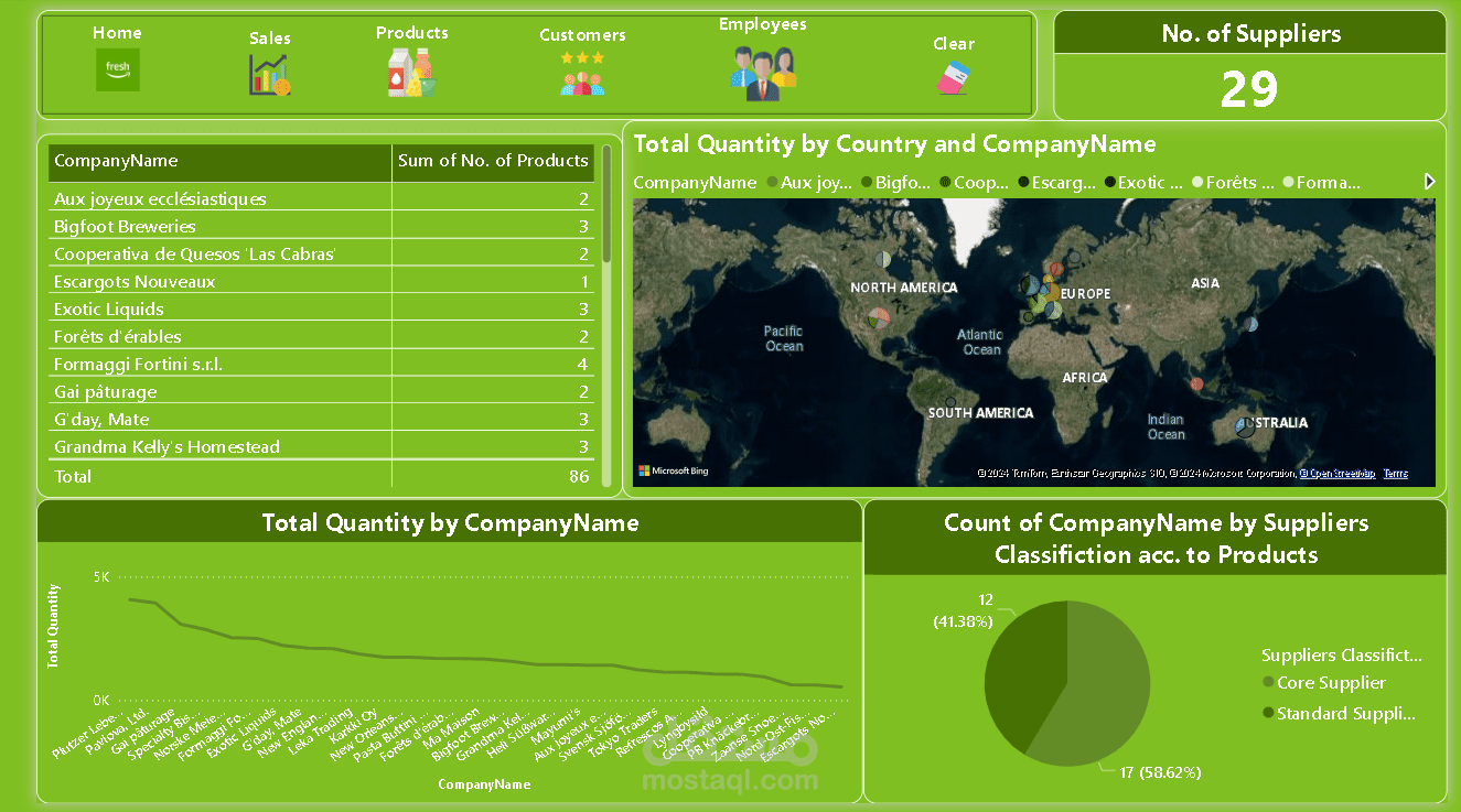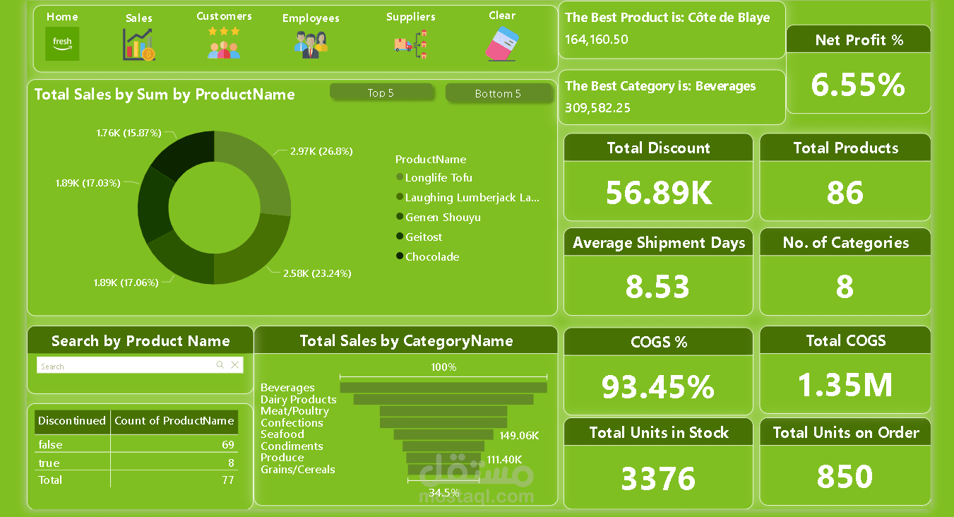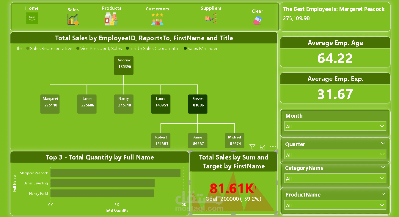 تم استخدام Power BI لتصميم لوحة بيانات تفاعلية احترافية لتقديم تحليل شامل لأداء المبيعات والمنتجات والموردين والموظفين والعملاء.
