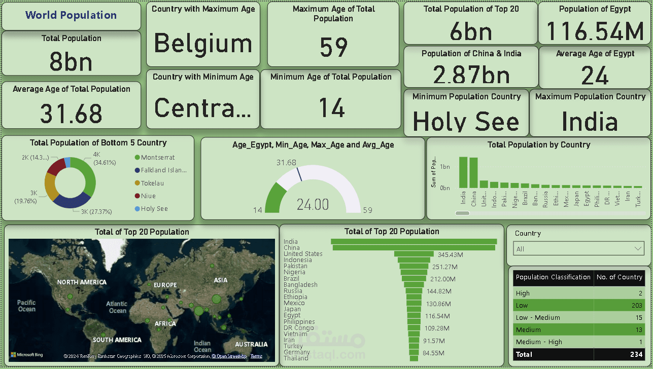 تم استخدام Power BI لاصميم لوحة بيانات تفاعلية احترافية لتقديم تحليل شامل عن سكان العالم.