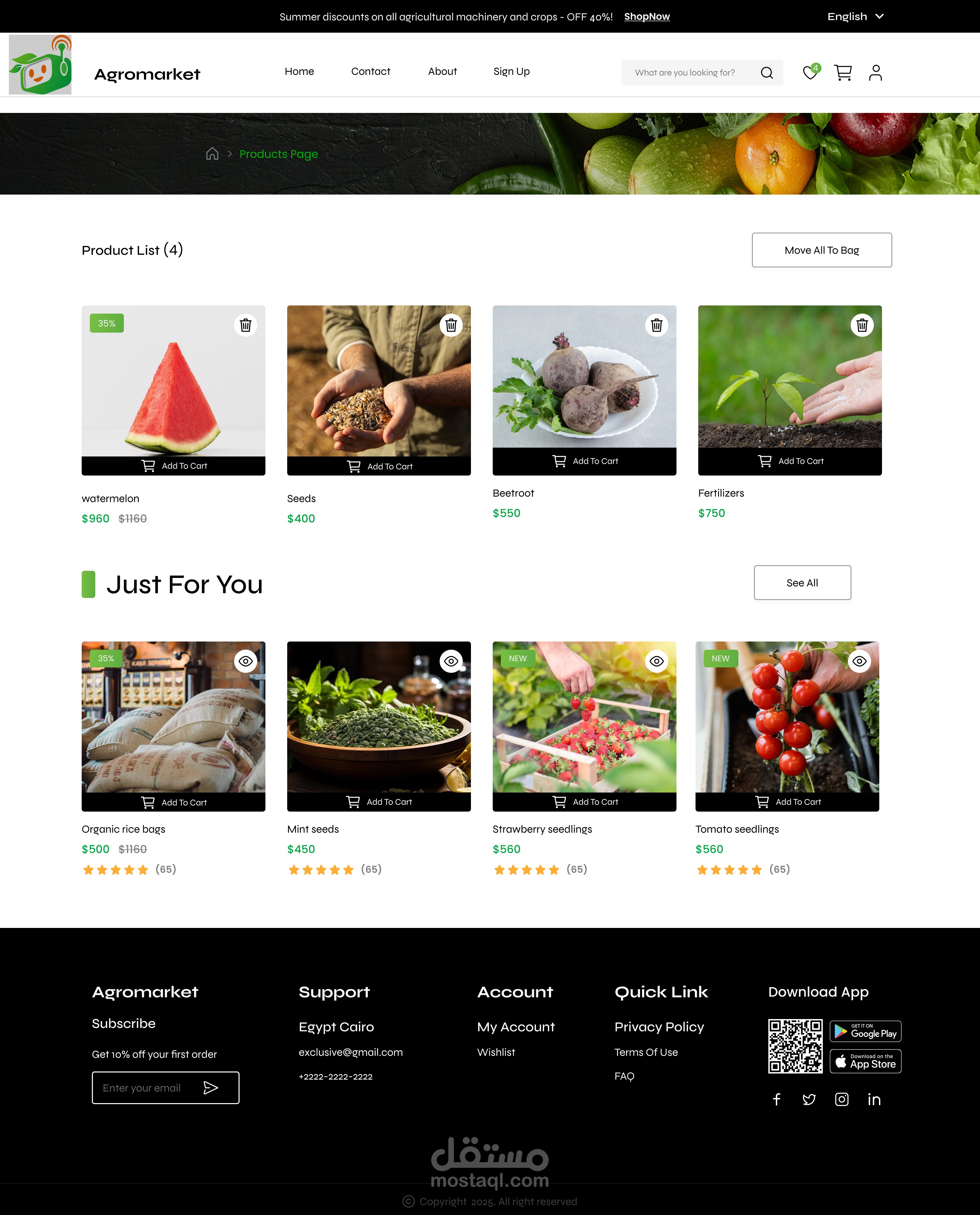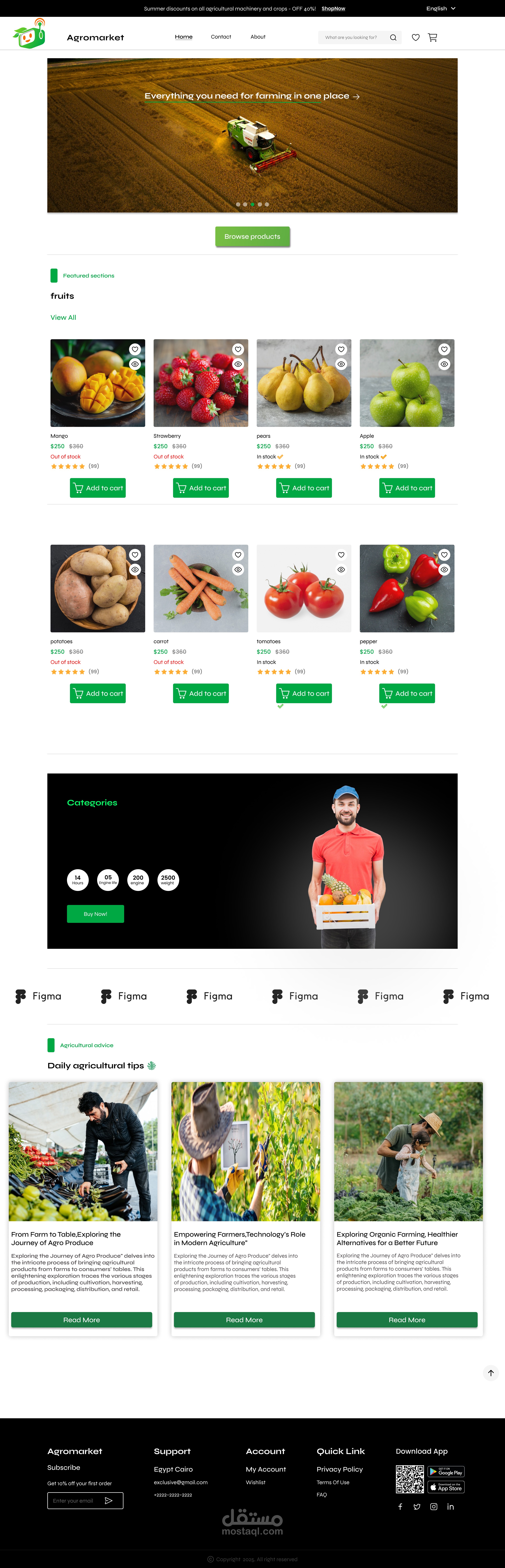 هذا المشروع عبارة عن تصميم واجهات مستخدم (UI/UX) لموقع Agromarket المتخصص في بيع الأسمدة والآلات الزراعية والمنتجات الزراعية.