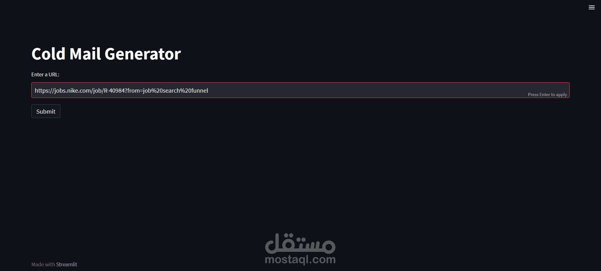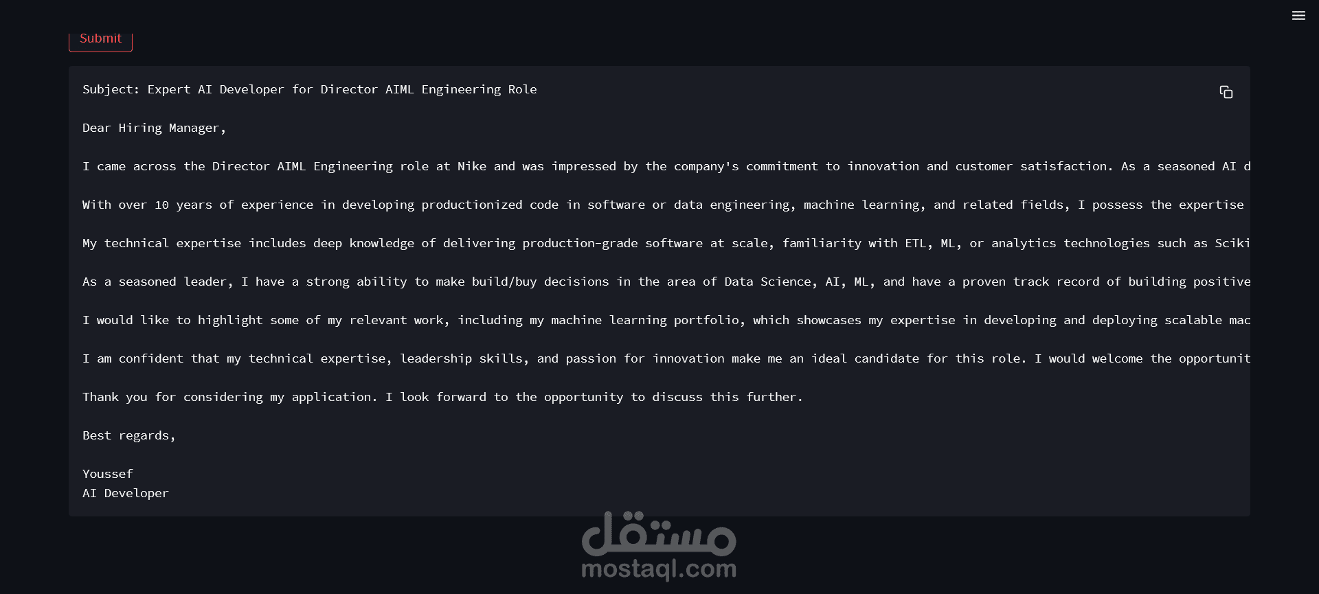 تم إنشاء أداة ذكاء اصطناعي عبر الويب لتوليد رسائل بريد إلكتروني احترافية وشخصية موجهة، من خلال تحليل وصف الوظائف. يقوم التطبيق باستخلاص إعلانات الوظائف واستخراج التفاصيل الرئيسية مثل المهارات المطلوبة، ومطابقتها مع أمثلة من الملف الشخصي باستخدام FAISS. بالاعتماد على LangChain وChatGroq LLM، تصيغ الأداة رسائل بريد إلكتروني مخصصة تساعد العملاء على توفير الوقت وزيادة فعالية تواصلهم.