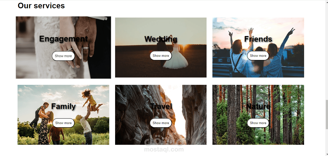 يستخدم شبكة منظمة لعرض الصور بشكل جميل ومتناسق. عند تمرير الفأرة فوق الصور، تظهر حركة بسيطة (مثل تكبير الصورة قليلاً).