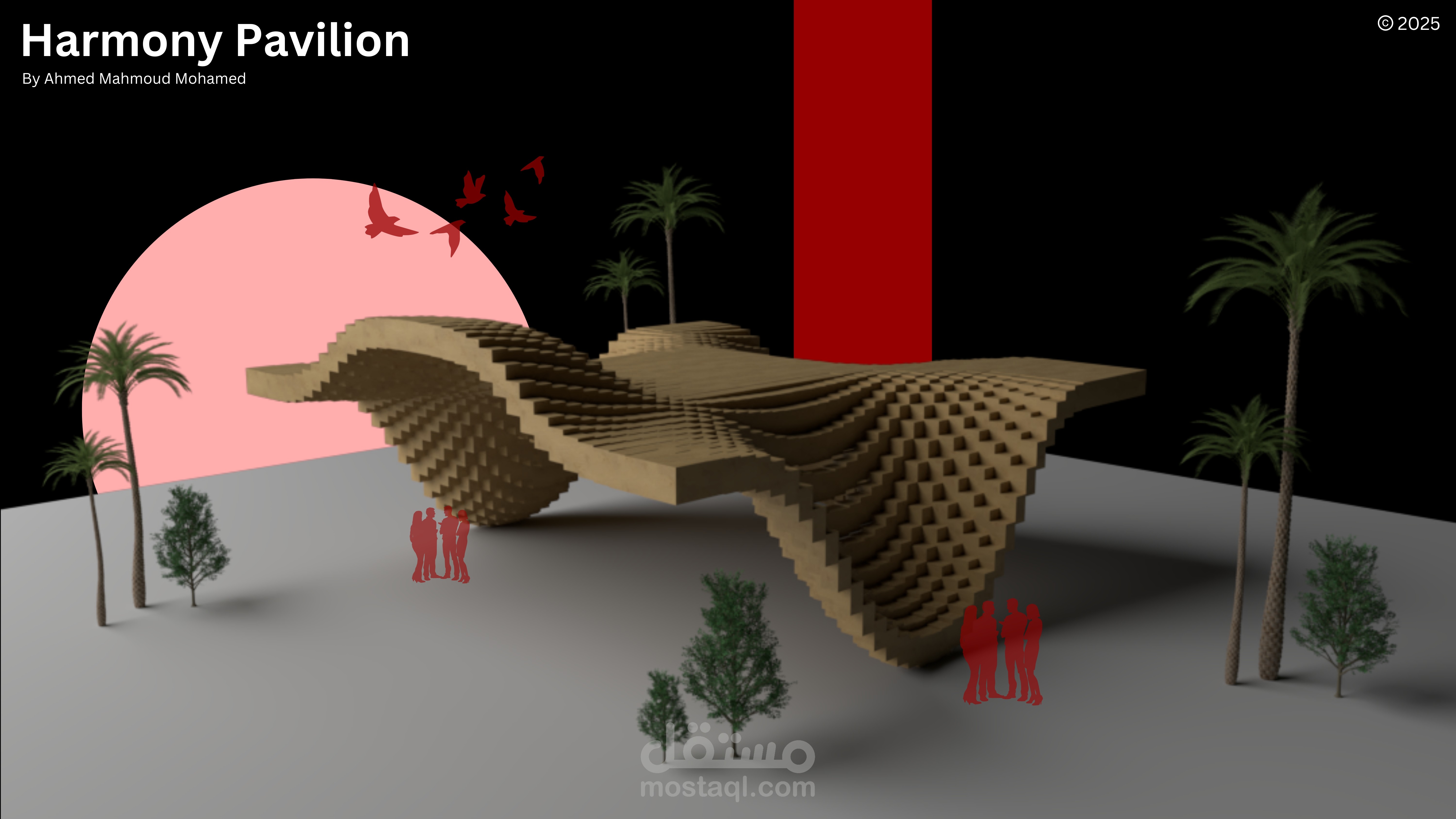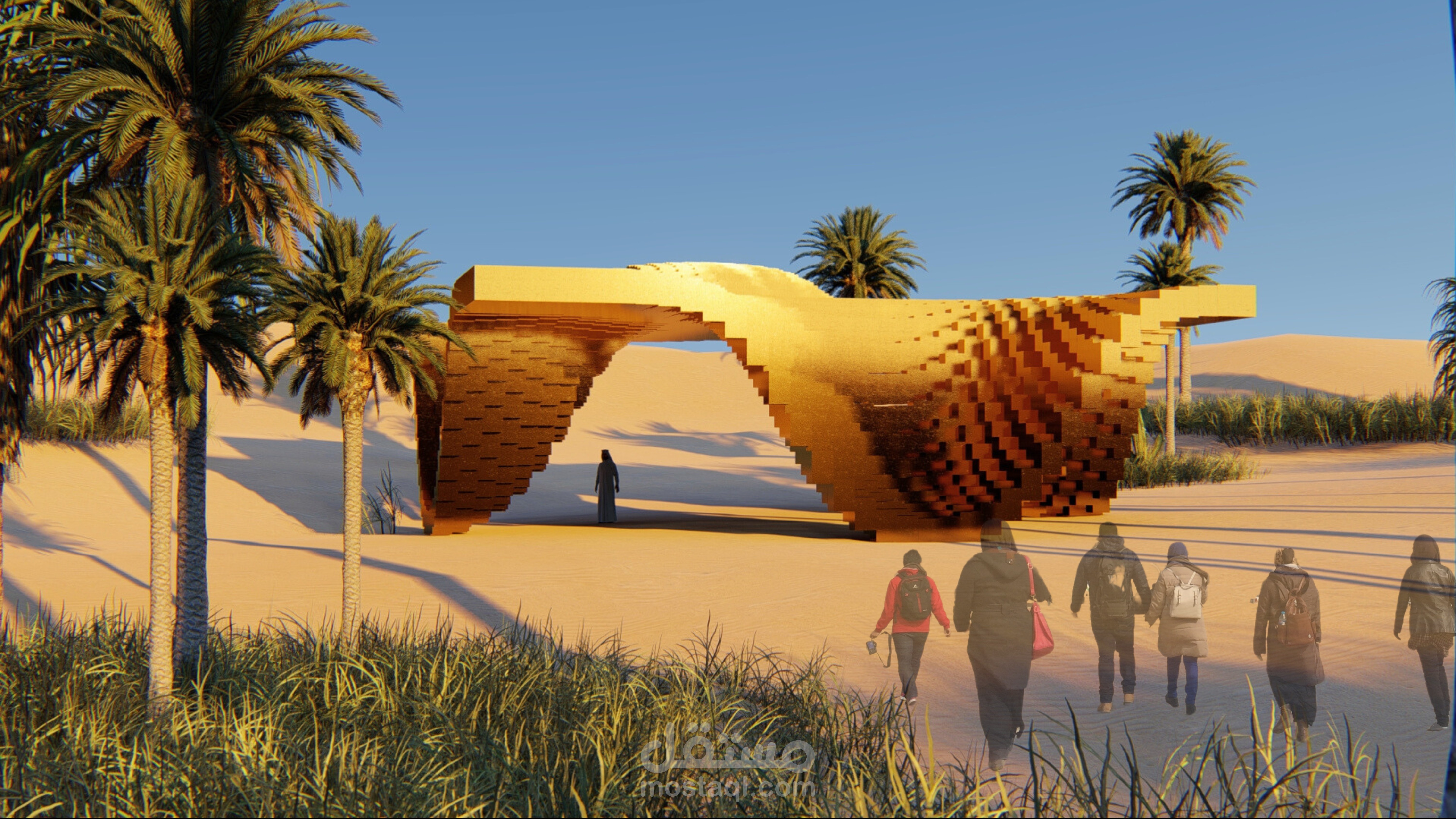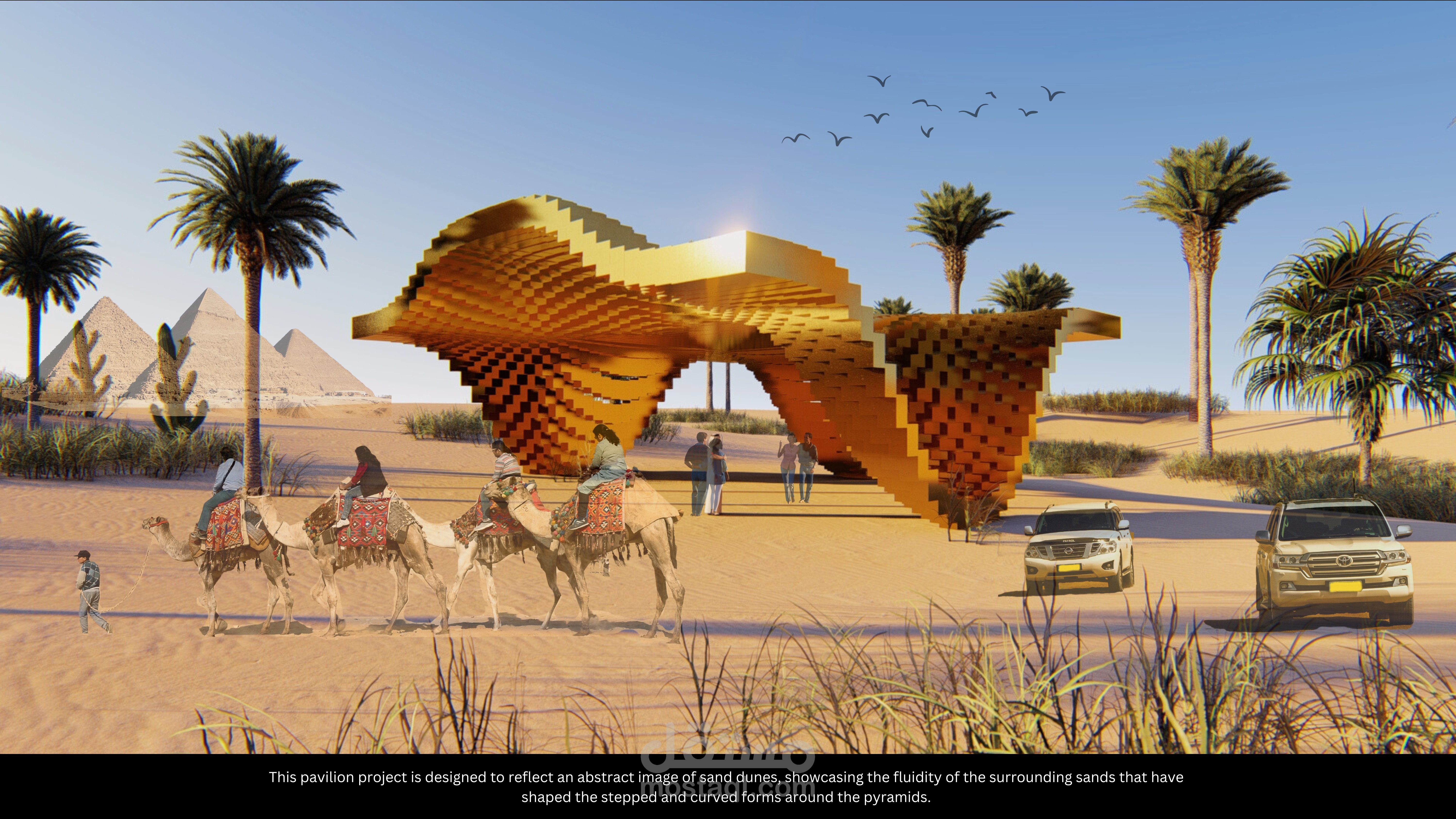 Harmony pavilion project is designed to reflect an abstract image of sand dunes, showcasing the fluidity of the surrounding sands that have shaped the stepped and curved forms around the pyramids.