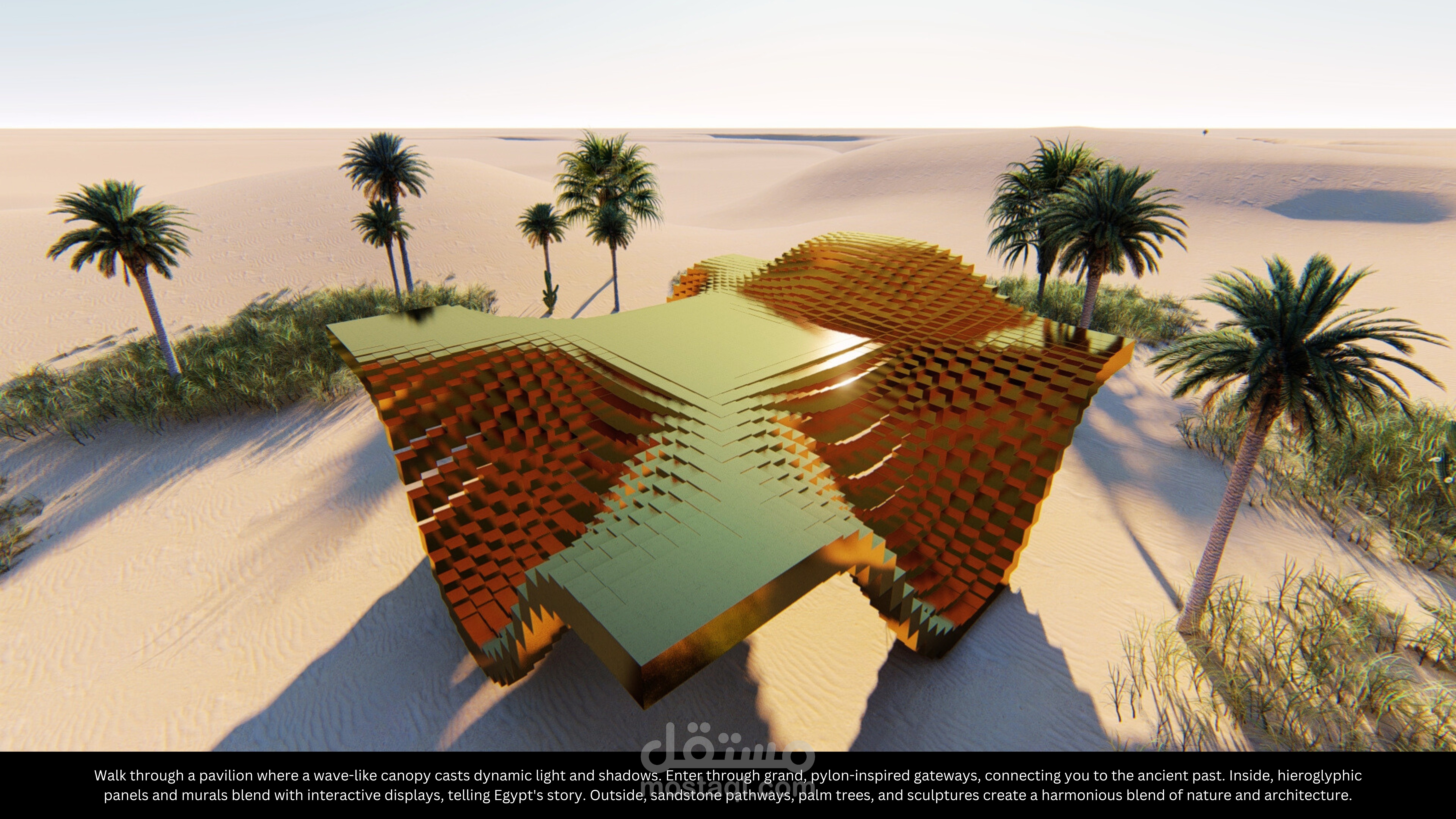 Walk through a pavilion where a wave-like canopy casts dynamic light and shadows. Enter through grand, pylon-inspired gateways, connecting you to the ancient past. Inside, hieroglyphic panels and murals blend with interactive displays, telling Egypt's story. Outside, sandstone pathways, palm trees, and sculptures create a harmonious blend of nature and architecture.