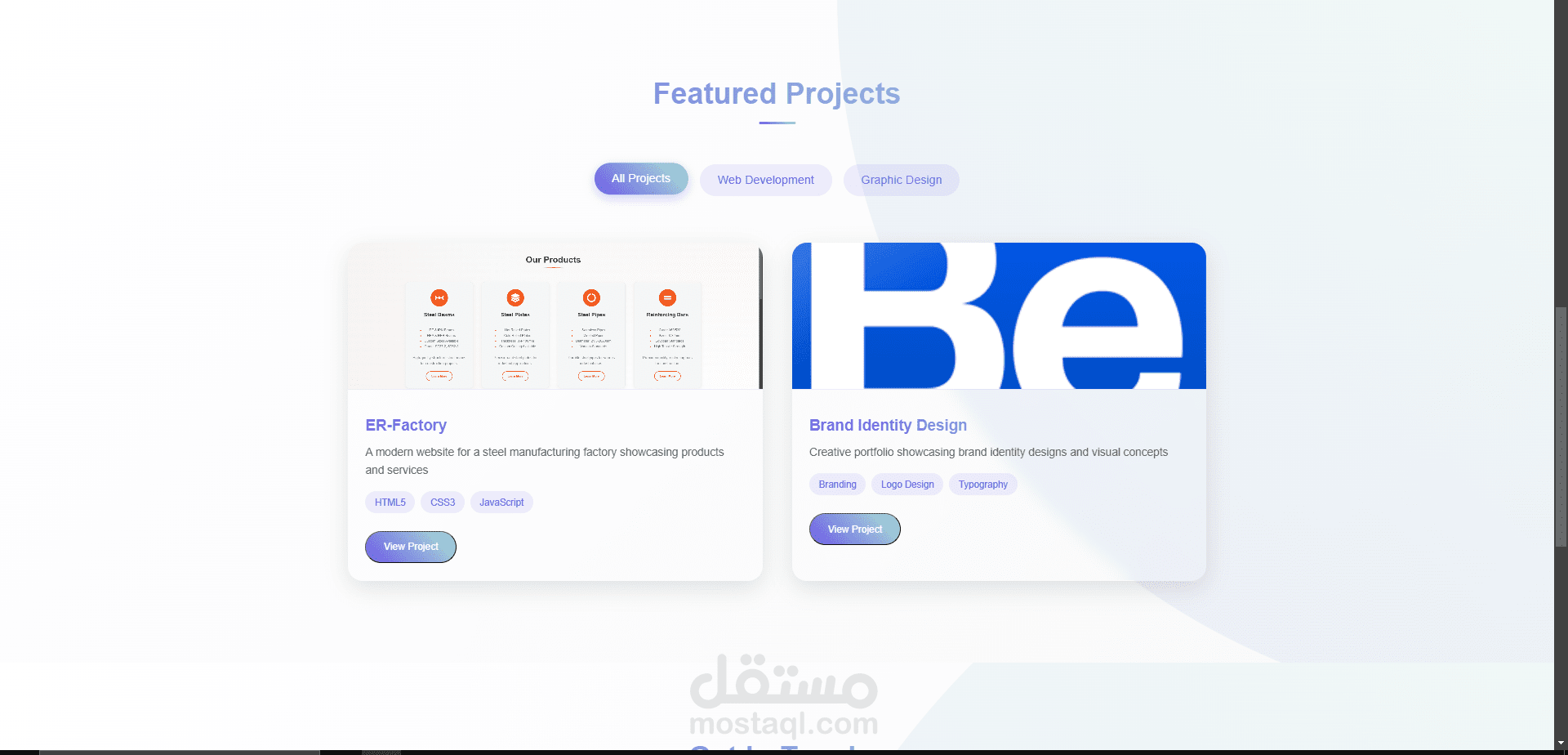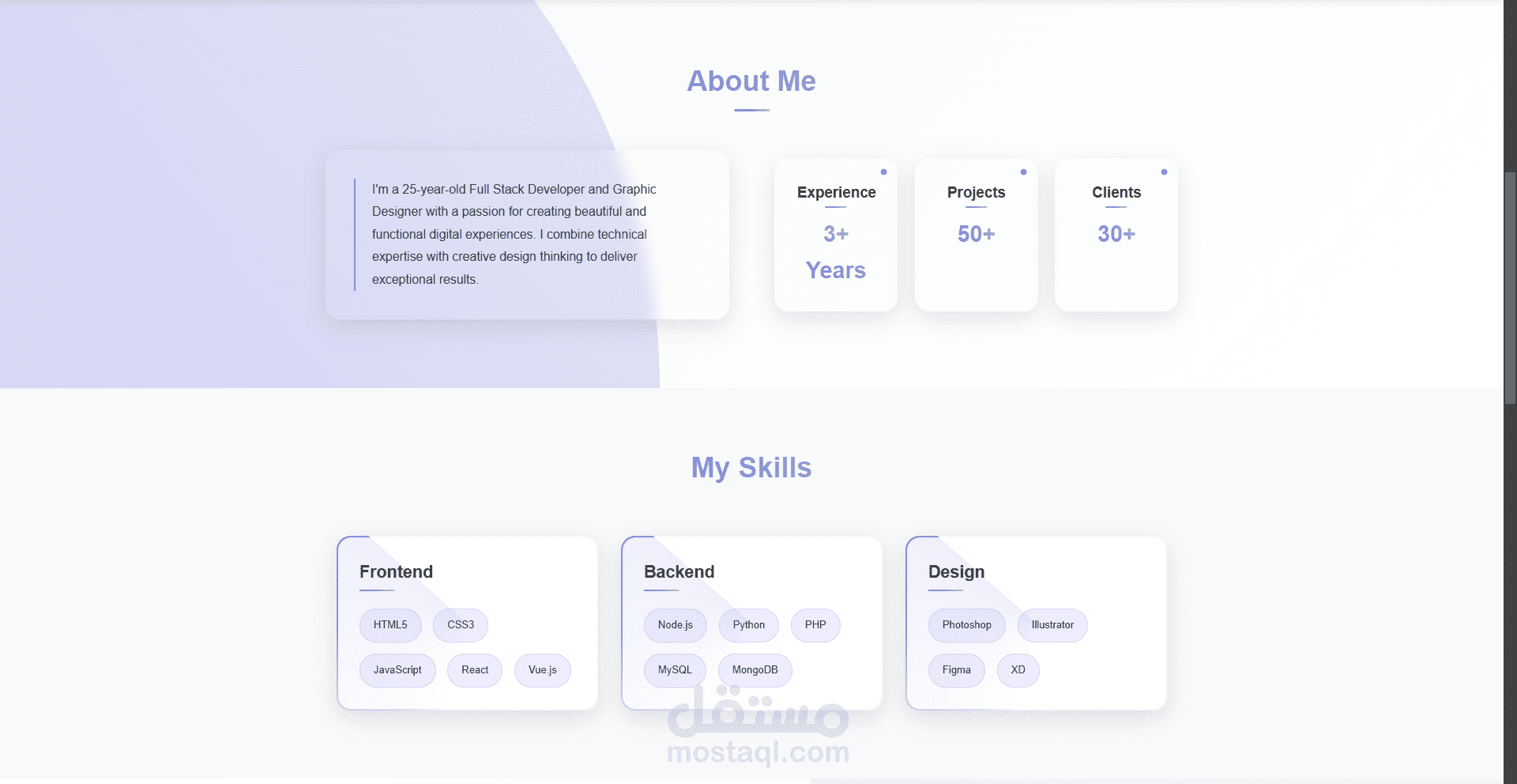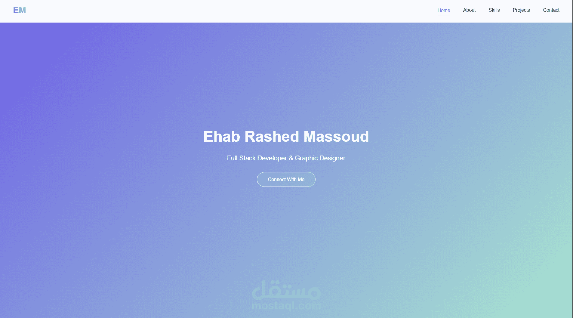 The portfolio site of Ehab Rashed Massoud showcases his skills as a Full Stack Developer and Graphic Designer. It highlights expertise in front-end technologies (HTML5, CSS3, JavaScript, React), back-end tools (Node.js, Python, PHP), and design software (Photoshop, Figma). The site includes a professional summary, featured projects, and contact options, emphasizing over 3 years of experience, 50+ projects completed, and a global client base.