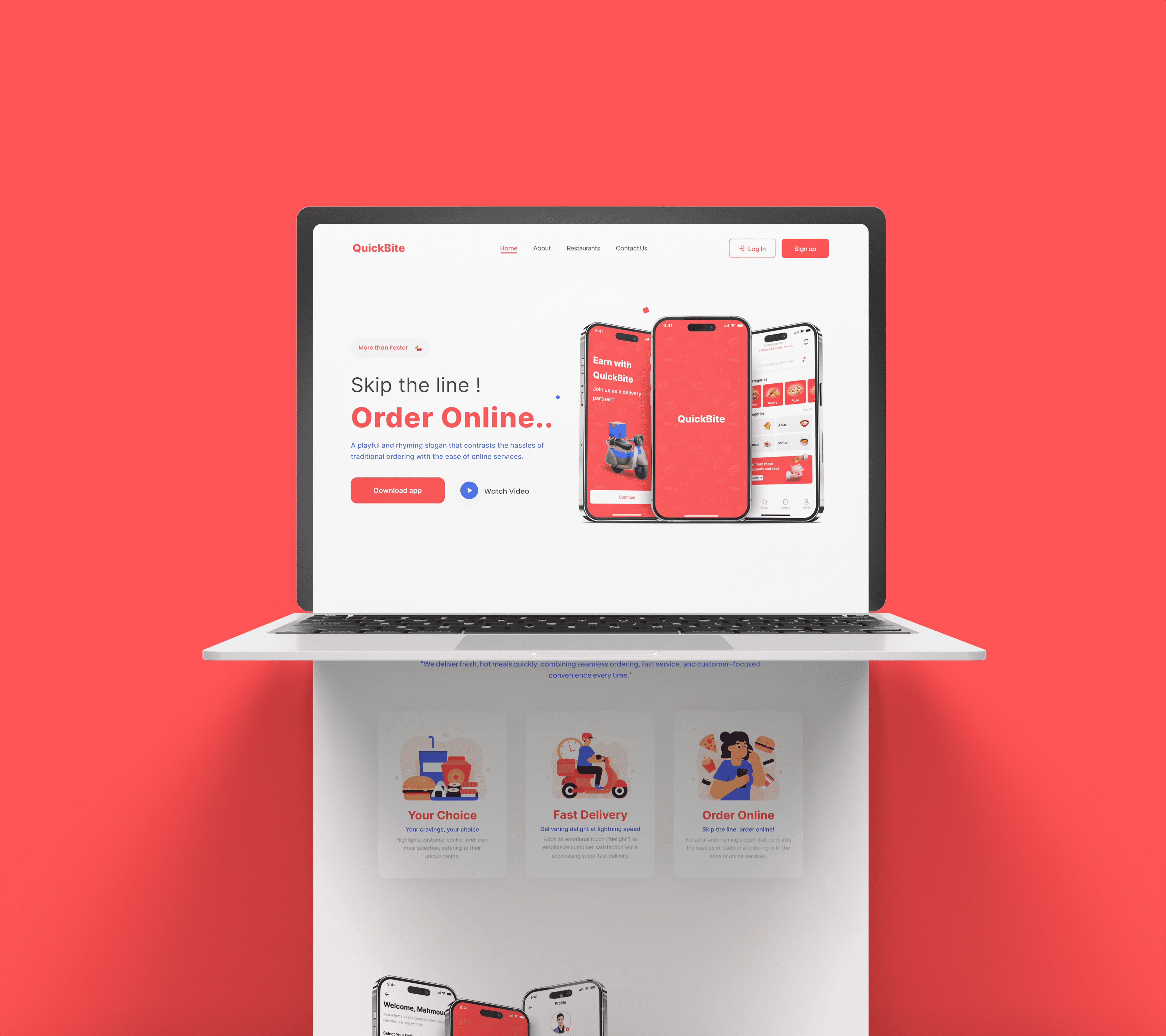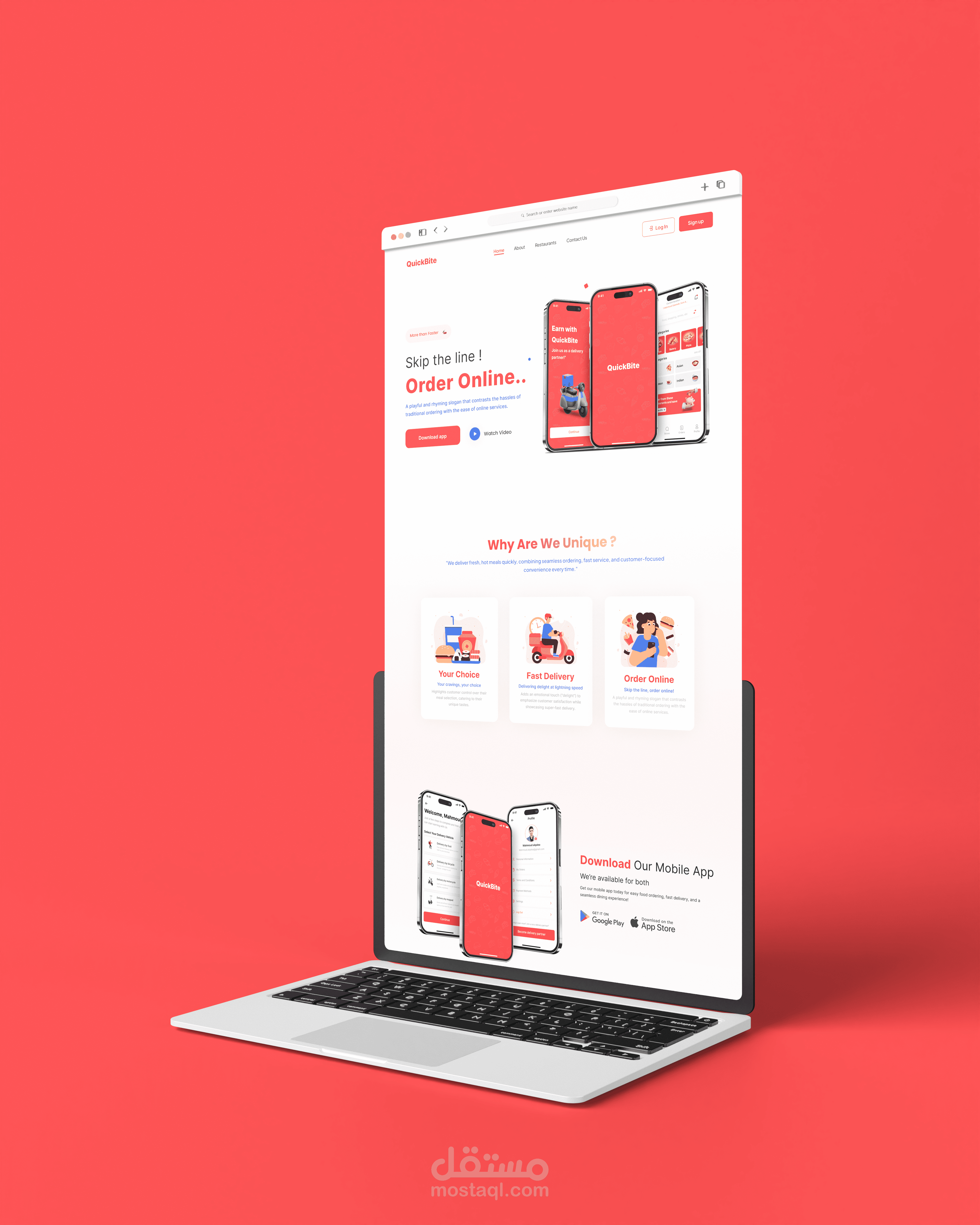 "تصميم صفحة هبوط لتطبيق توصيل الطعام، تشمل معلومات عن التطبيق ومميزاته."