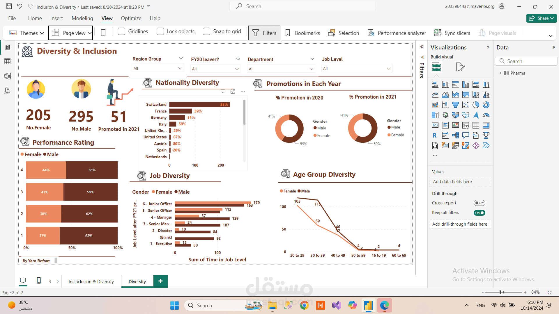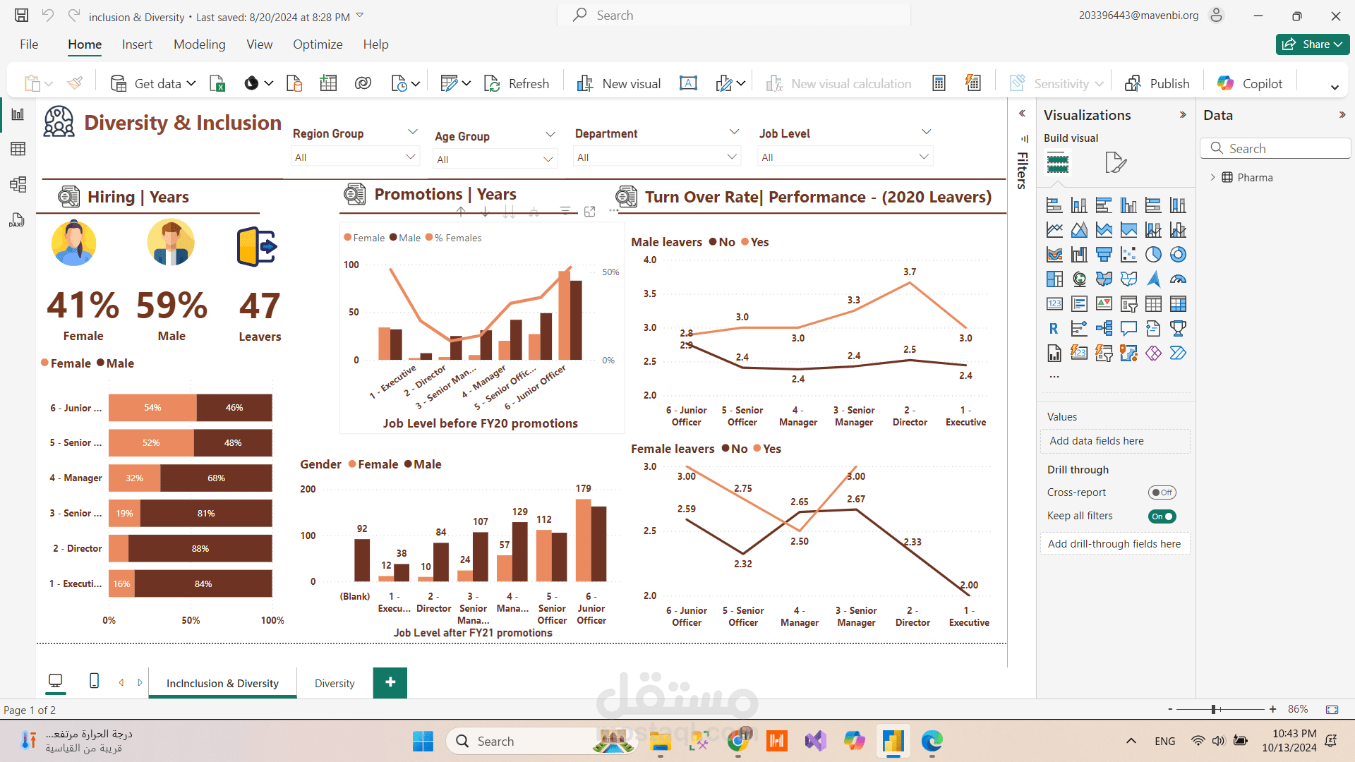 تم تصميم لوحات معلومات تفاعلية باستخدام Power BI لتحليل التنوع الوظيفي والشمولية داخل الشركة. يتناول المشروع عدة محاور رئيسية تساعد في فهم ديناميكية التنوع في مكان العمل، منها: