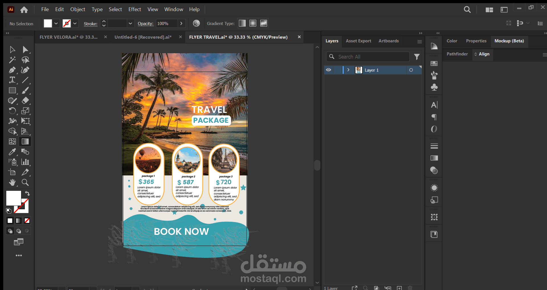 التصميم الأول: ركزت فيه على إبراز الوجهات السياحية الشهيرة التي تقدمها الشركة، مع استخدام ألوان العلامة التجارية (الأزرق، البرتقالي، والأصفر الذهبي) لإضفاء شعور بالحيوية والمغامرة.
