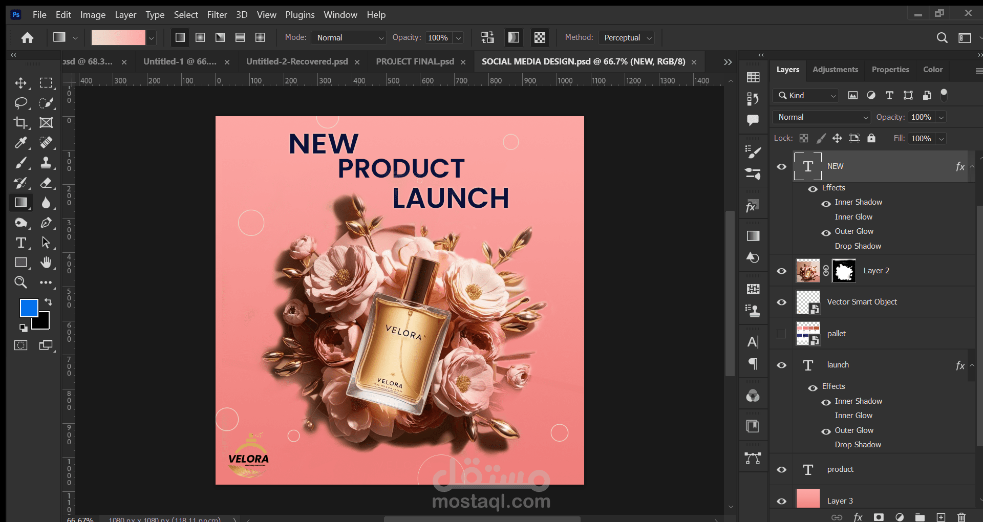 قمت بتصميم ثلاثة بوستات لعلامة Velora، تركّز بشكل رئيسي على إظهار المنتج والإعلان عن منتج جديد. هذه البوستات تهدف إلى جذب الانتباه وزيادة الوعي بالمنتج الجديد بطريقة مميزة تعكس هوية العلامة التجارية وتلامس ذوق الجمهور المستهدف.