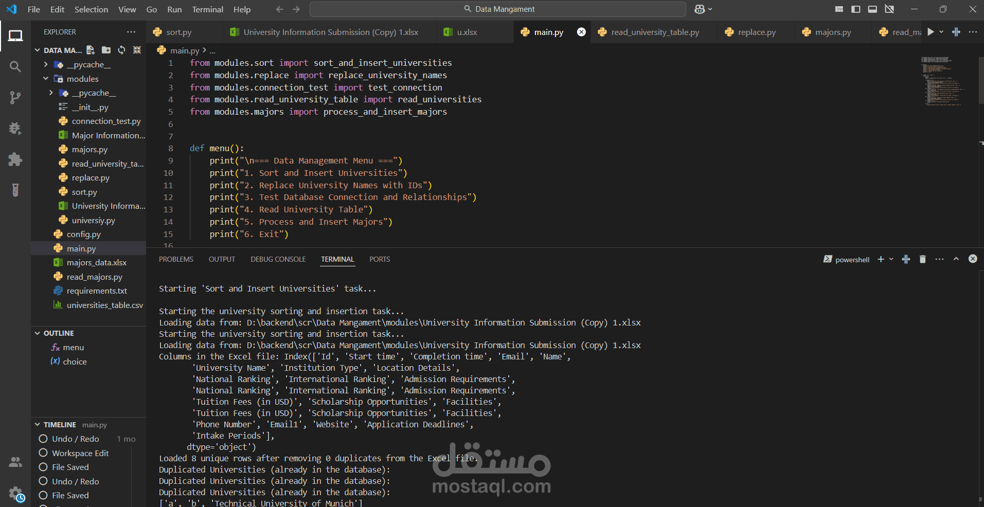 This project is a Python-based data management system that processes and integrates university and major data into a PostgreSQL database. It ensures data validation, removes duplicates, and establishes relationships between universities and their associated majors. The system features an interactive console menu for sorting, inserting, and testing database operations efficiently.