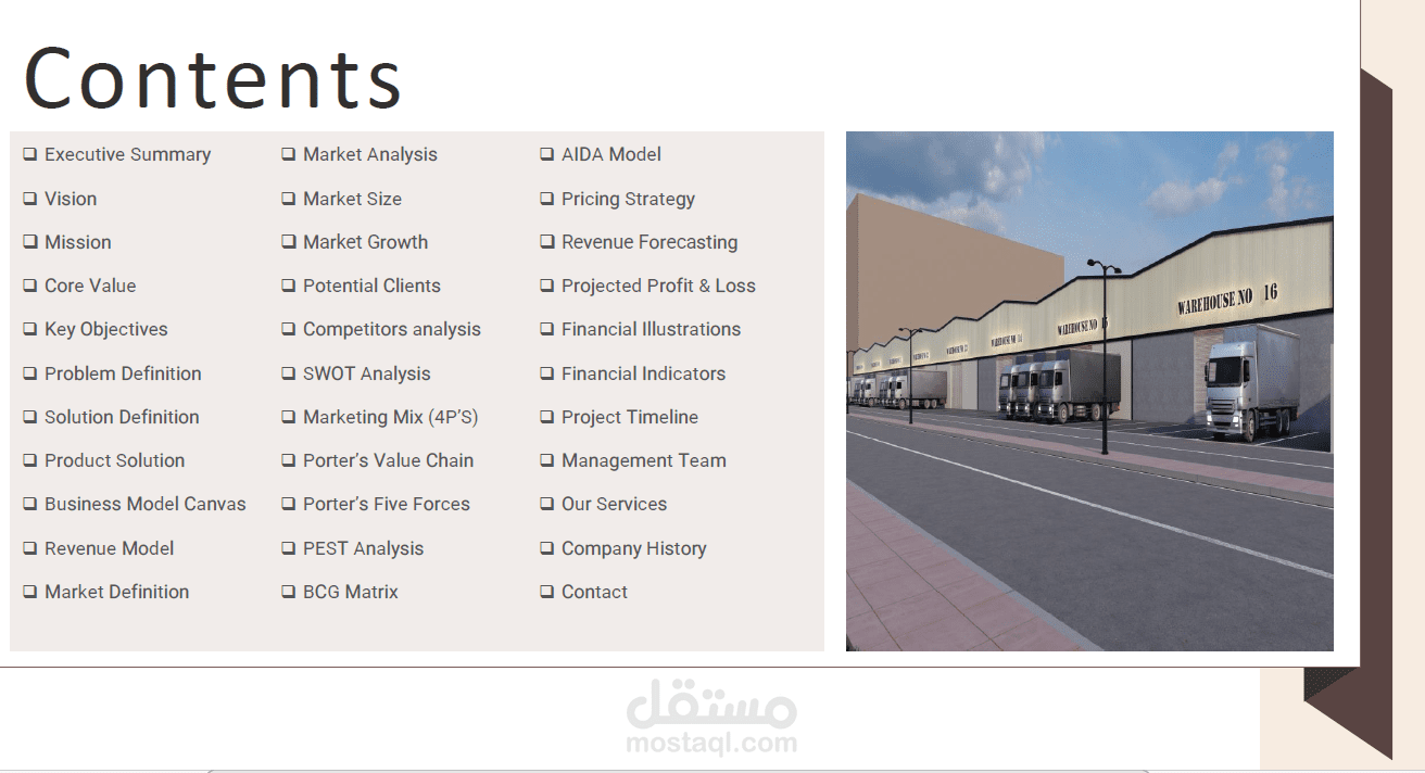 Business Plan to develop a world-class, fully integrated industrial and commercial space in Al Dammam, offering high-quality warehouses, showrooms, and office spaces that cater to the growing needs of logistics, trade, and business services.