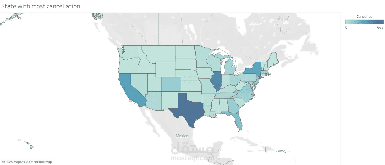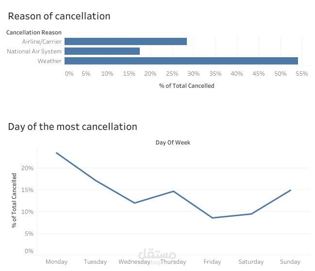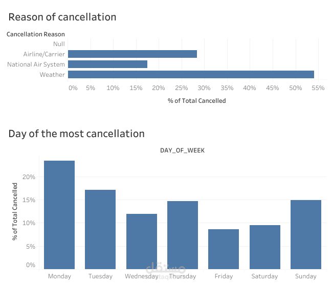 كانت المهمة الرئيسية هي التحقيق في السبب الرئيسي للإلغاء مواعيد الطيران، ومن بين النتائج التي توصلنا إليها أن السبب الرئيسي هو "الطقس" بنسبة 54% تقريبًا من عمليات الإلغاء. كما يمكننا أن نرى أن أكثر من 20% من عمليات الإلغاء حدثت يوم "الاثنين". وتم ذلك بعد تجهيز البيانات وتحليلها ثم عرضها.