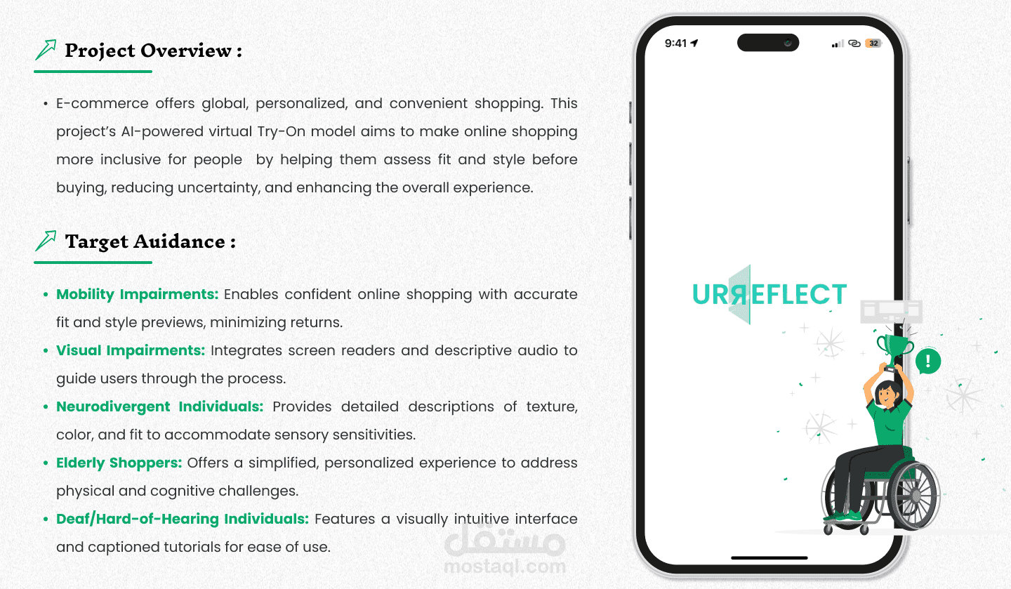 قمتُ بتصميم تطبيق UReflect، وهو تطبيق يهدف إلى مساعدة الأشخاص ذوي الإعاقة على اختيار الملابس المناسبة لهم بسهولة من خلال واجهة مستخدم مريحة وشاملة.