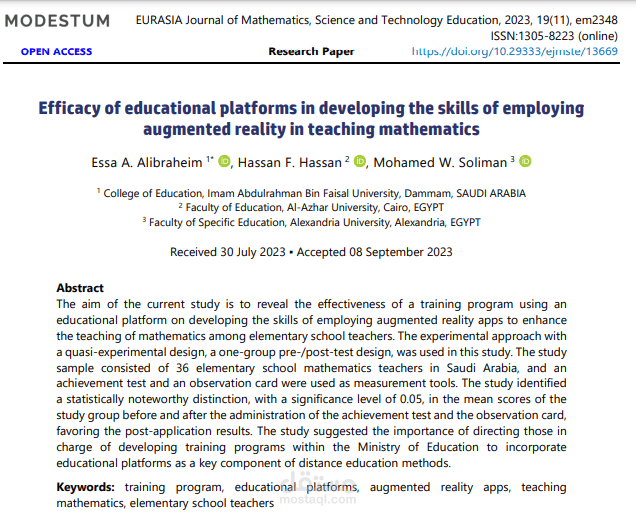 The aim of the current study is to reveal the effectiveness of a training program using an educational platform on developing the skills of employing augmented reality apps to enhance the teaching of mathematics among elementary school teachers. The experimental approach with a quasi-experimental design, a one-group pre-/post-test design, was used in this study. The study sample consisted of 36 elementary school mathematics teachers in Saudi Arabia, and an achievement test and an observation card were used as measurement tools. The study identified a statistically noteworthy distinction, with a significance level of 0.05, in the mean scores of the study group before and after the administration of the achievement test and the observation card, favoring the post-application results. The study suggested the importance of directing those in charge of developing training programs within the Ministry of Education to incorporate educational platforms as a key component of distance education methods.