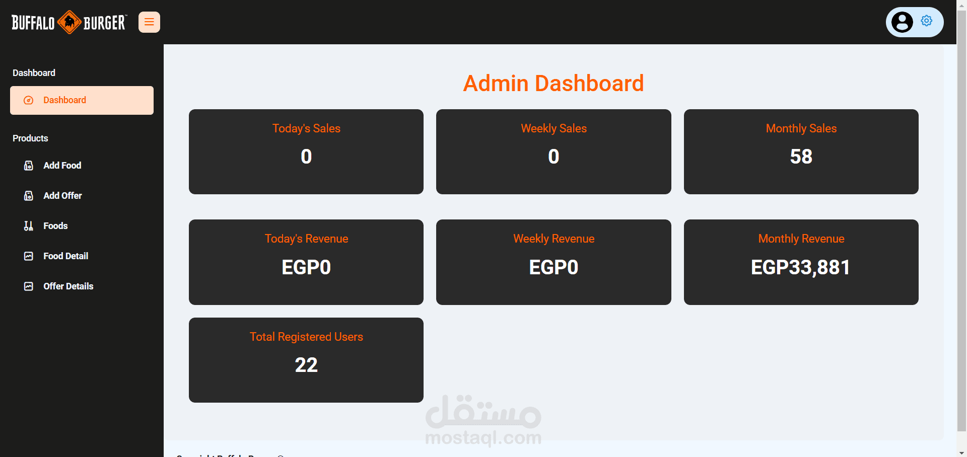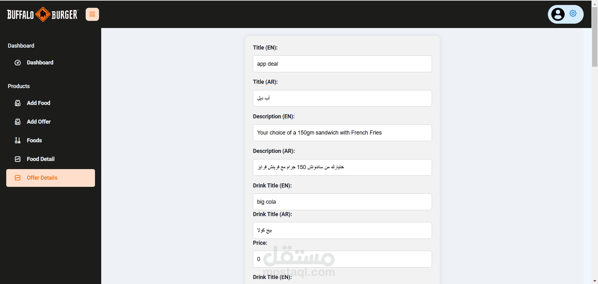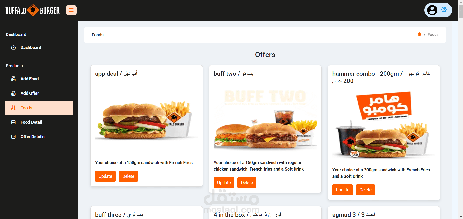 لوحة تحكم لموقع buffalo burger لاضافة المنتجات وحذف والتعديل عليها واضافة العروض