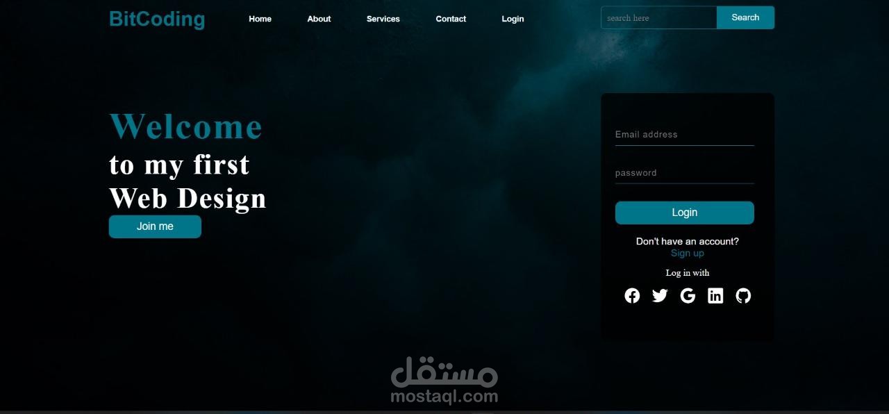 هيدر يحتوي على شعار "BitCoding"، شريط تنقل، وشريط بحث.