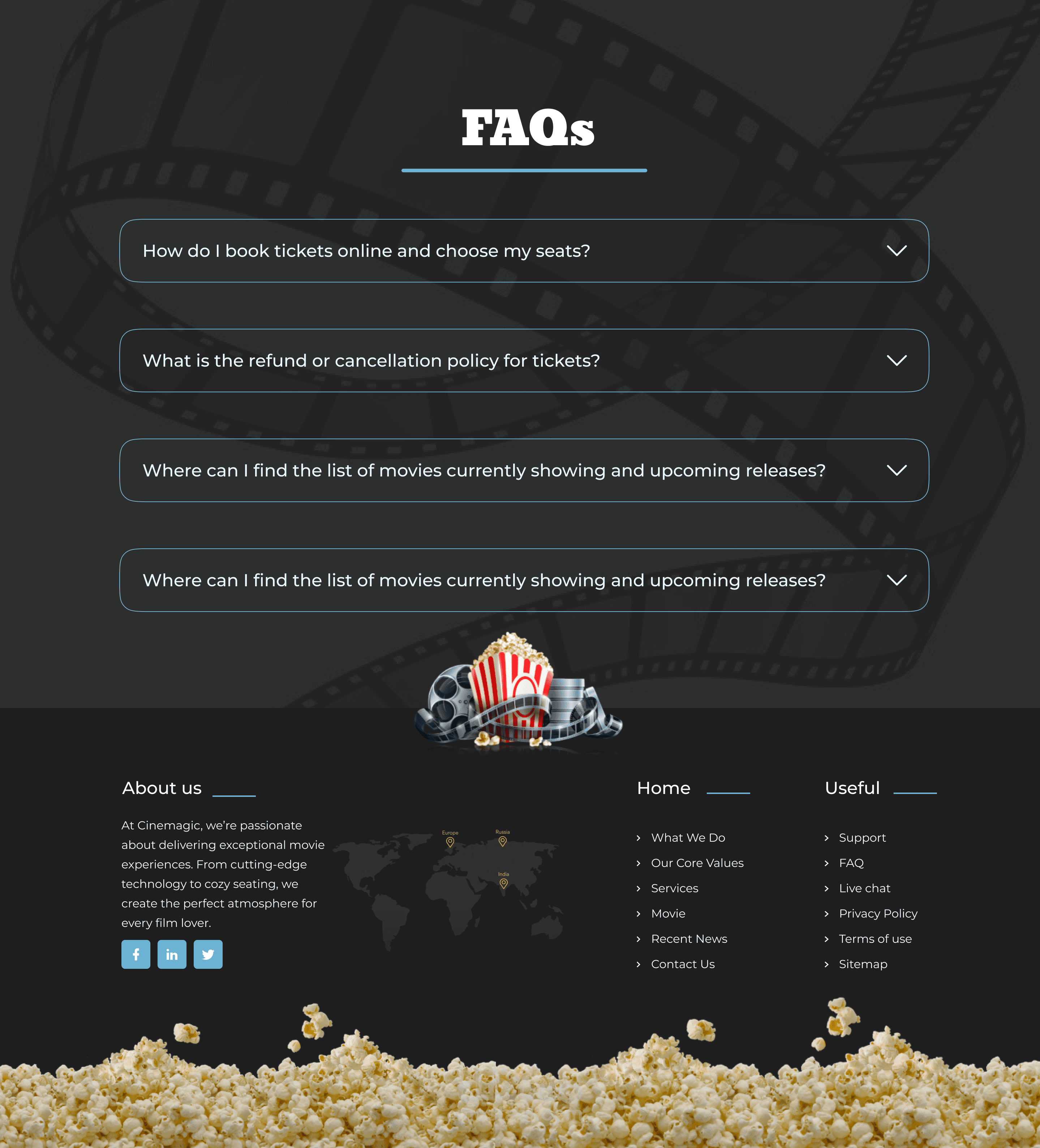 صفحة الهبوط التي قمت بتصميمها تأخذك في رحلة مصممة خصيصًا لتبرز جمال وروح السينما. تبدأ الصفحة بمقدمة تجذب الأنظار مع ألوان نابضة بالحياة وصور تأسر الخيال، ثم تنقلك بسلاسة إلى أقسامها المختلفة. ستجد فئات الأفلام مصنفة بدقة لتناسب كافة الأذواق، بينما قسم الميزات يأخذك خلف الكواليس ليعرض لك تفاصيل مثل المقاعد الفاخرة والتجهيزات الصوتية المذهلة التي تجعل كل عرض تجربة استثنائية.