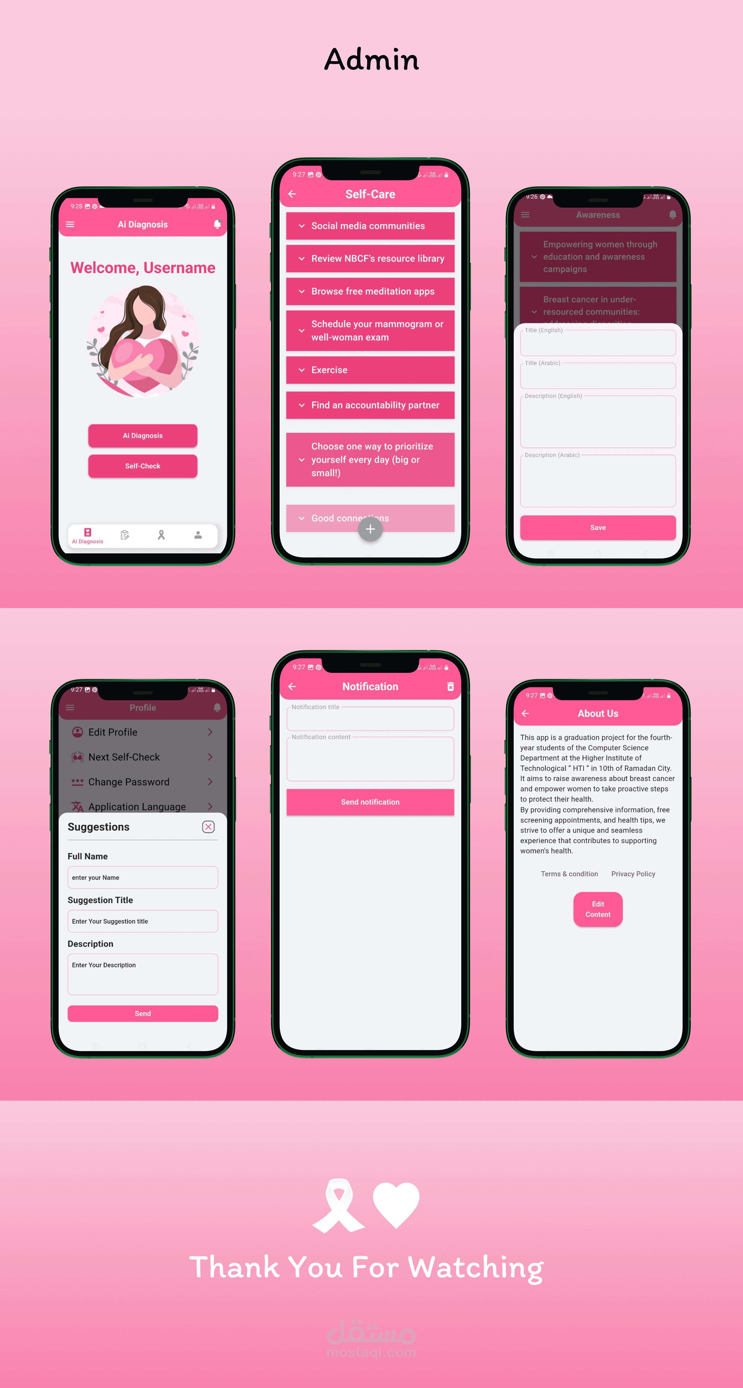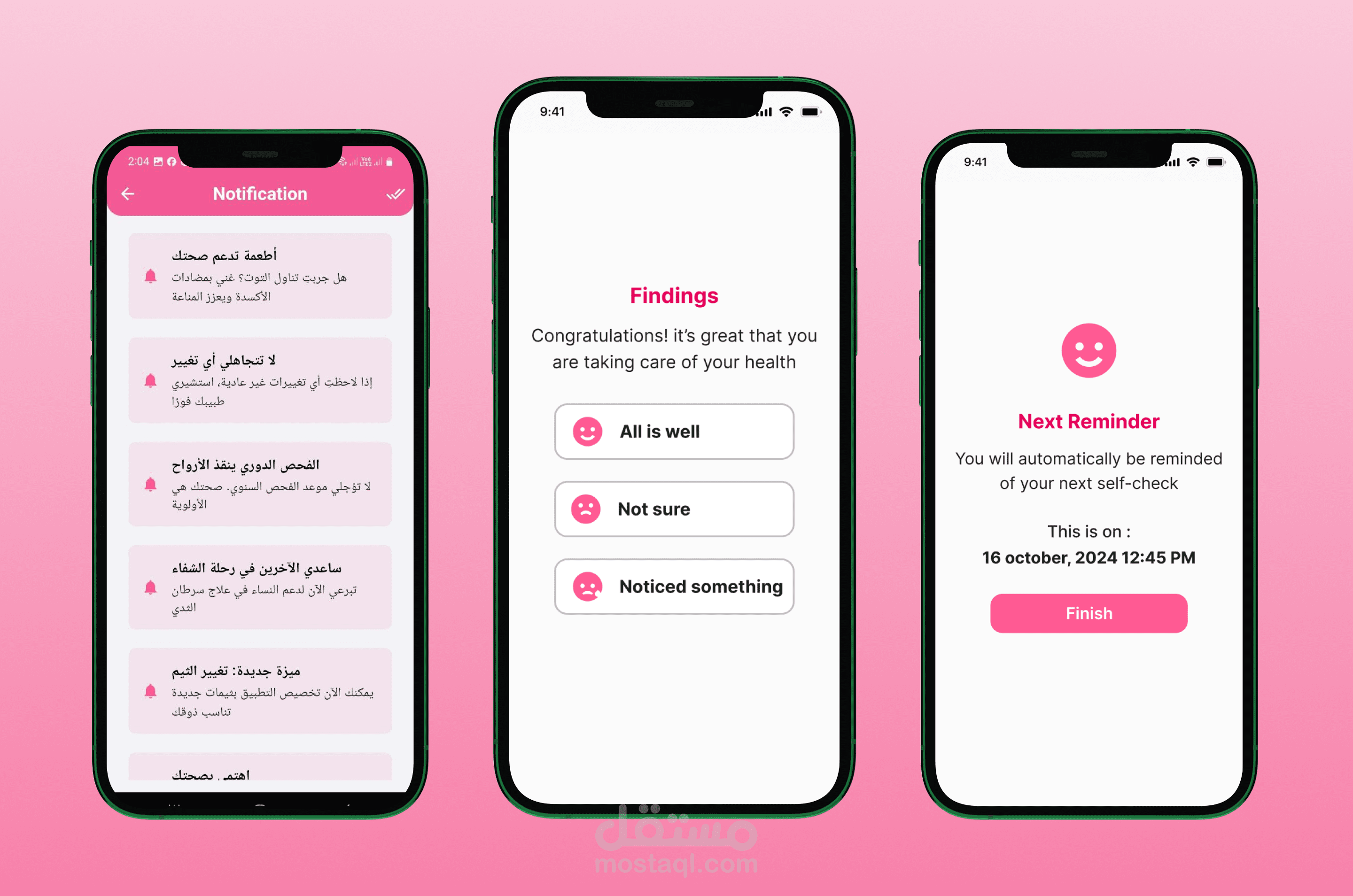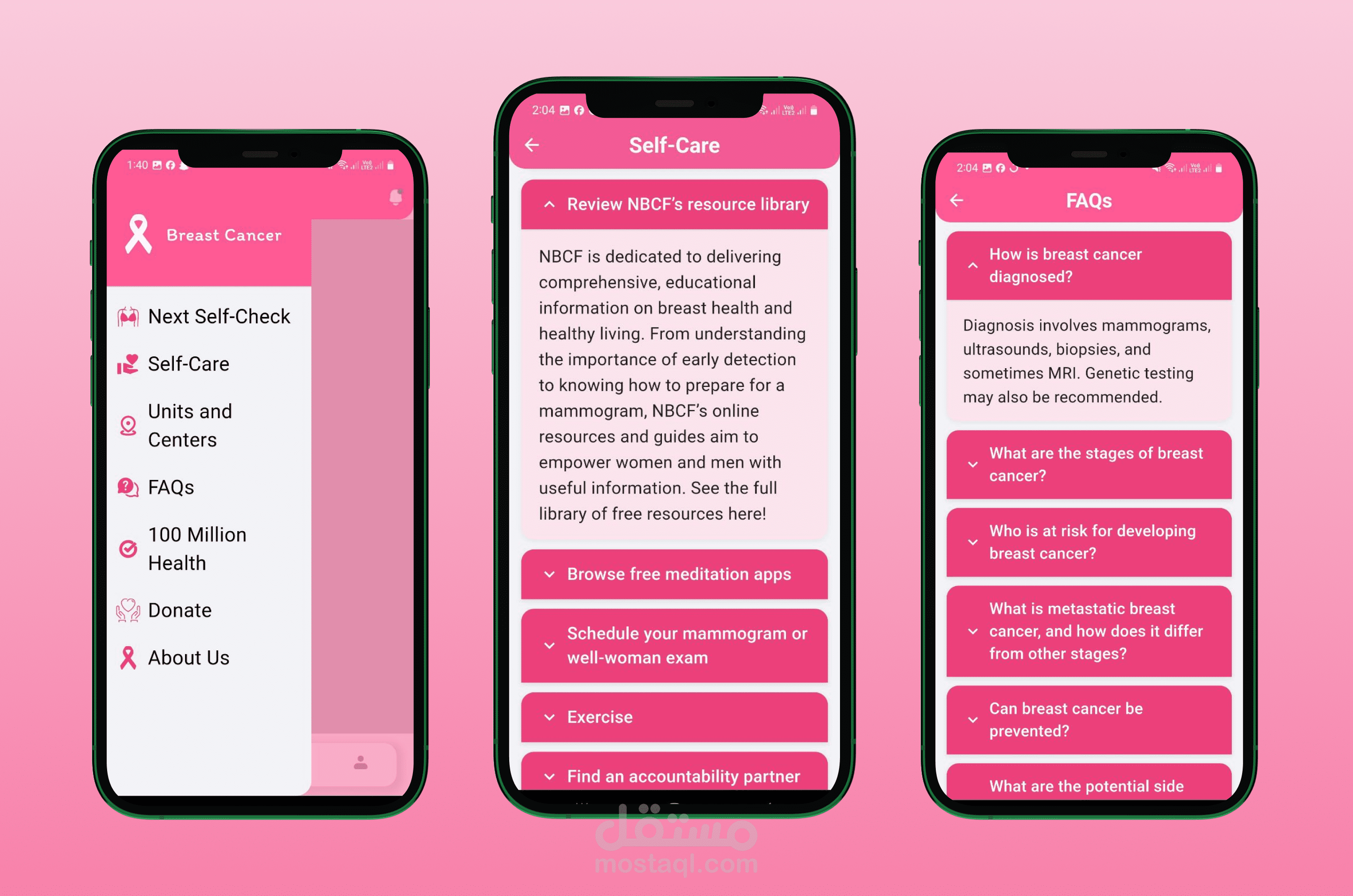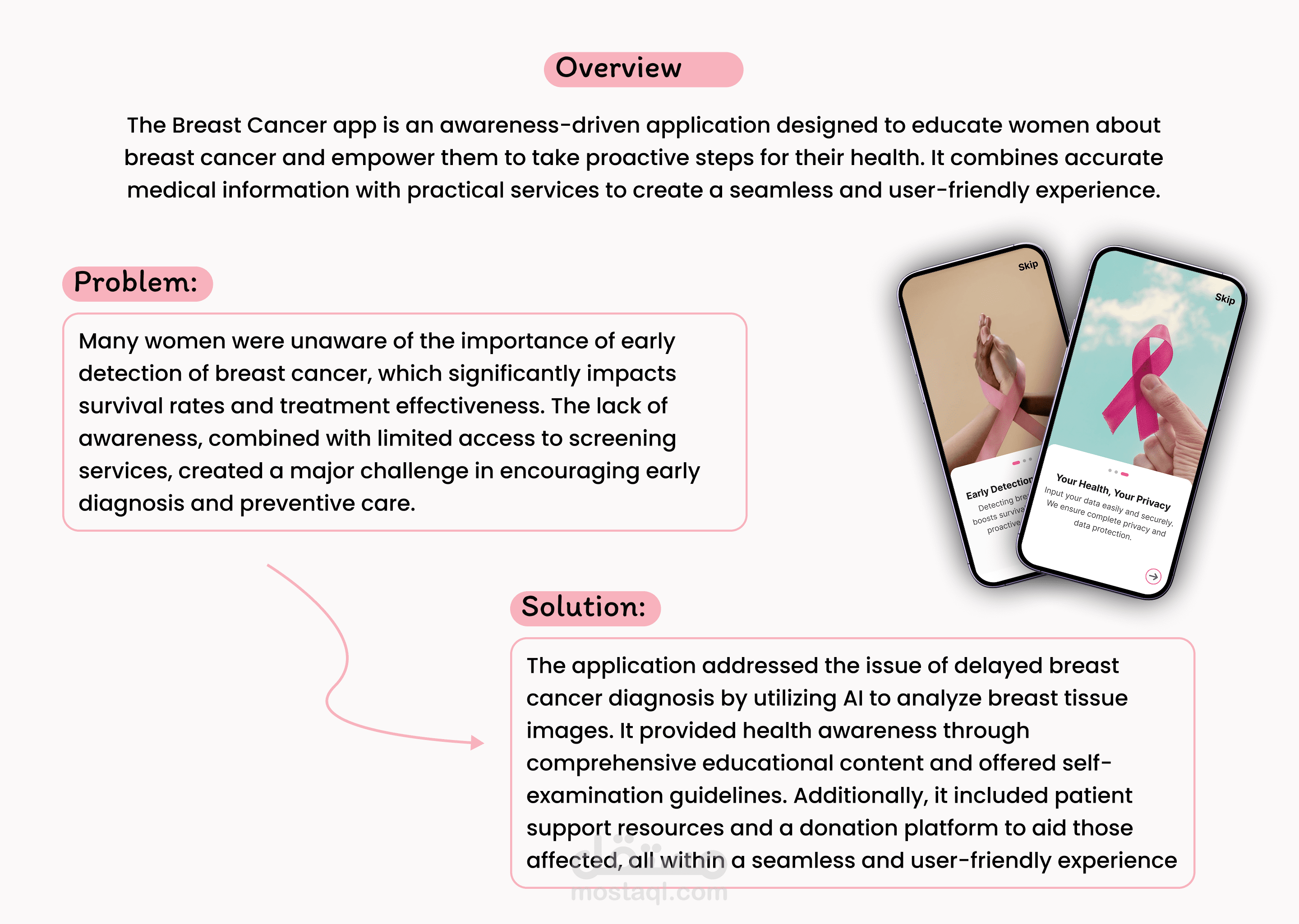 - التوعية الشاملة: معلومات توعوية حول سرطان الثدي، أعراضه، وأهمية الكشف المبكر والفحص الدوري.