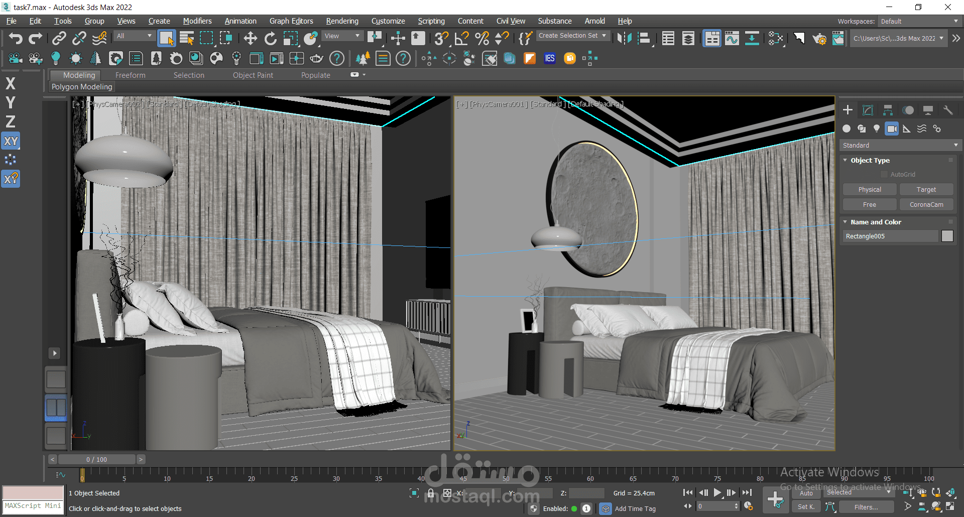 بدأت العمل عليه من خلال رسم التصميم على برنامج 3ds Max، مع استخدام Corona Renderer لتصيير المشهد والحصول على تفاصيل وإضاءة واقعية. اخترت ألوان هادئة مثل الرمادي والبيج، لأن الهدف كان خلق جو مريح ومثالي للاسترخاء.