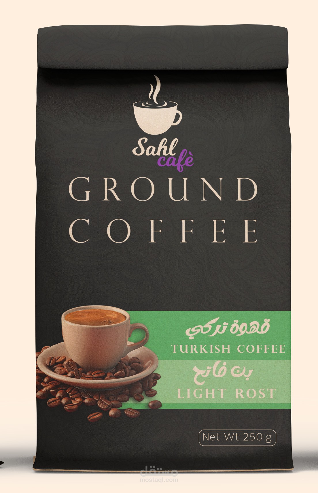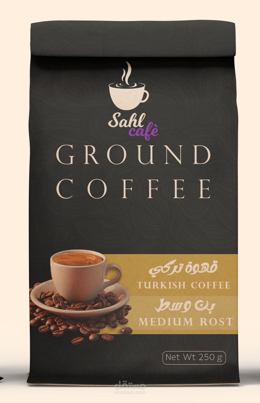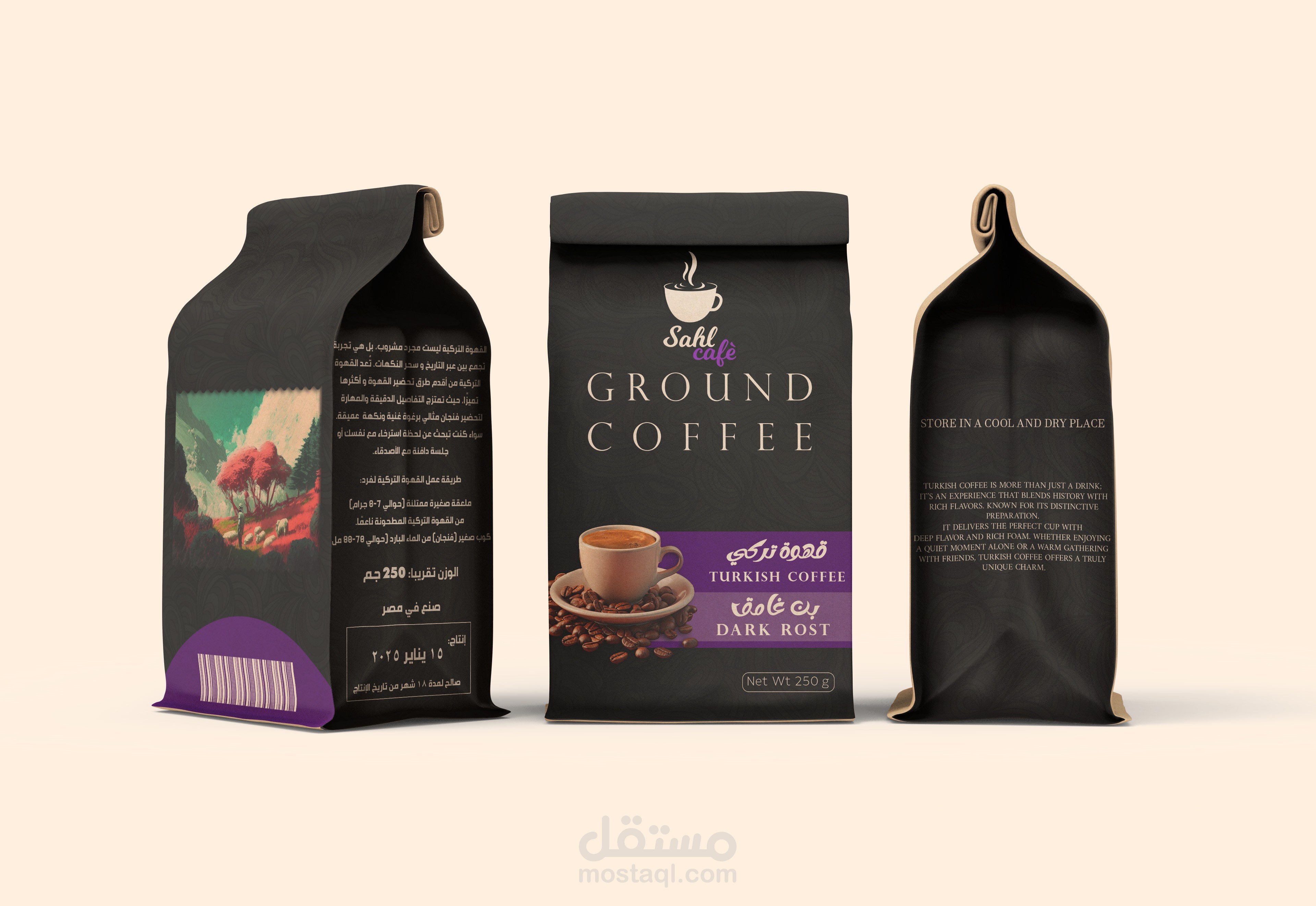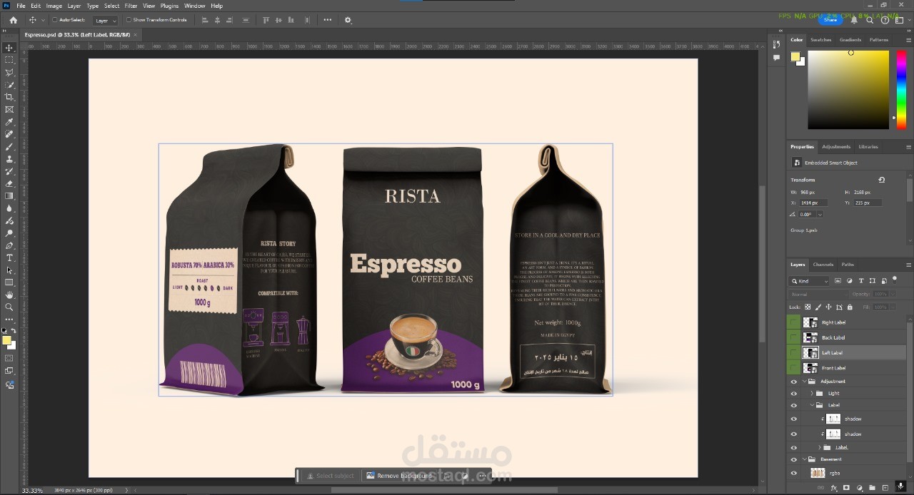 تم تصميم عبوة قهوة "RISTA Espresso Coffee Beans" بأسلوب احترافي يعكس هوية العلامة التجارية وجودة المنتج. التصميم يتميز بألوان داكنة مع لمسات بنفسجية لإضفاء طابع من الفخامة والتميز.