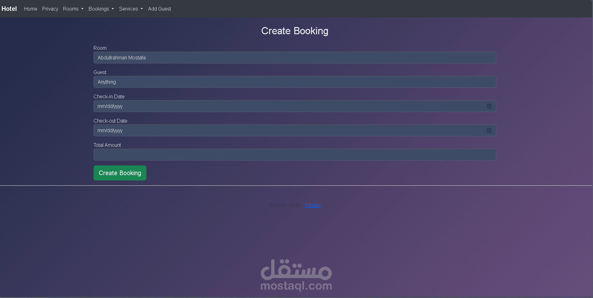 Create Booking: Facilitate the booking process by selecting rooms, guests, and specifying check-in and check-out dates.