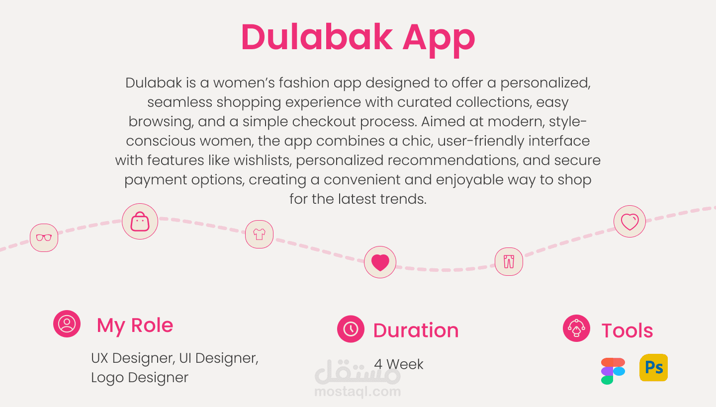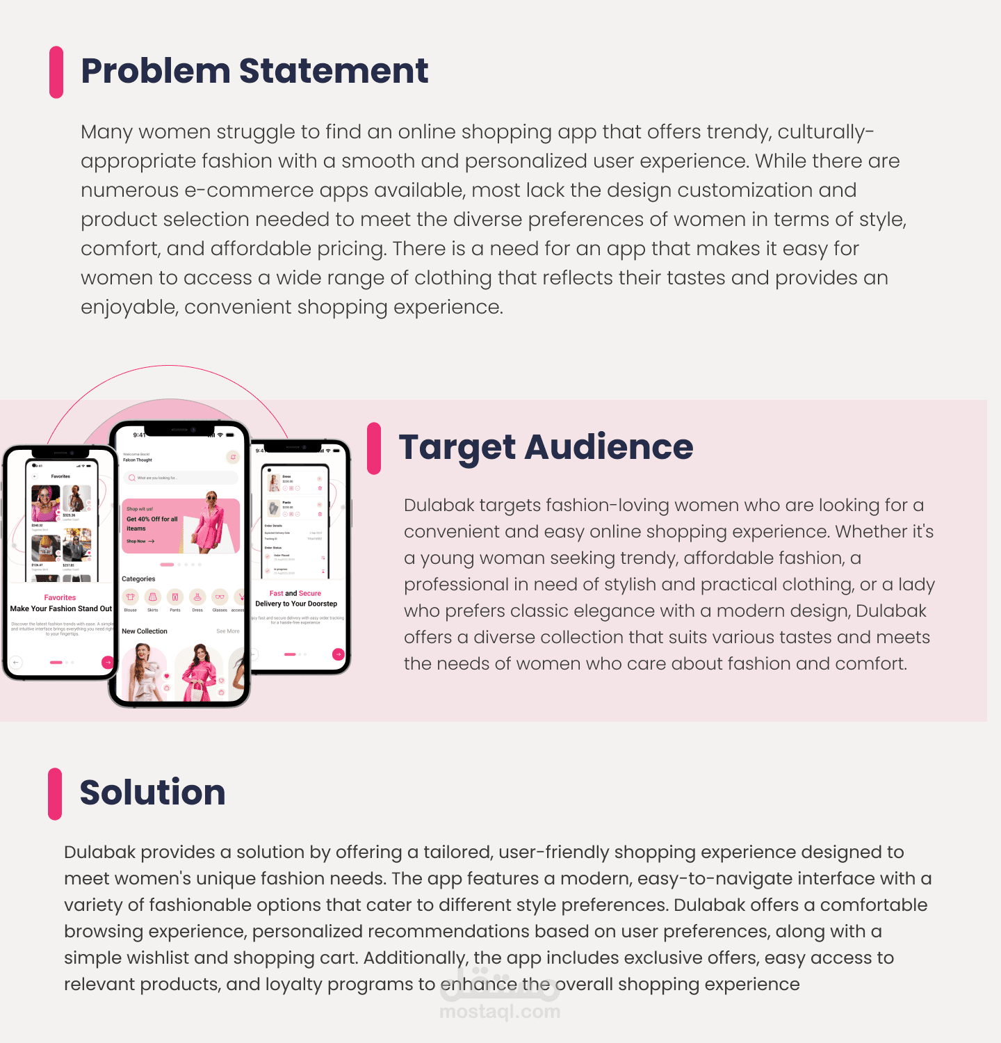 تطبيق دولابك ( Dulabak ) هو تطبيق مبتكر مخصص للملابس النسائية، صُمم ليقدم تجربة تسوق سلسة ومميزة للمرأة العصرية. يتميز التطبيق بواجهة مستخدم أنيقة وسهلة الاستخدام تعكس روح الأناقة والحداثة، مما يجعل التفاعل مع المنصة مريحًا وبسيطًا.