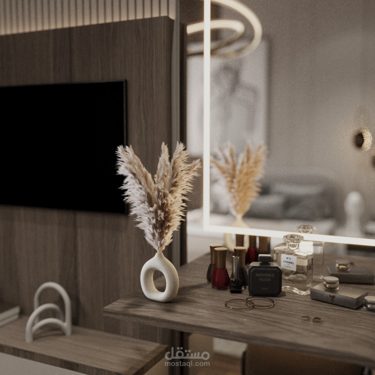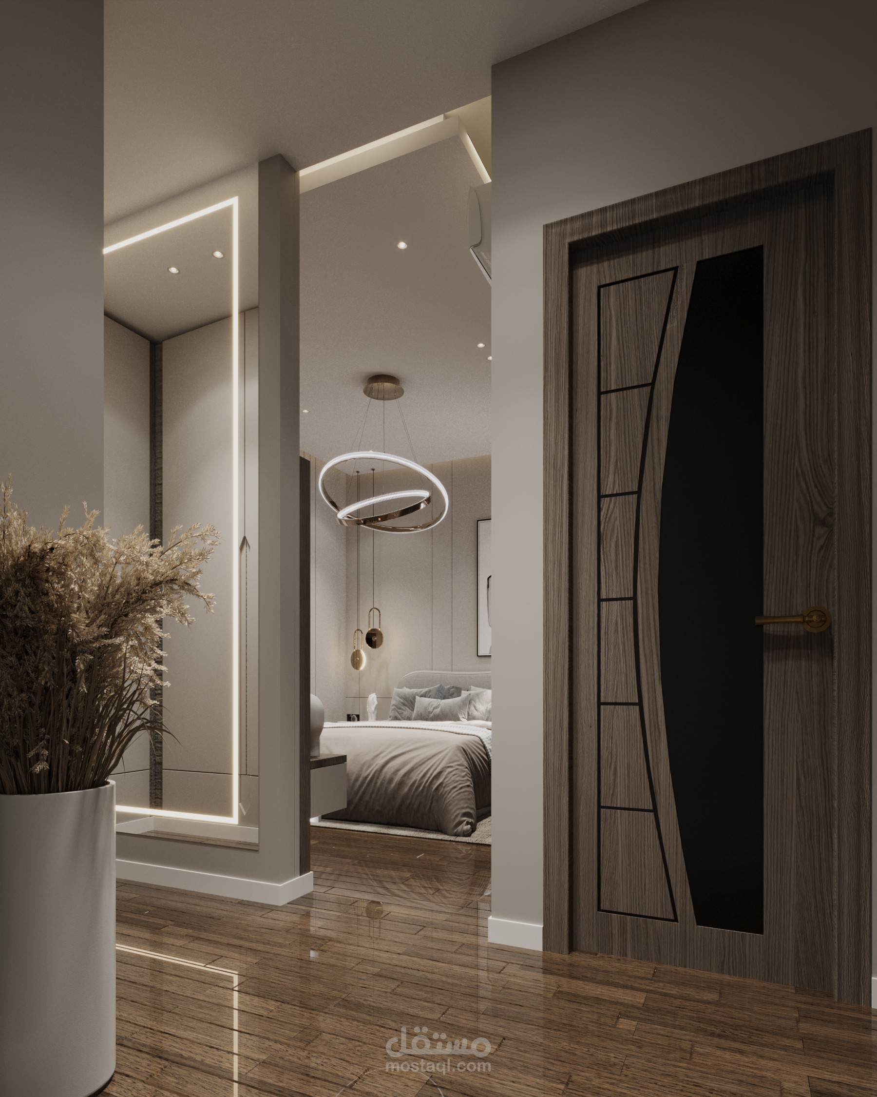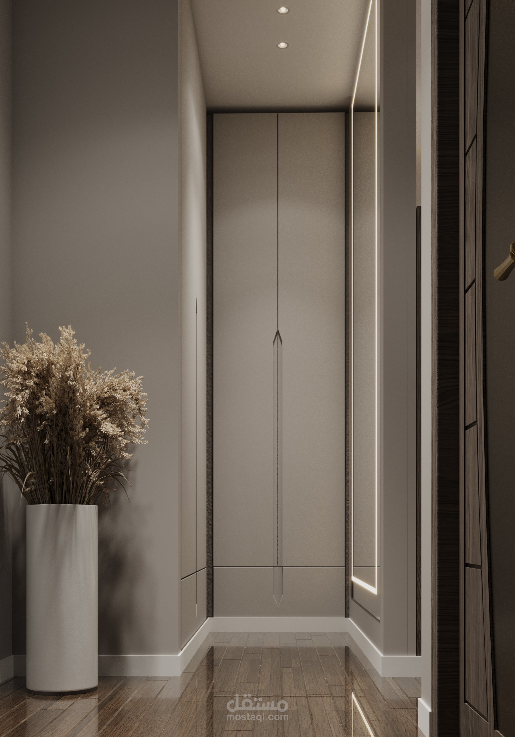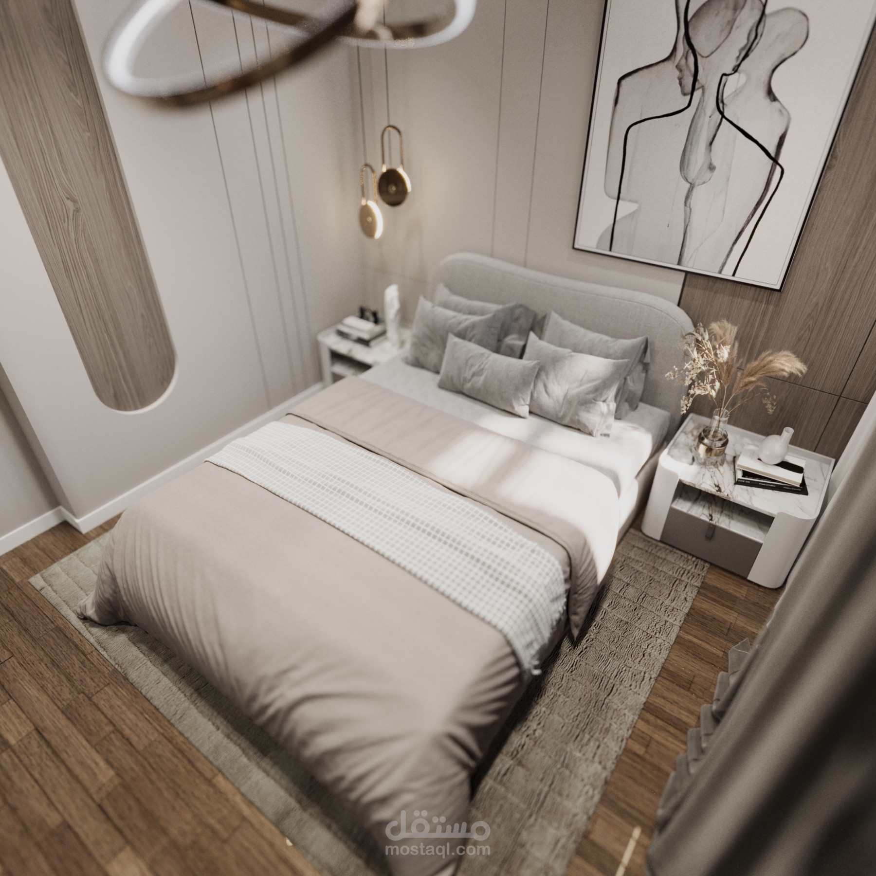 تصميم داخلي لبعض الفراغات في شقة دوبلكس (غرفة نوم ماستر بحمامها - صالة - مطبخ - حمام رئيسي - حمام ضيوف)