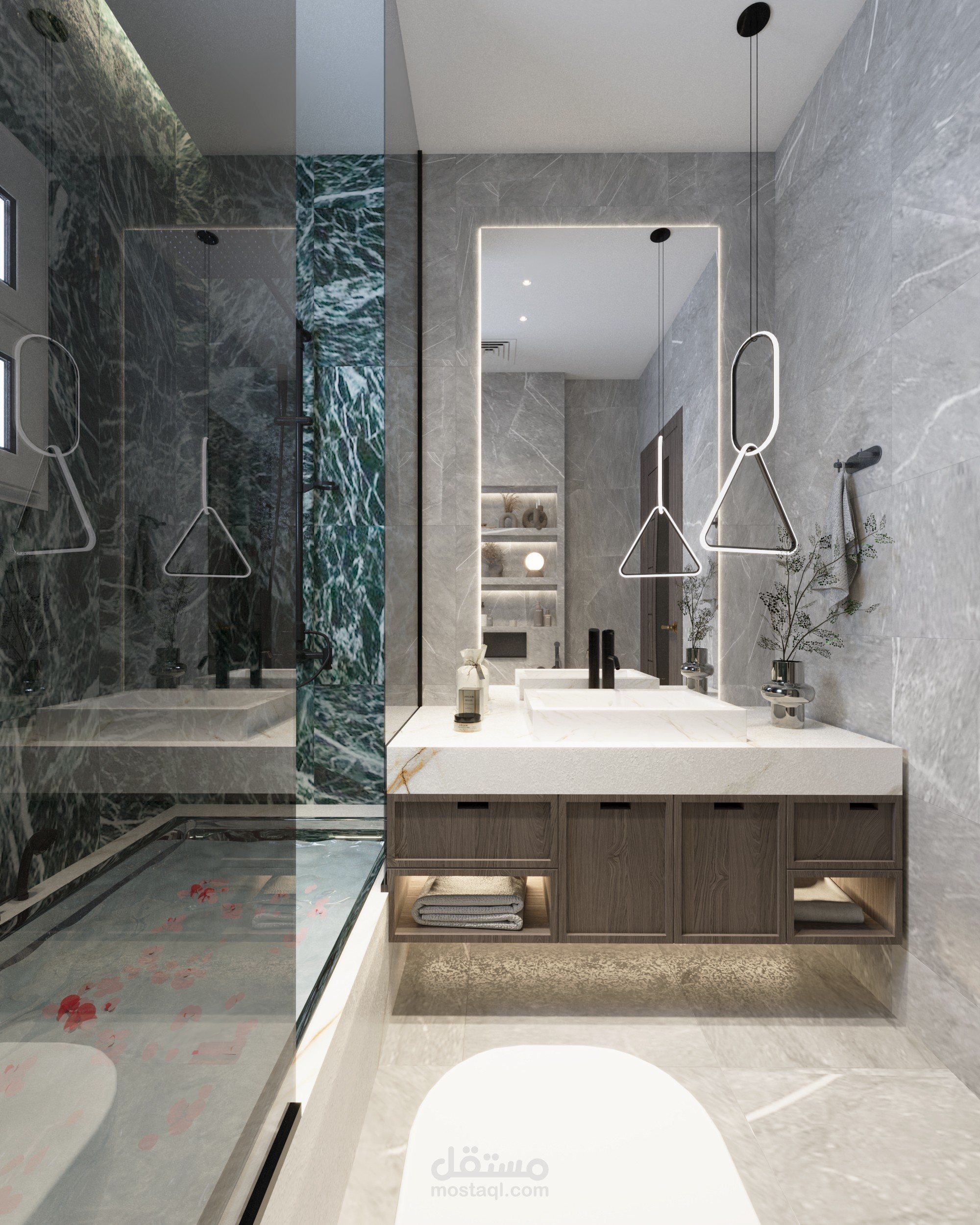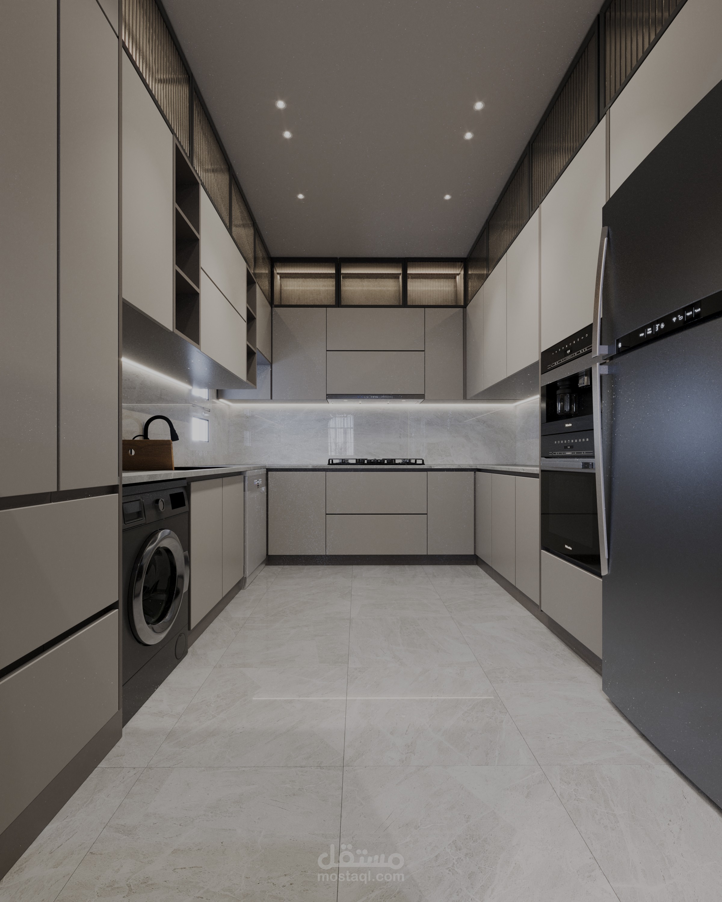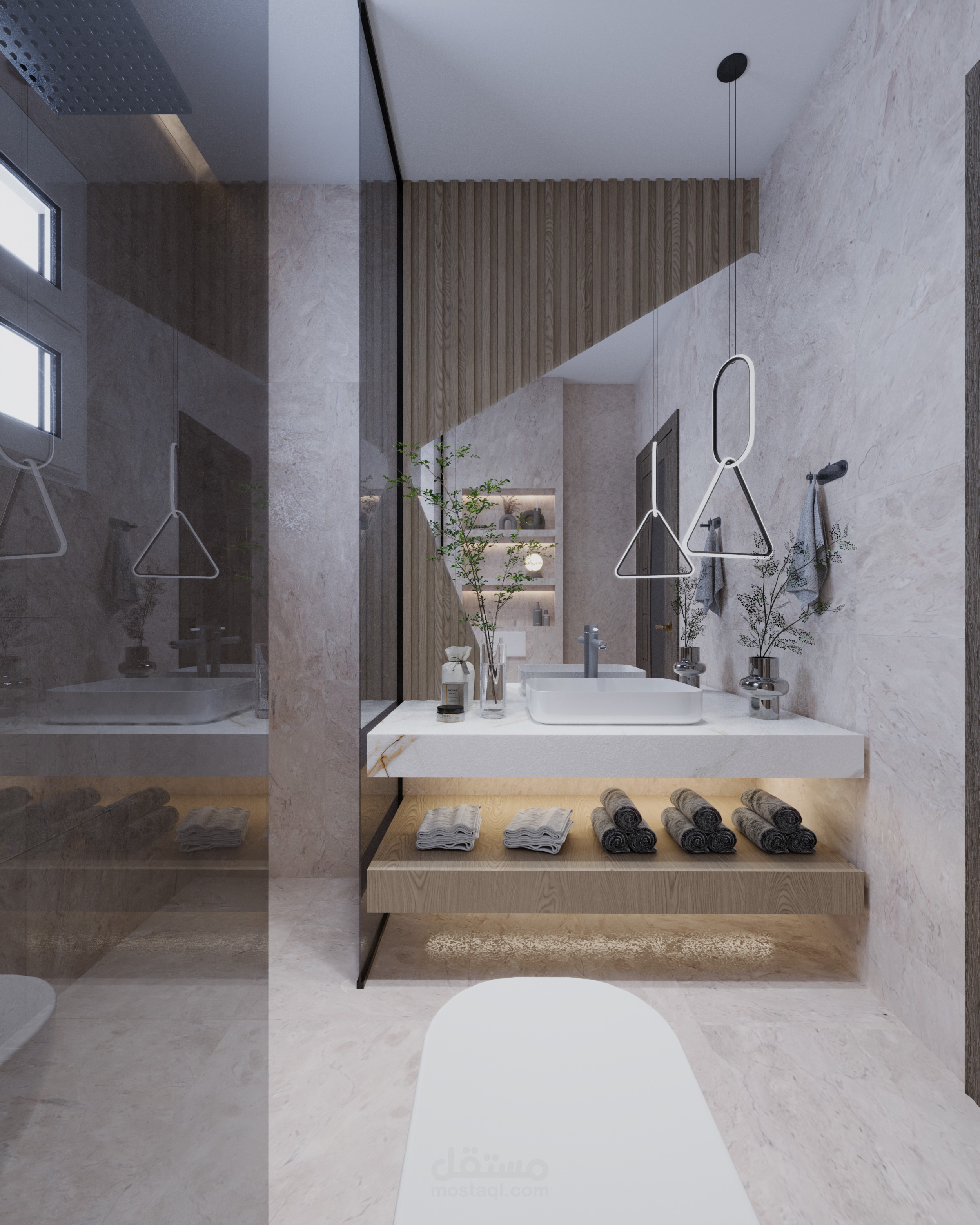تصميم داخلي لبعض الفراغات في شقة دوبلكس (غرفة نوم ماستر بحمامها - صالة - مطبخ - حمام رئيسي - حمام ضيوف)