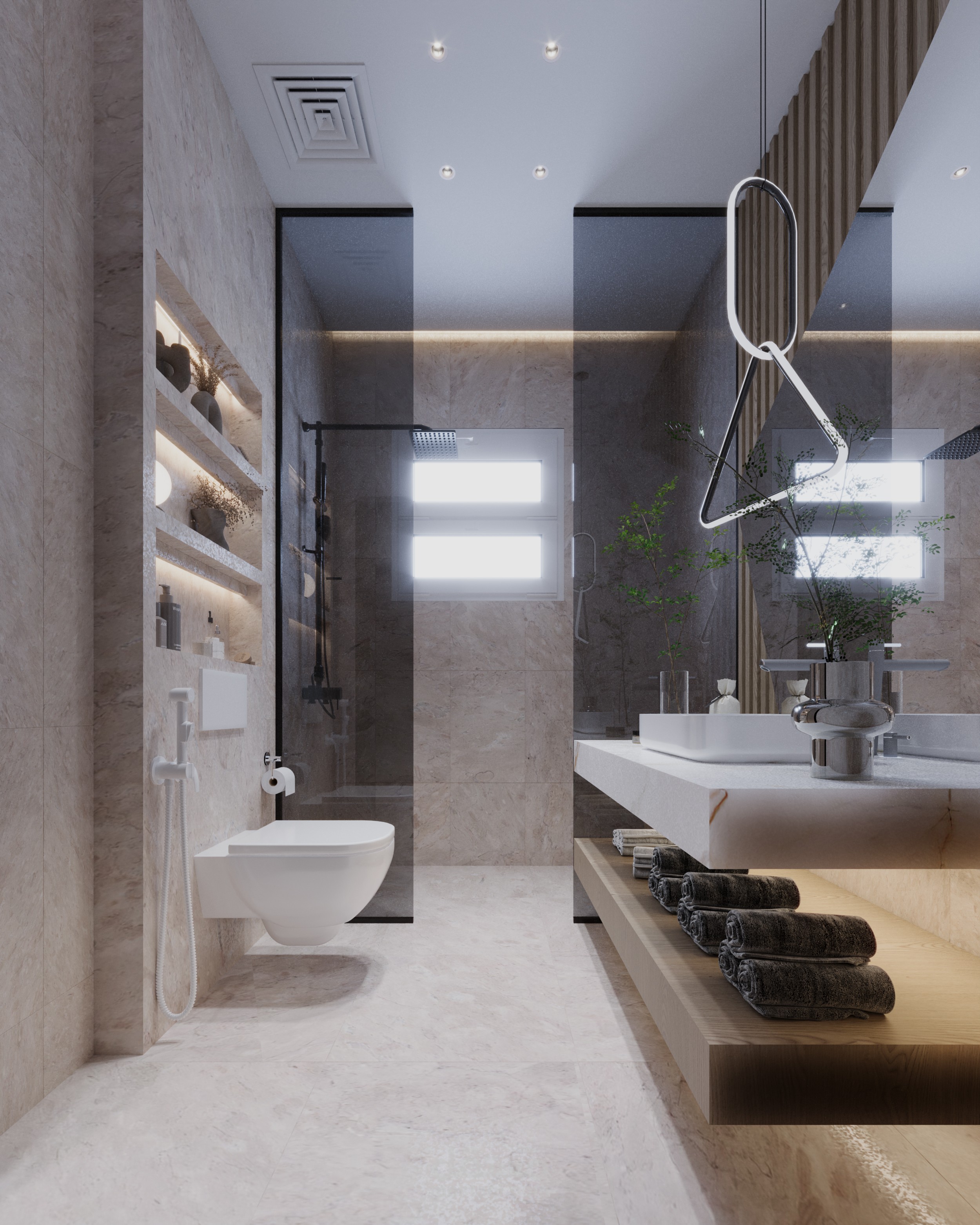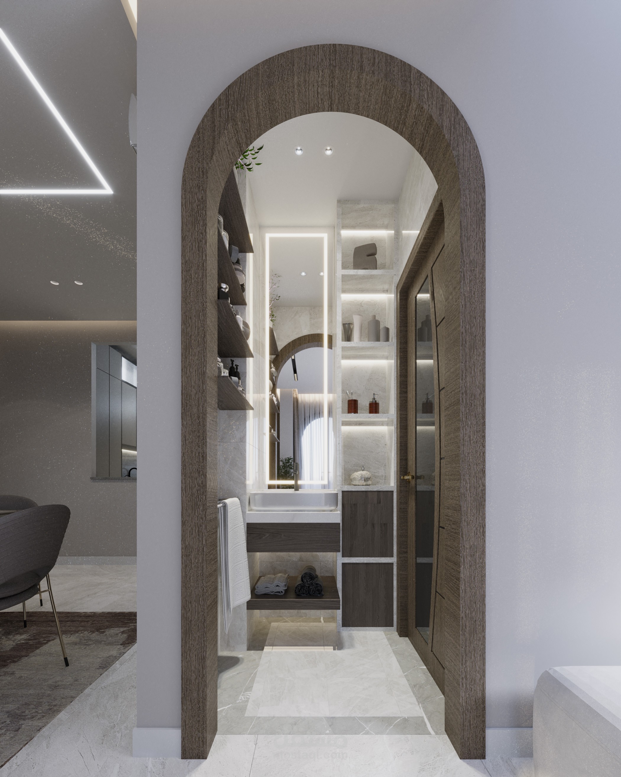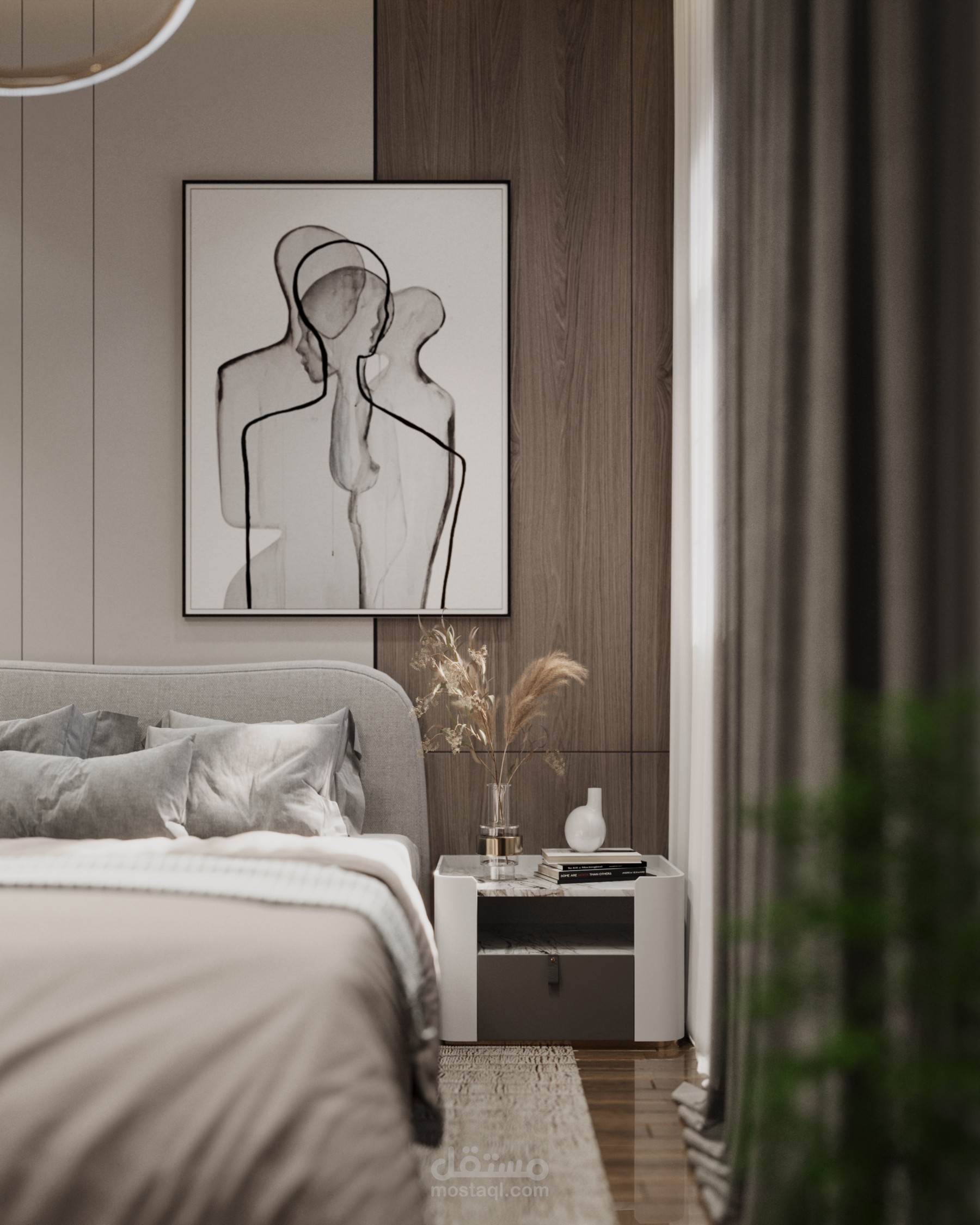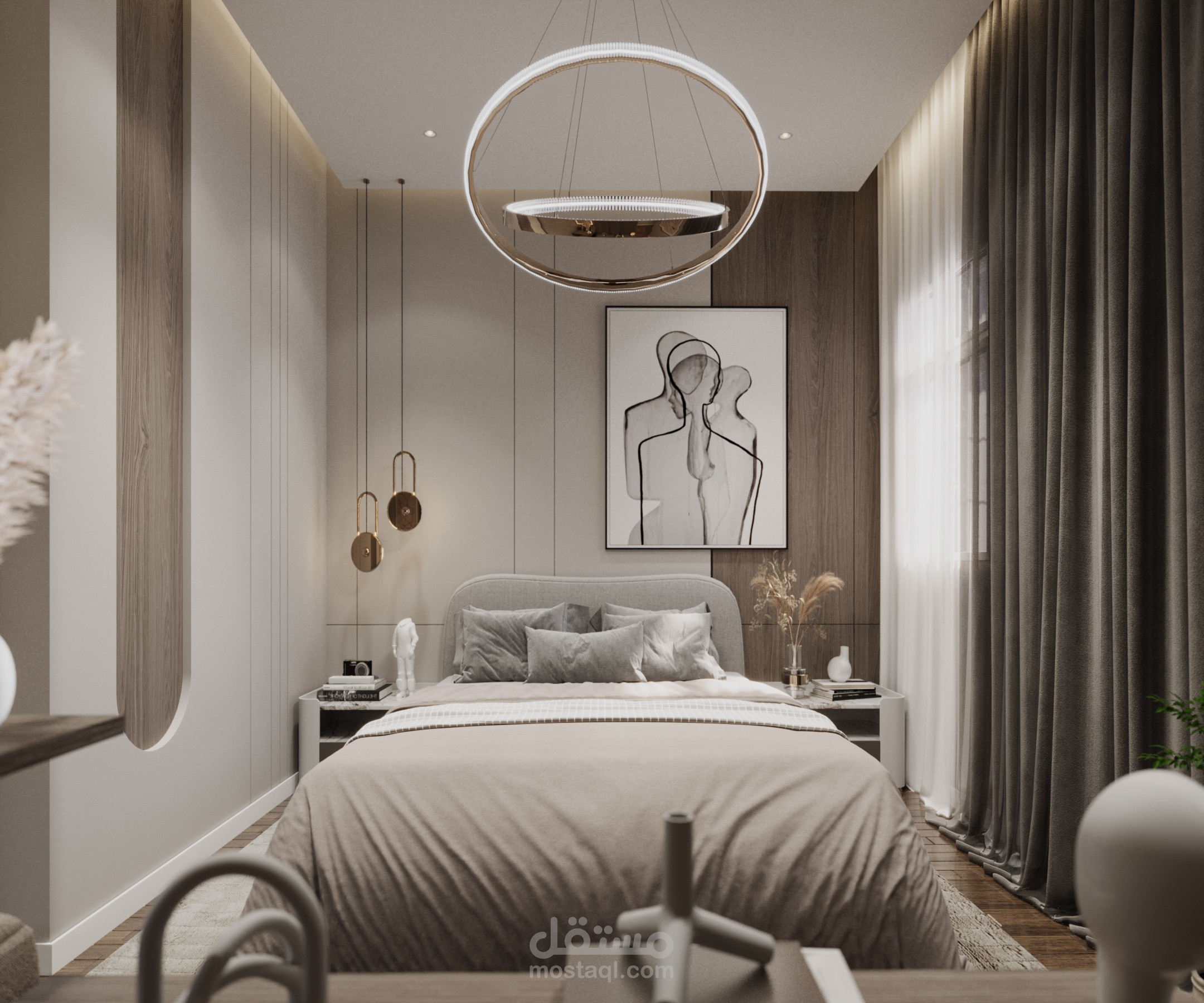 تصميم داخلي لبعض الفراغات في شقة دوبلكس (غرفة نوم ماستر بحمامها - صالة - مطبخ - حمام رئيسي - حمام ضيوف)