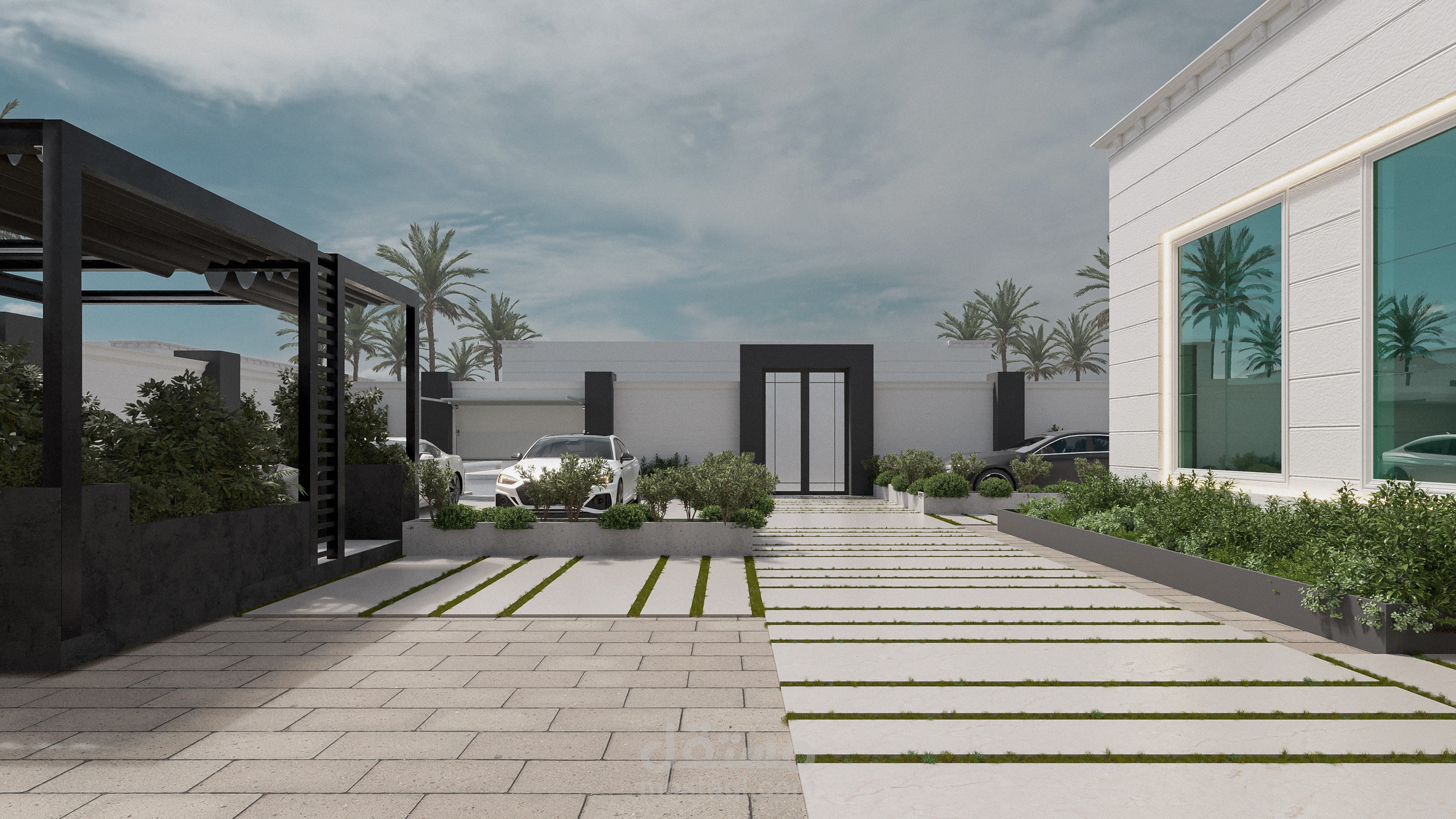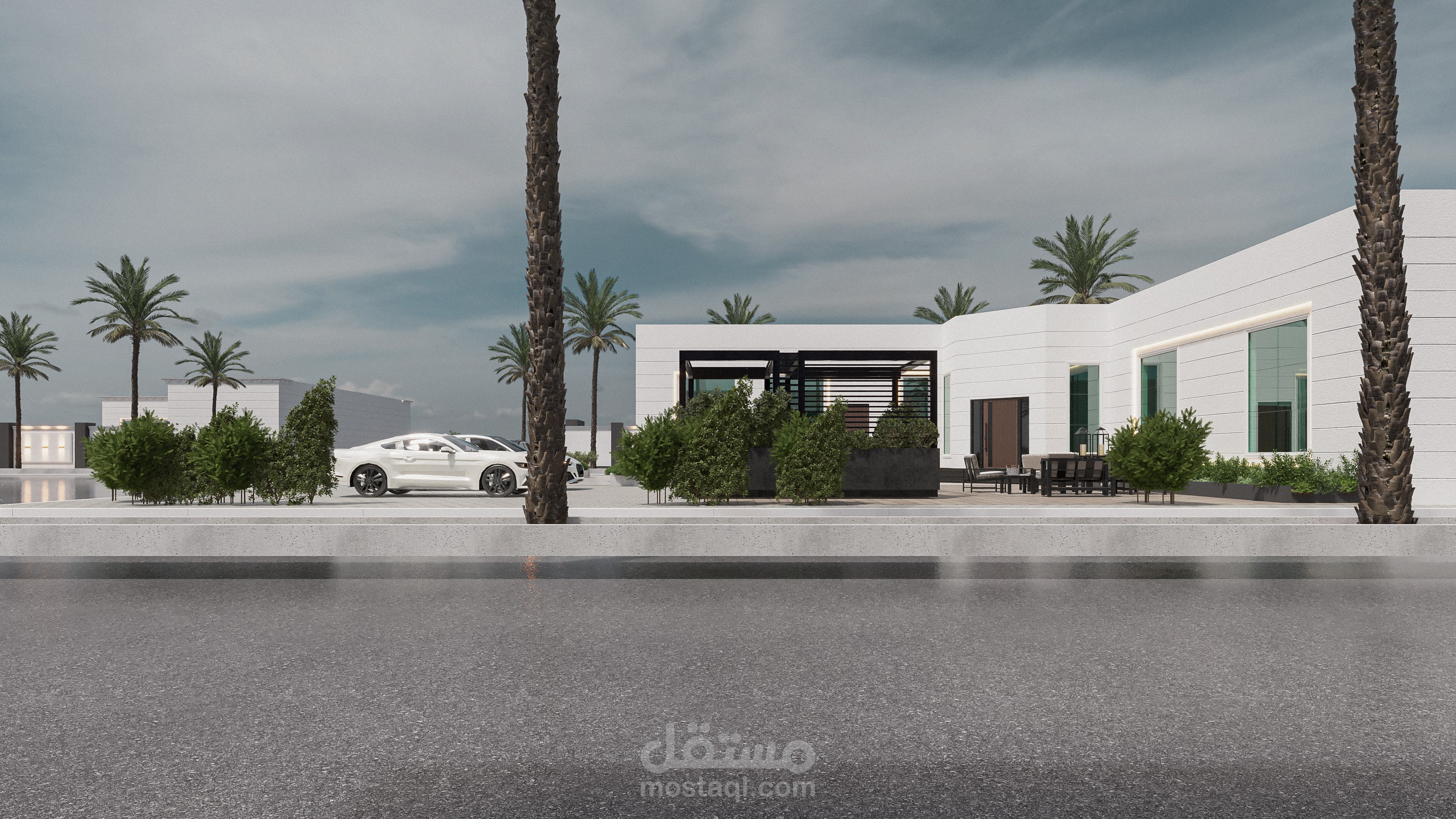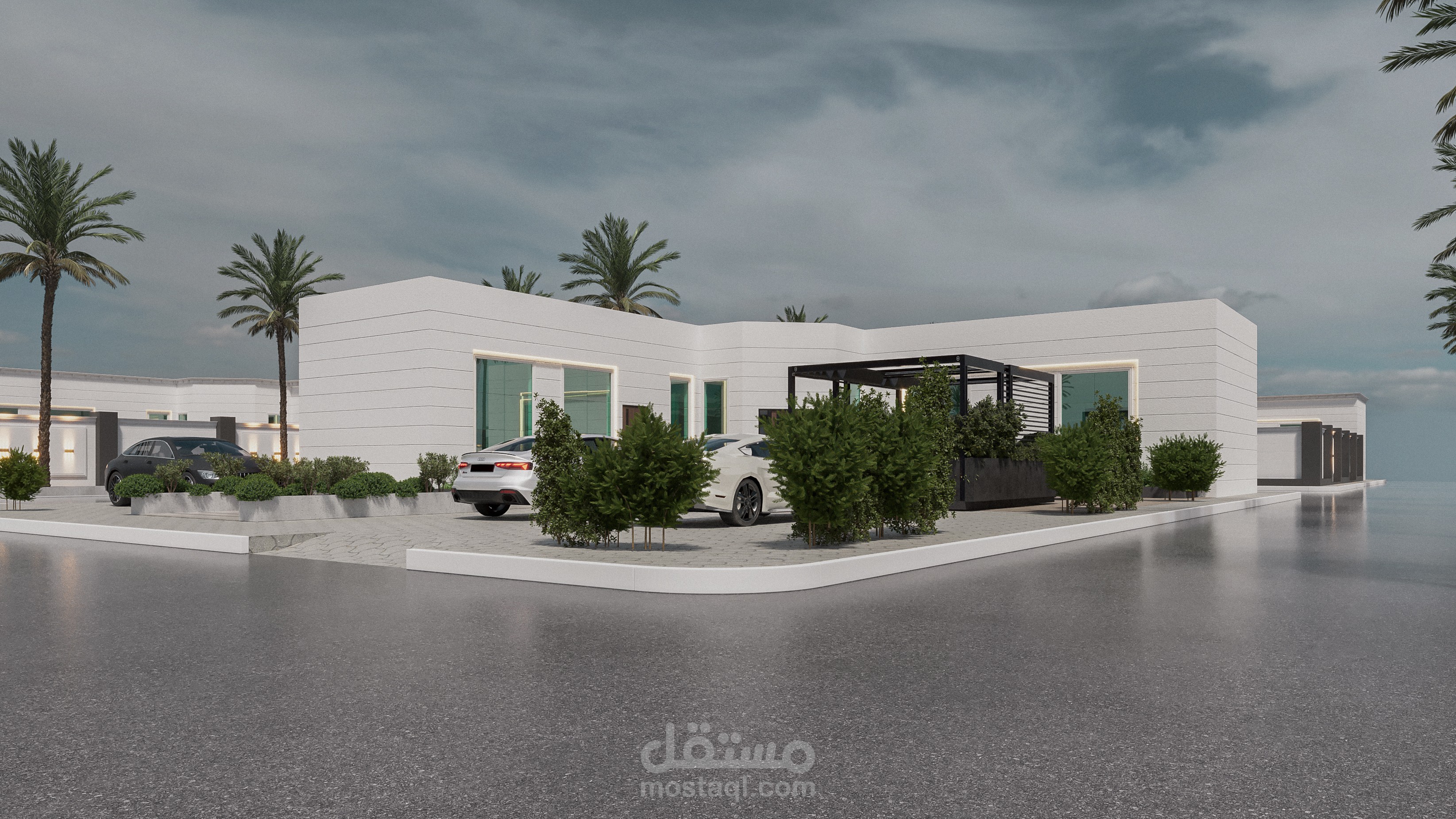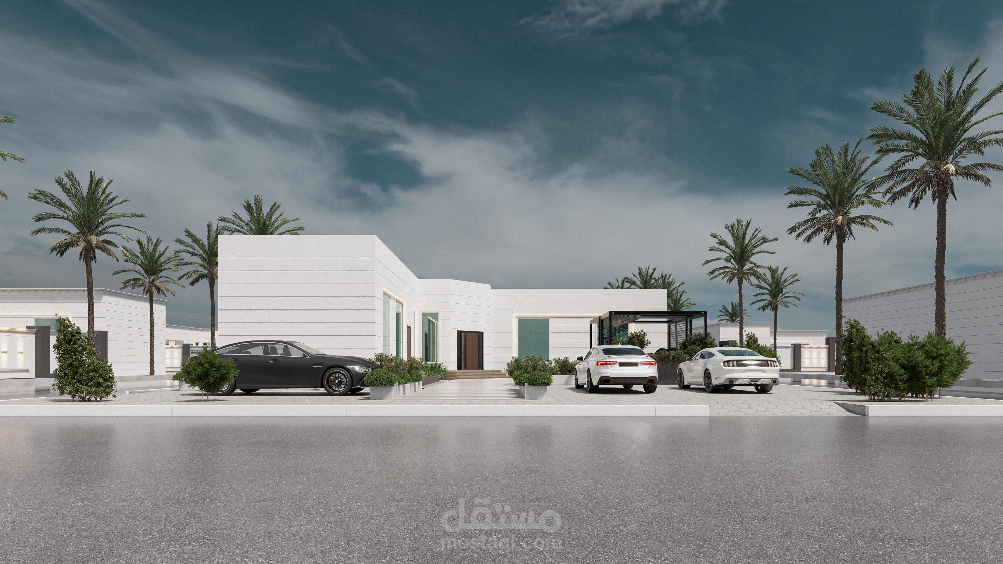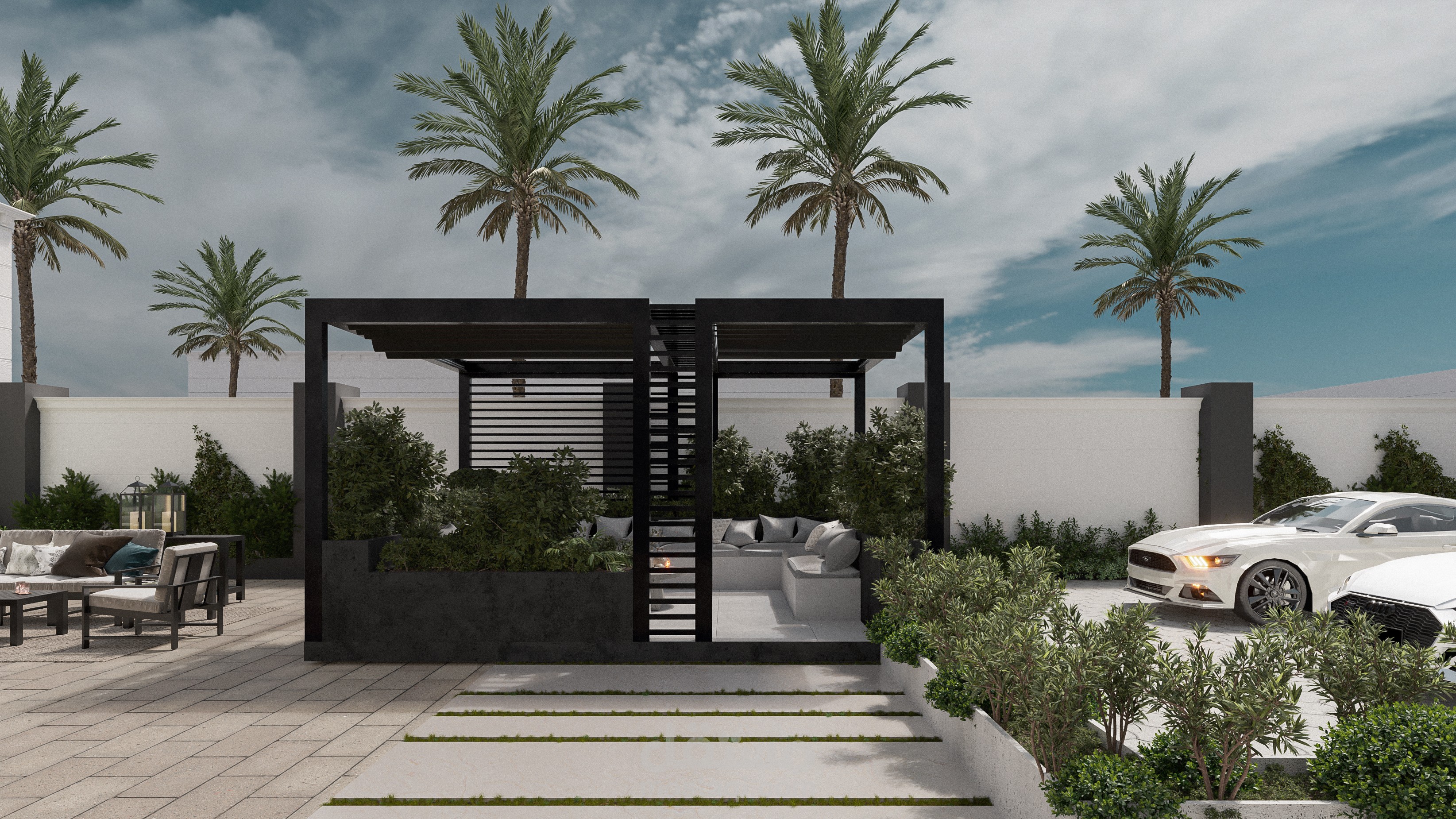 - تم تنسيق مساحات للسيارات مع اماكن الجلوس والاستراحة مع توفير العناصر الخضراء لإضافة لمسة جمالية مع ترطيب الجو