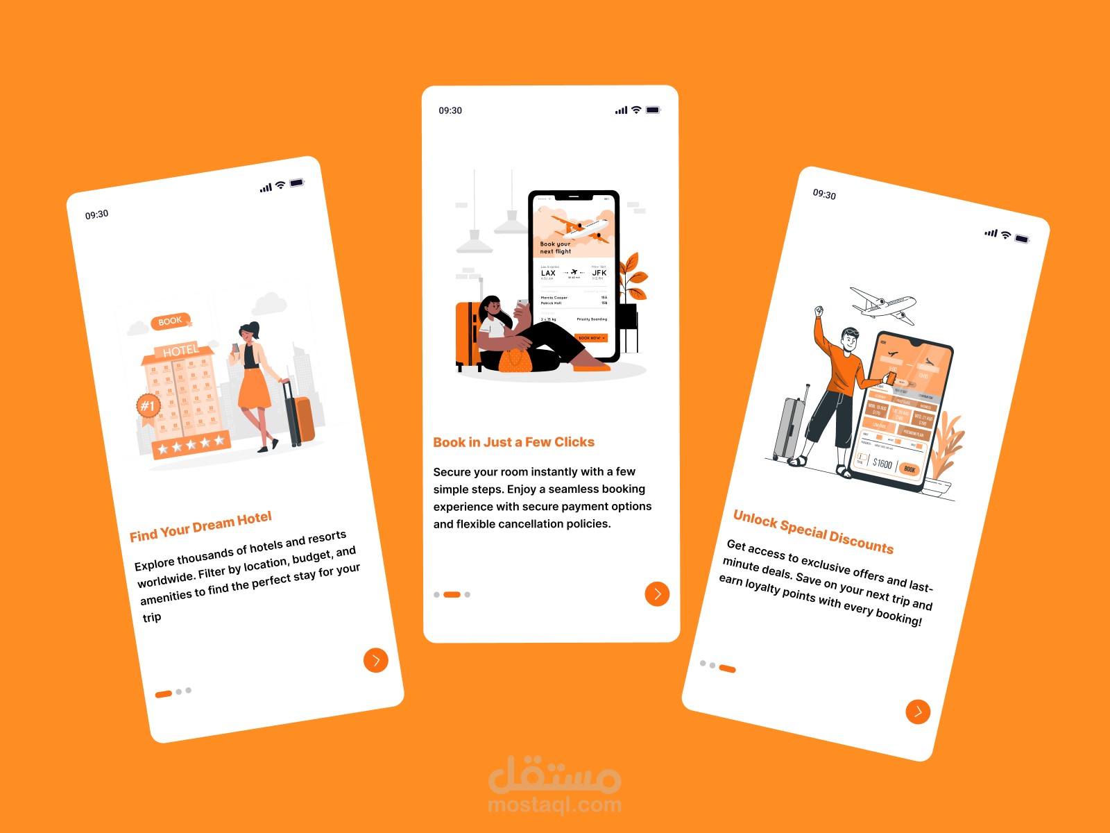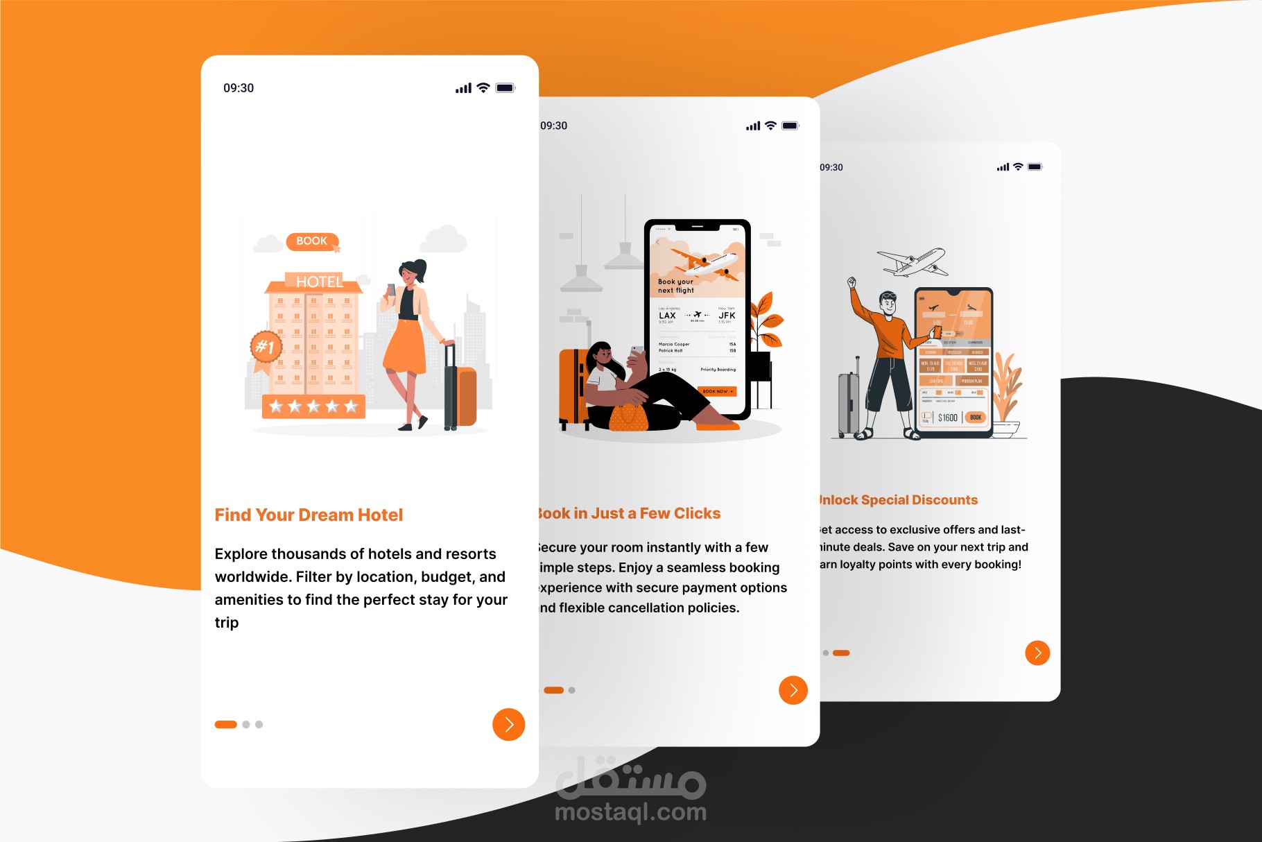اكتشف Onboarding Screens التي ترشدك خلال عملية البحث، الحجز، والحصول على عروض حصرية في أفضل الفنادق.