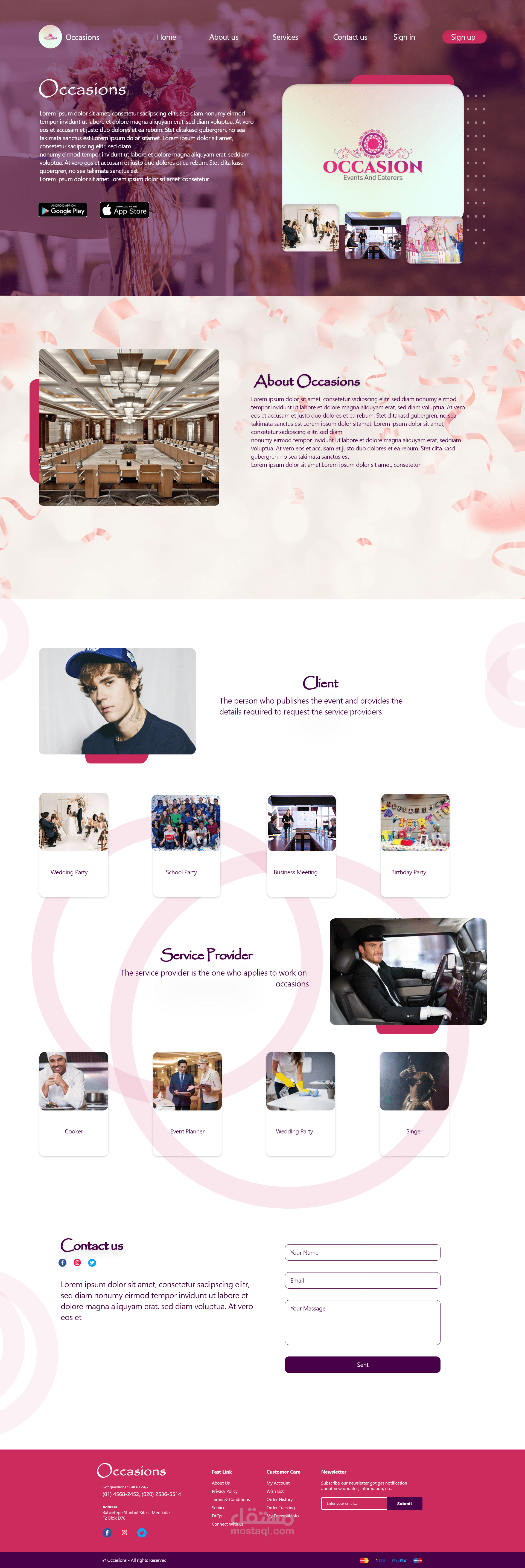 Occasion Landing Page تجربة المستخدم وواجهات المستخدم هو تطبيق تم تصميمه بواسطة Figma لتنظيم المناسبات والمساعدة في الحصول على الموظفين المطلوبين لتنظيم المناسبة ومنها الطباخ والسائق والمغني وكل ما تحتاج المناسبة حسب نوعها كما يساعد صاحب المهنة بالحصول على فرصة العمل بالمناسبات المختلفة حسب الوظيفة التي يعمل بها