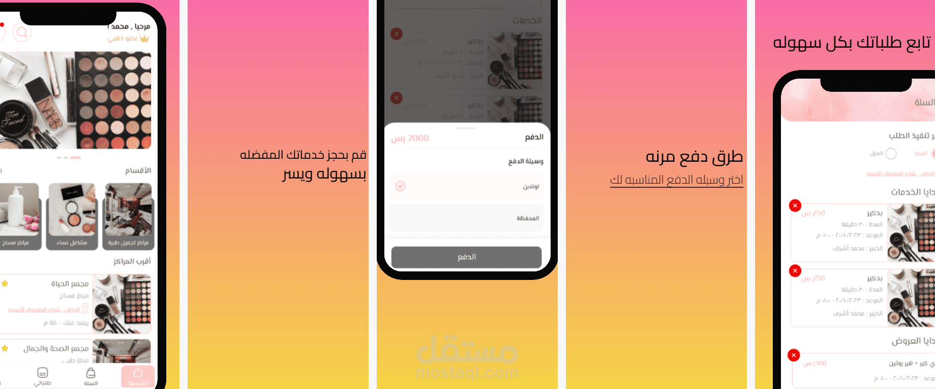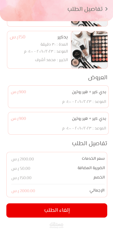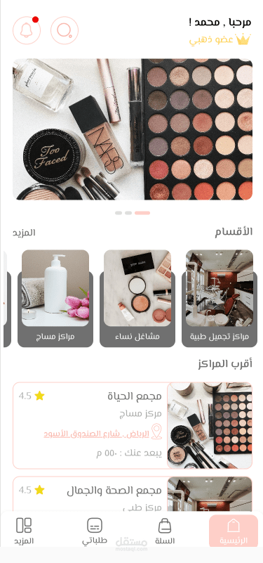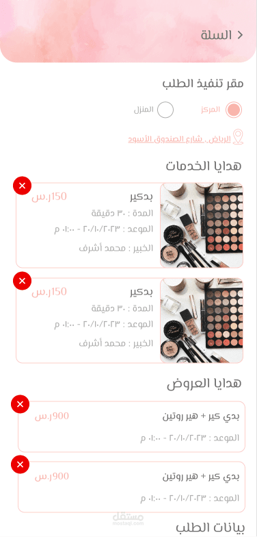 يمكن للمستخدم طلب خدمات محددة من مراكز متخصصة في العناية بالشعر، الأظافر، أو البشرة. يتمتع المستخدم بخيارات متعددة تشمل: