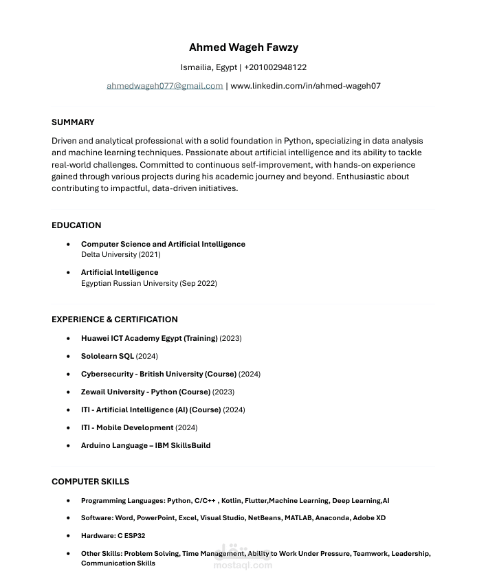 محترف طموح ومحلل بيانات يتمتع بخبرة قوية في Python وتقنيات التعلم الآلي والذكاء الاصطناعي. شغوف بتطوير حلول قائمة على البيانات لمواجهة التحديات الواقعية، مع التزام دائم بالتعلم المستمر واكتساب المهارات العملية من خلال المشاريع الأكاديمية والتدريبية.