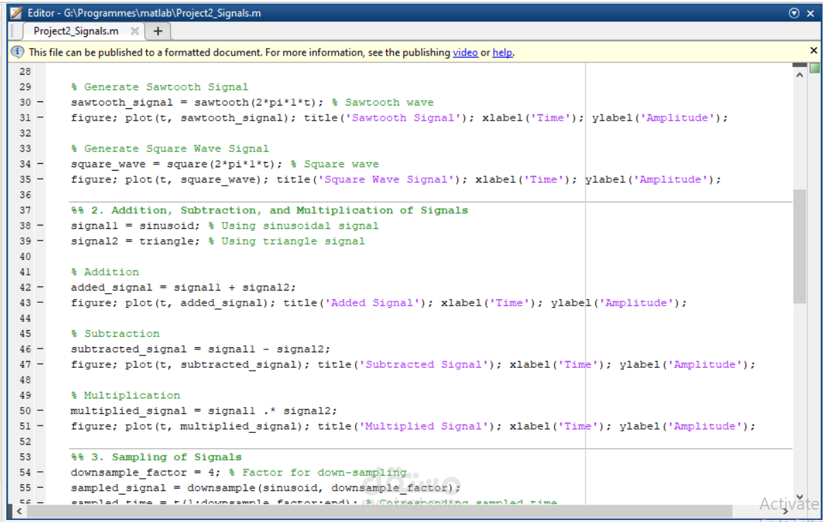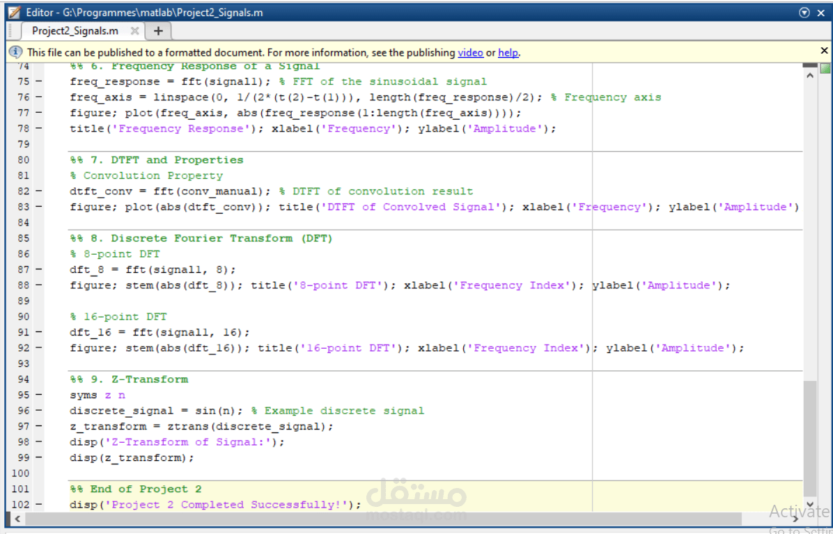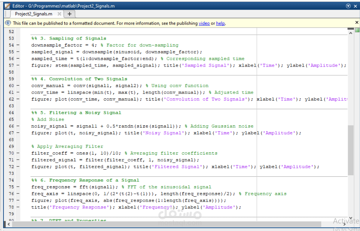 تم عمل مشروع يعرض ويشرح انواع الموجات في مادة الSignal and systems. تم كتابة الكود كاملا على MATLAB . المشروع يعرض كل انواع الموجات بأشكلاها ويشرح كل سطر في الكود واثر التغيير الذي يحدث على الموجة الرئيسية. كما يشرح العمليات الرياضية وتطبيقها على الموجات وتداخلها مع بعضها البعض.