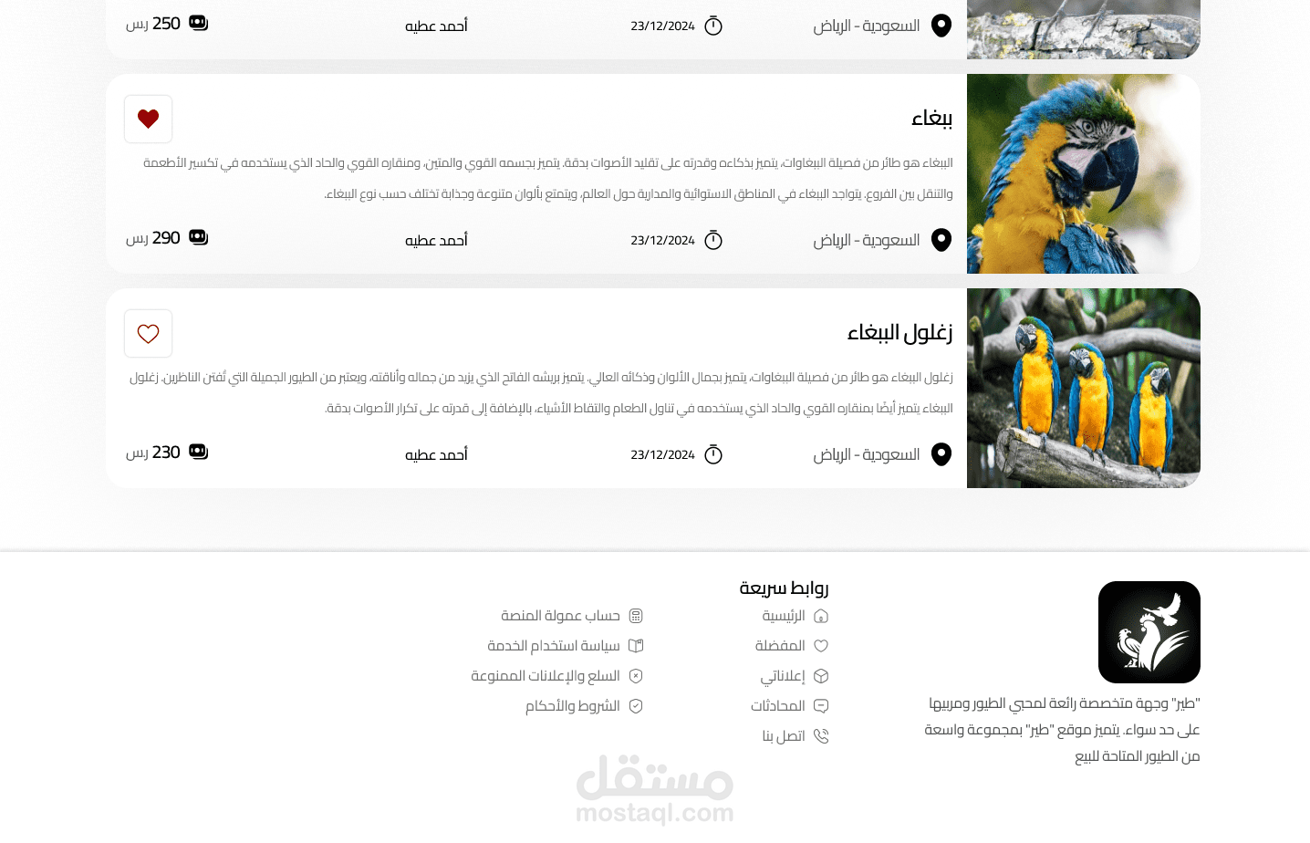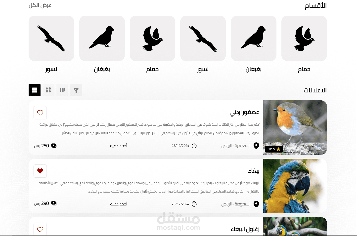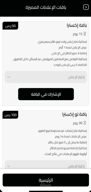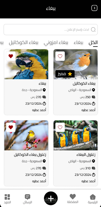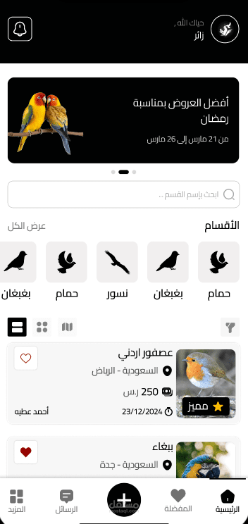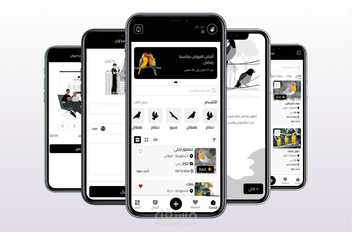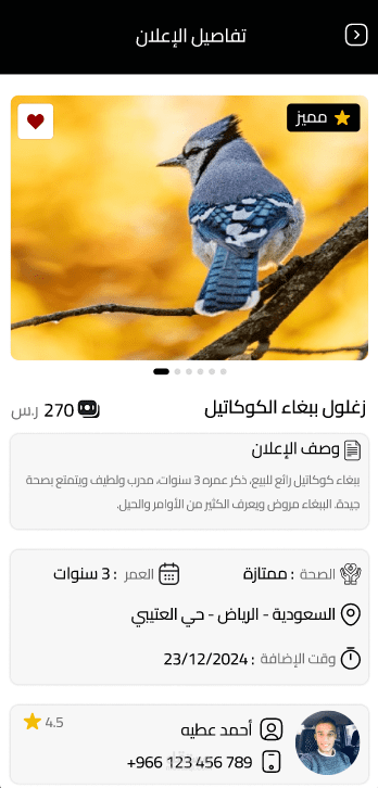 "طير" تطبيق وسيط متكامل لبيع وشراء الإعلانات الخاصة بالطيور في المملكة العربية السعودية، حيث يوفر منصة سهلة الاستخدام تتيح للبائعين عرض طيورهم والمشترين البحث عنها والتواصل المباشر. يدعم التطبيق تصنيفات رئيسية وفرعية، مما يسهل الوصول إلى الإعلانات المستهدفة. كما يوفر خيارات بحث متقدمة عبر اسم الإعلان أو القسم، مع إمكانية عرض النتائج كقائمة، شبكة (Grid)، أو على الخريطة.