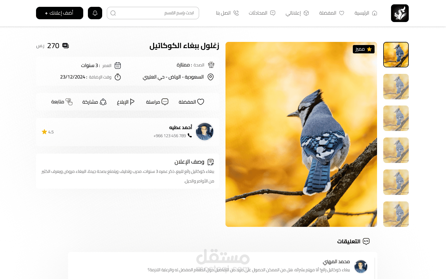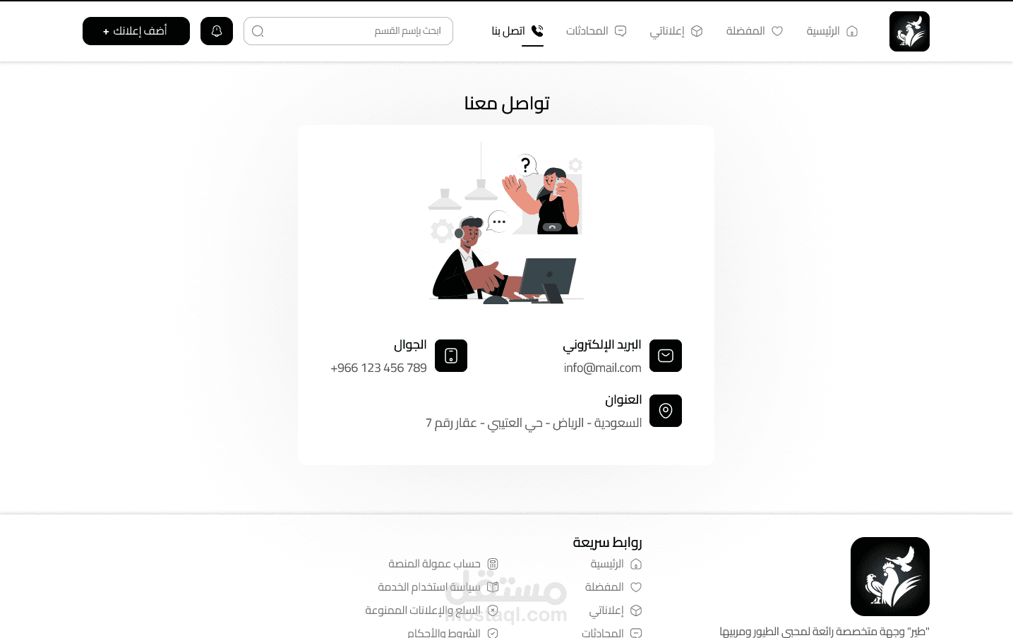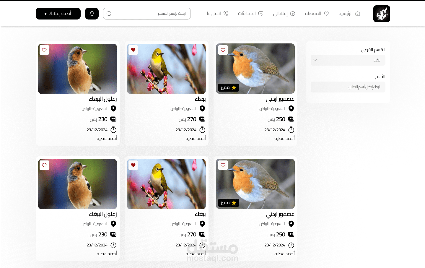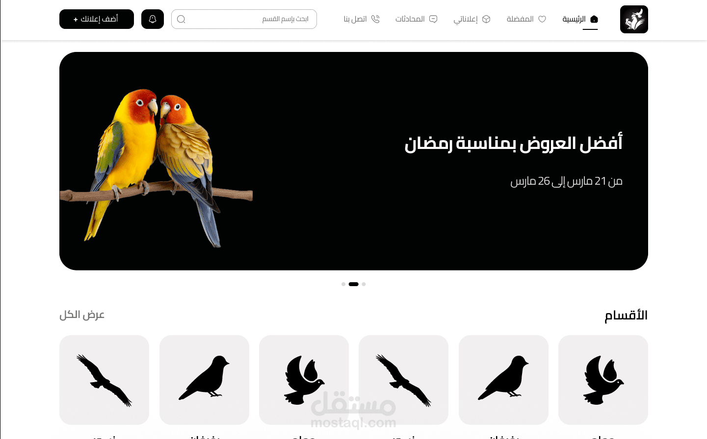 "طير" تطبيق وسيط متكامل لبيع وشراء الإعلانات الخاصة بالطيور في المملكة العربية السعودية، حيث يوفر منصة سهلة الاستخدام تتيح للبائعين عرض طيورهم والمشترين البحث عنها والتواصل المباشر. يدعم التطبيق تصنيفات رئيسية وفرعية، مما يسهل الوصول إلى الإعلانات المستهدفة. كما يوفر خيارات بحث متقدمة عبر اسم الإعلان أو القسم، مع إمكانية عرض النتائج كقائمة، شبكة (Grid)، أو على الخريطة.