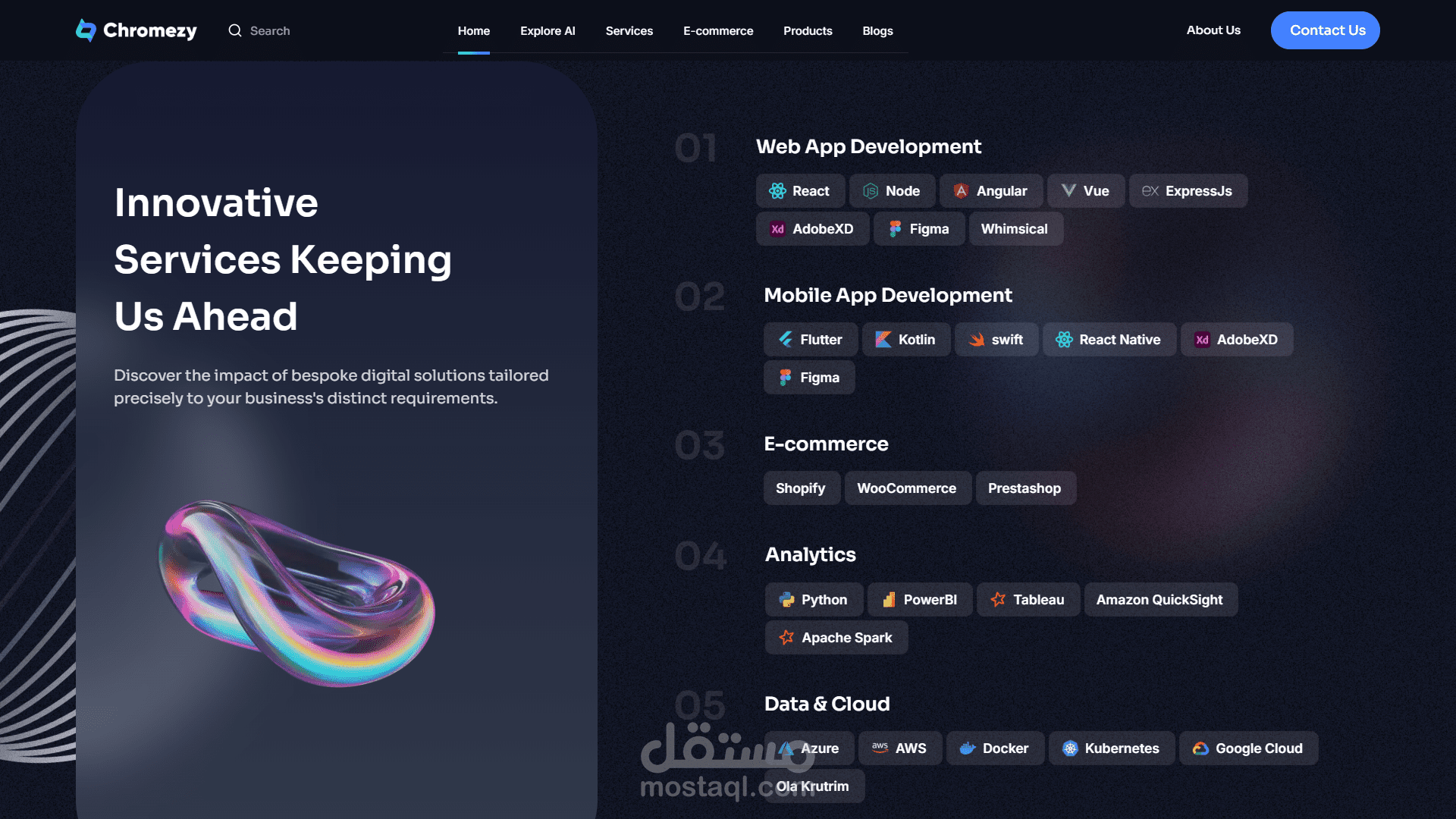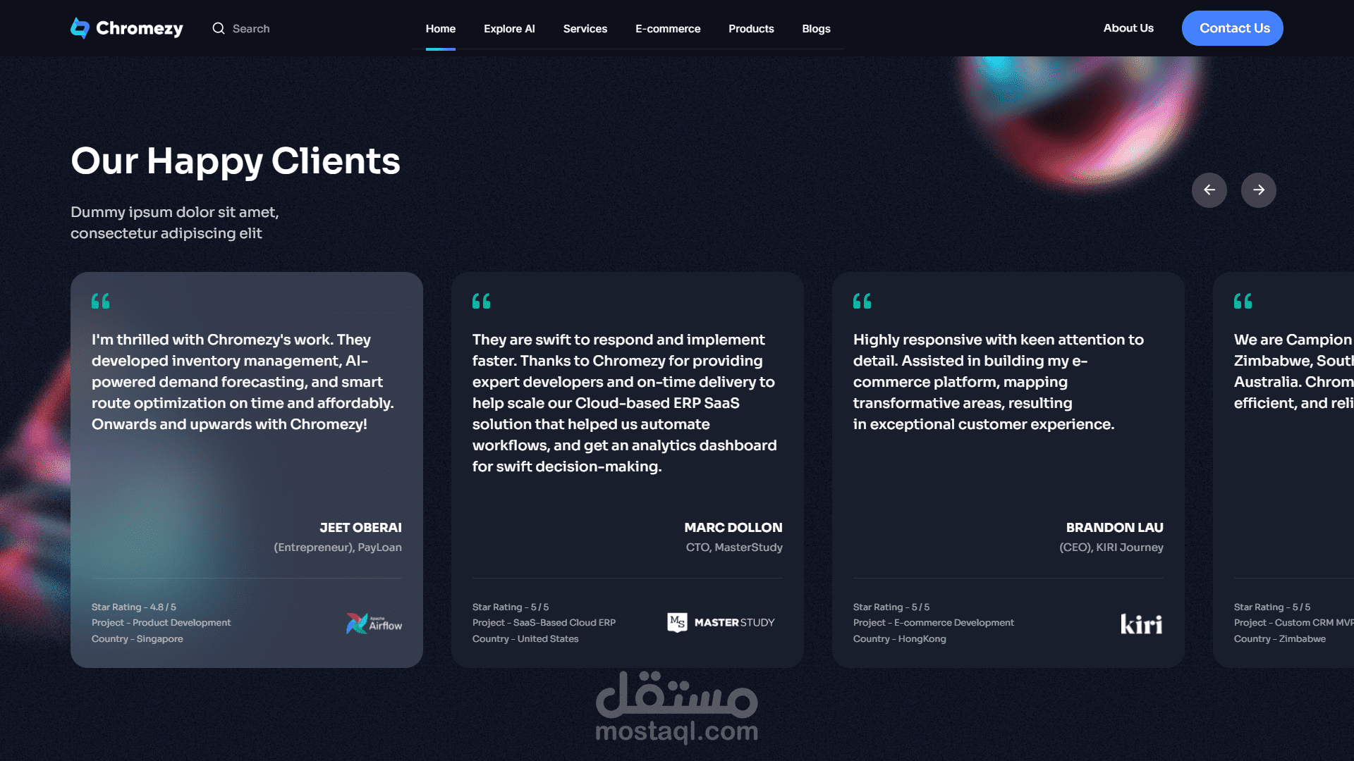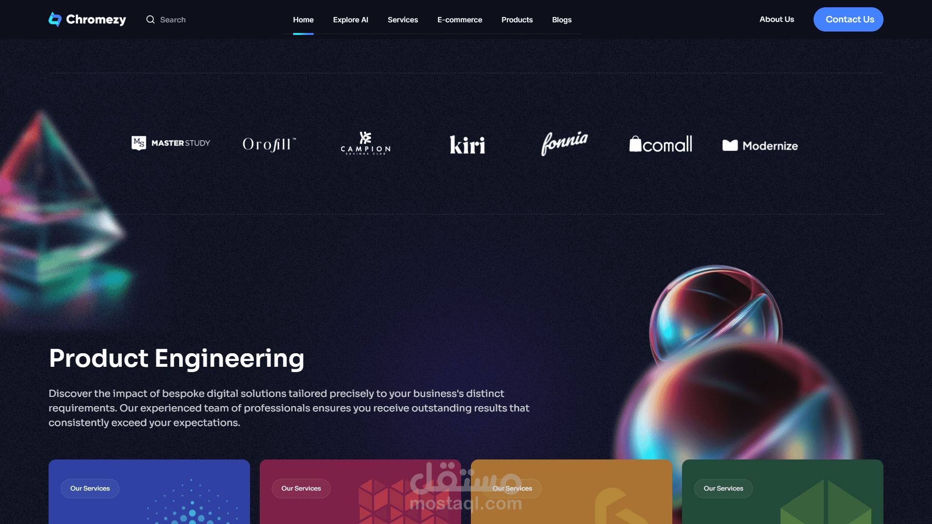Chromezy هو موقع ويب حديث مصمم ليقدم تجربة مستخدم غامرة من خلال Parallax Scrolling Effect. يعتمد الموقع على أحدث تقنيات الويب، مما يوفر تصميمًا سلسًا وتفاعليًا مع رسوم متحركة سلسة وتجربة مستخدم جذابة.
