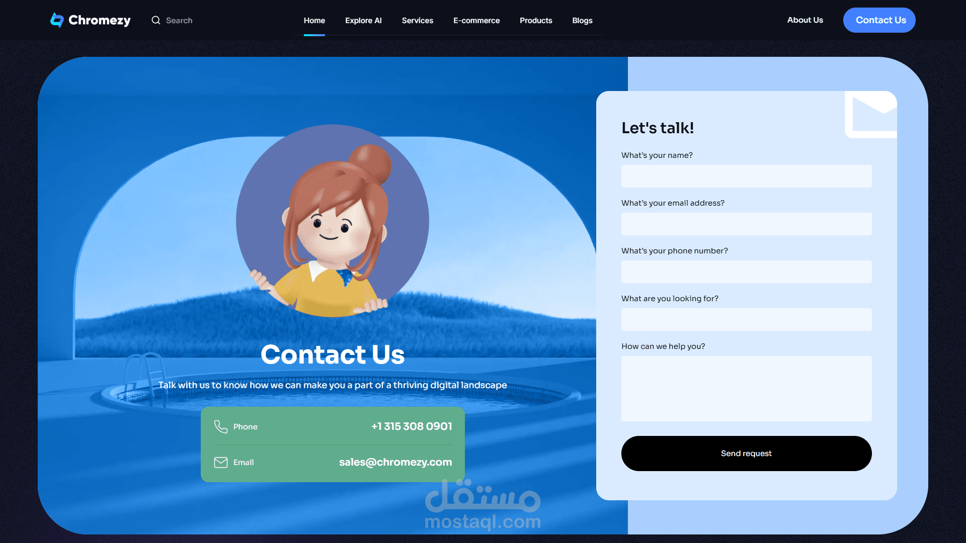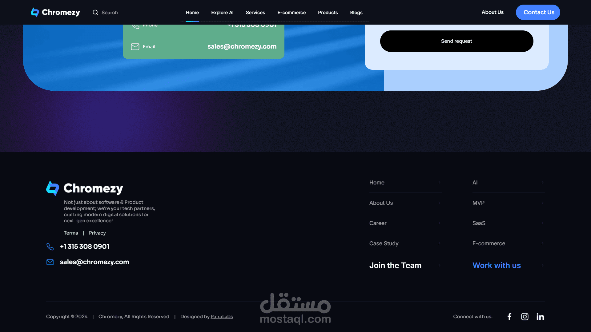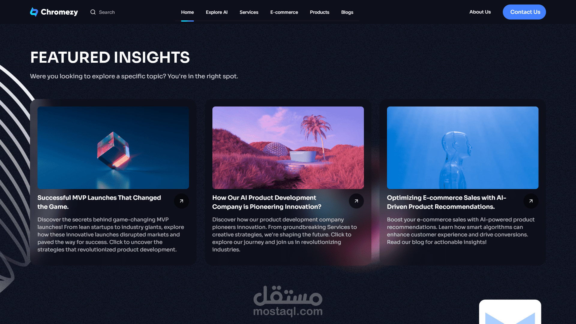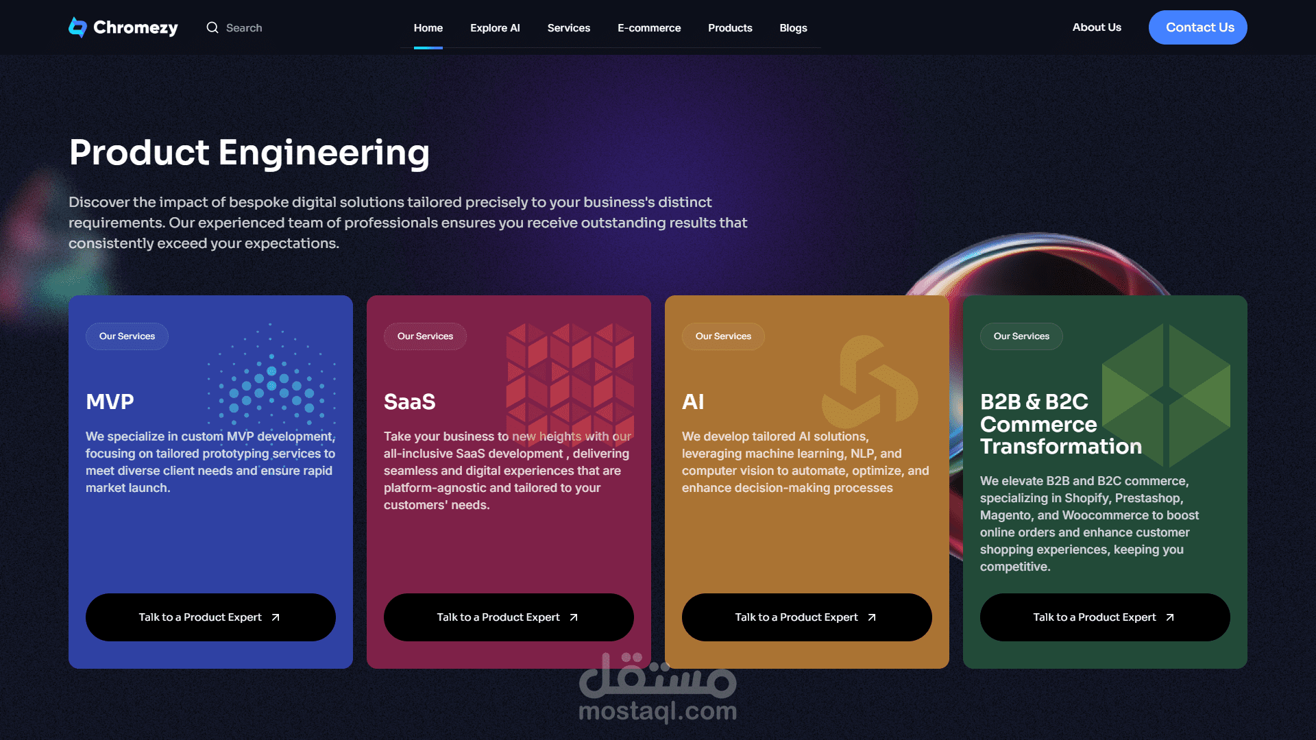 Chromezy هو موقع ويب حديث مصمم ليقدم تجربة مستخدم غامرة من خلال Parallax Scrolling Effect. يعتمد الموقع على أحدث تقنيات الويب، مما يوفر تصميمًا سلسًا وتفاعليًا مع رسوم متحركة سلسة وتجربة مستخدم جذابة.
