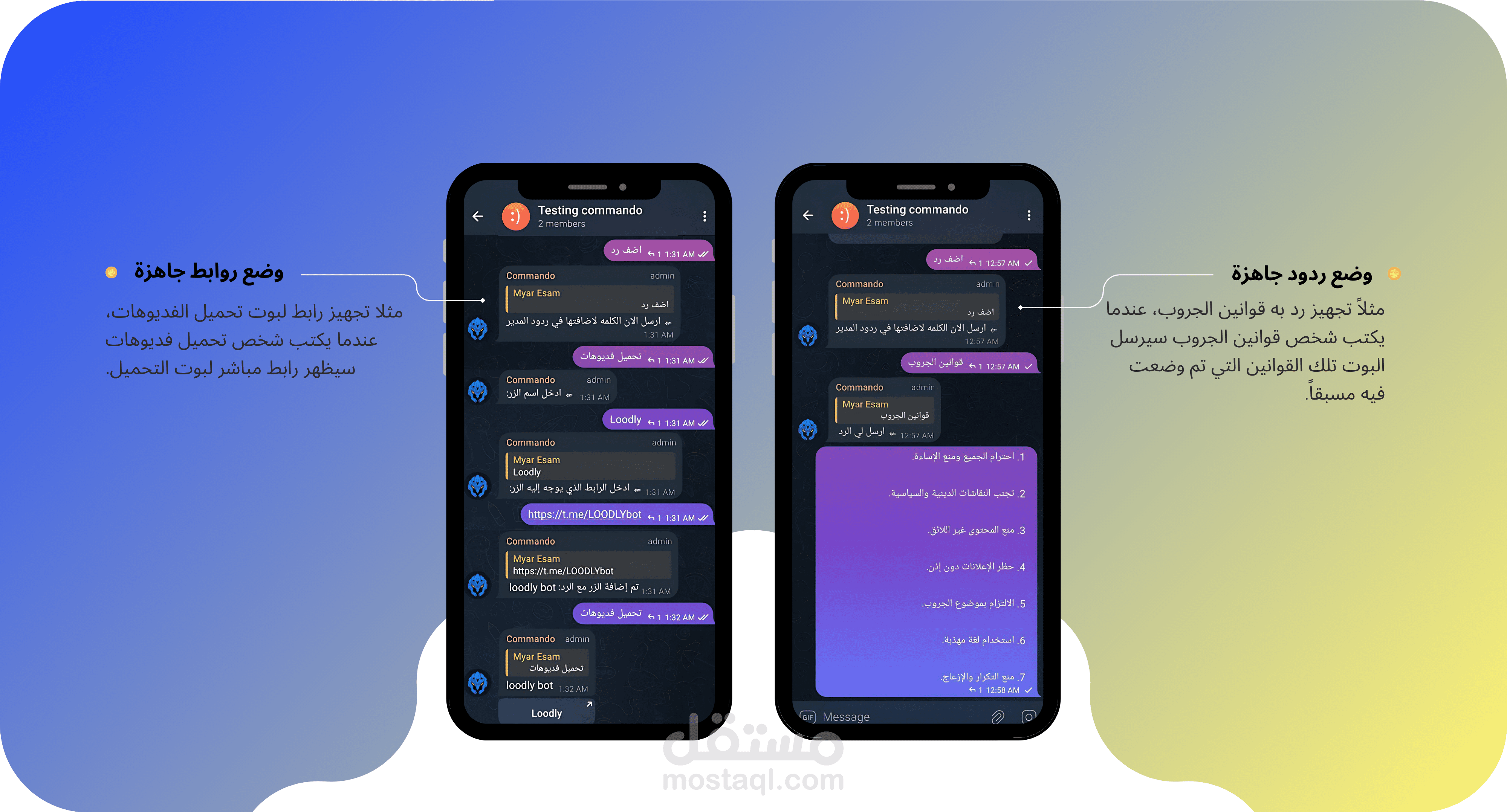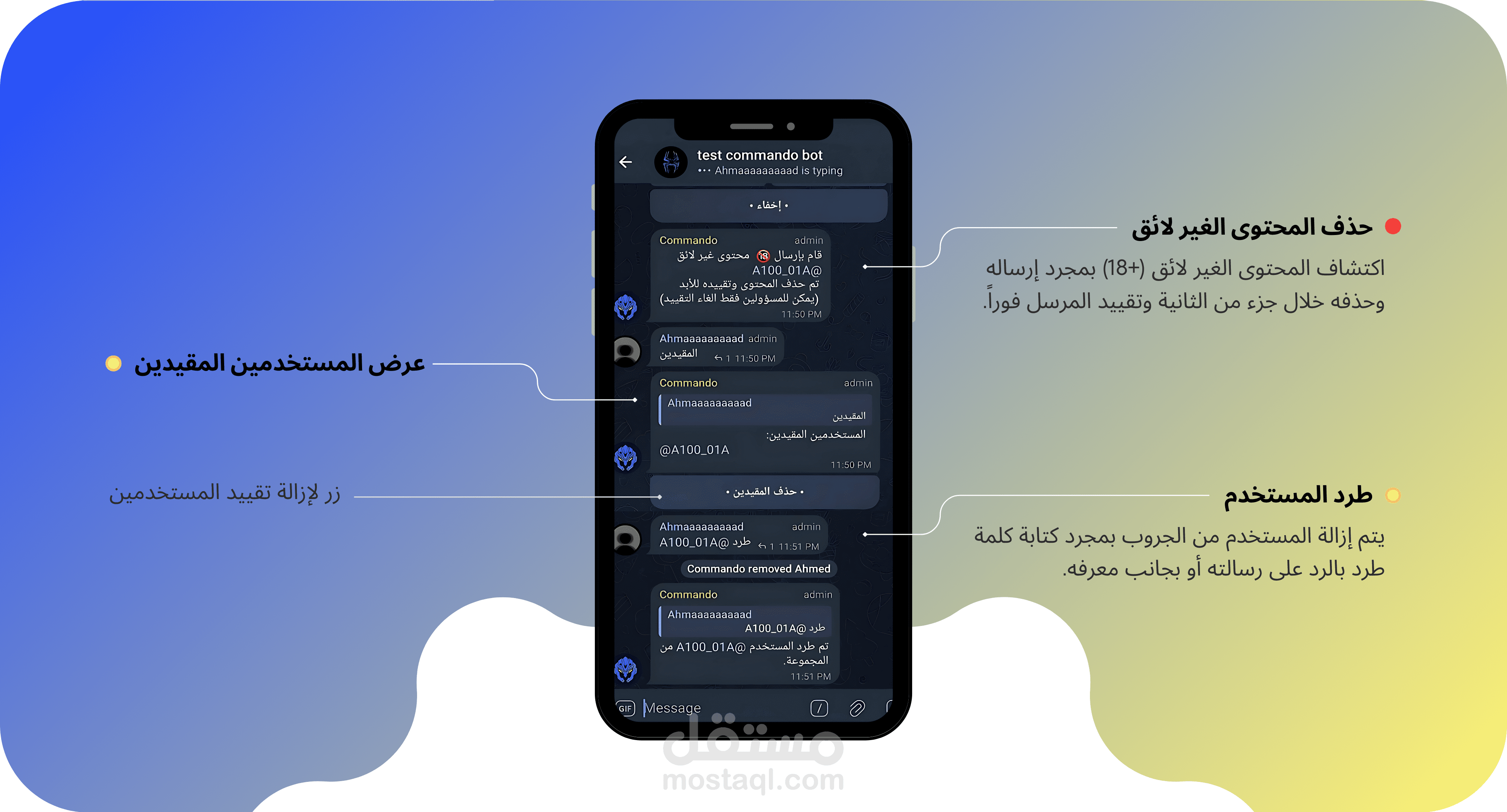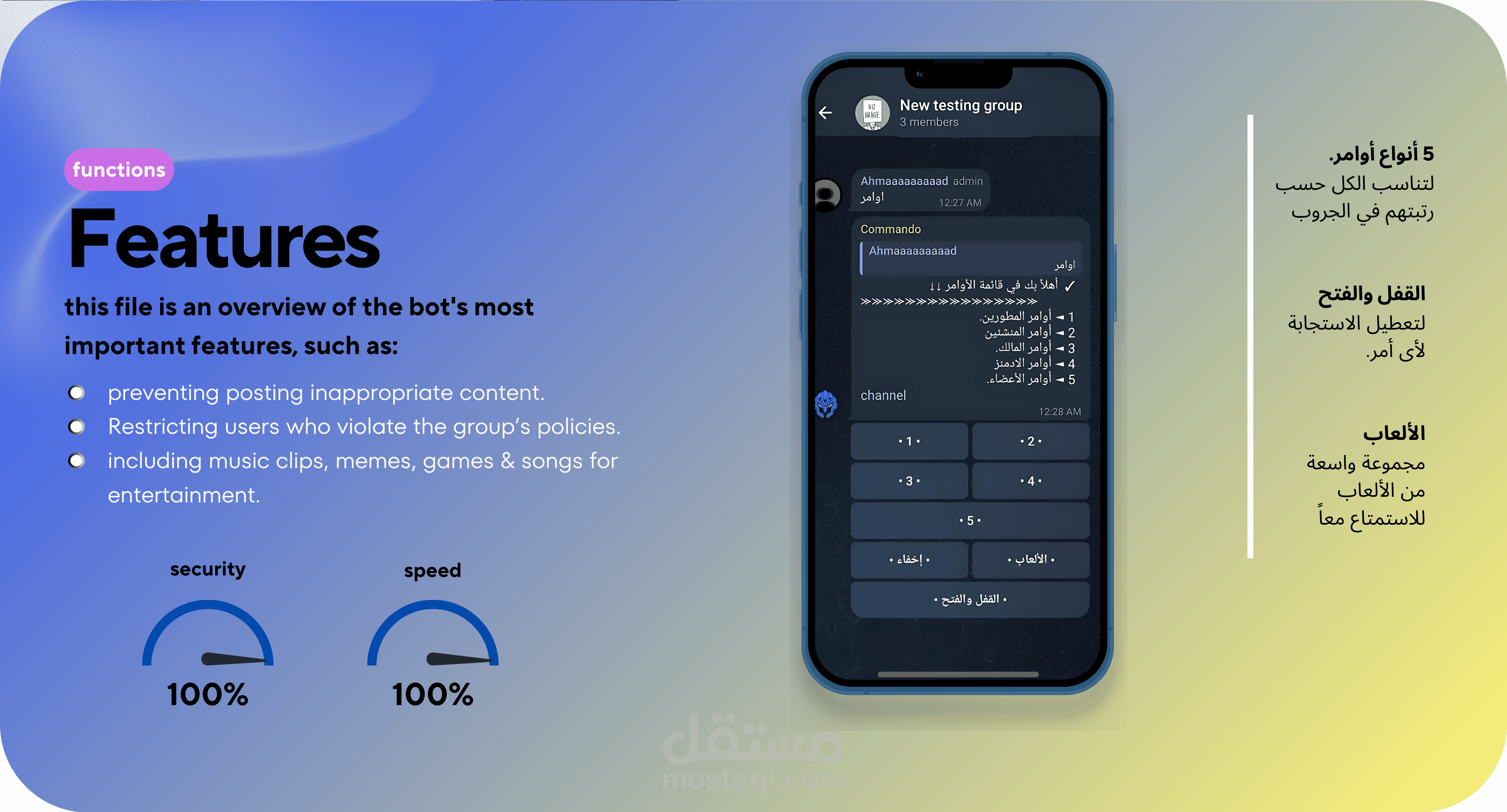 ملحوظة: هذه الأوامر أنت تكتبها للبوت وهو ينفذها وبعضها تقوم بتفعيله أى تسمح للبوت بتنفيذها مثل (إزالة المحتوى الغير لائق ومنع الروابط).