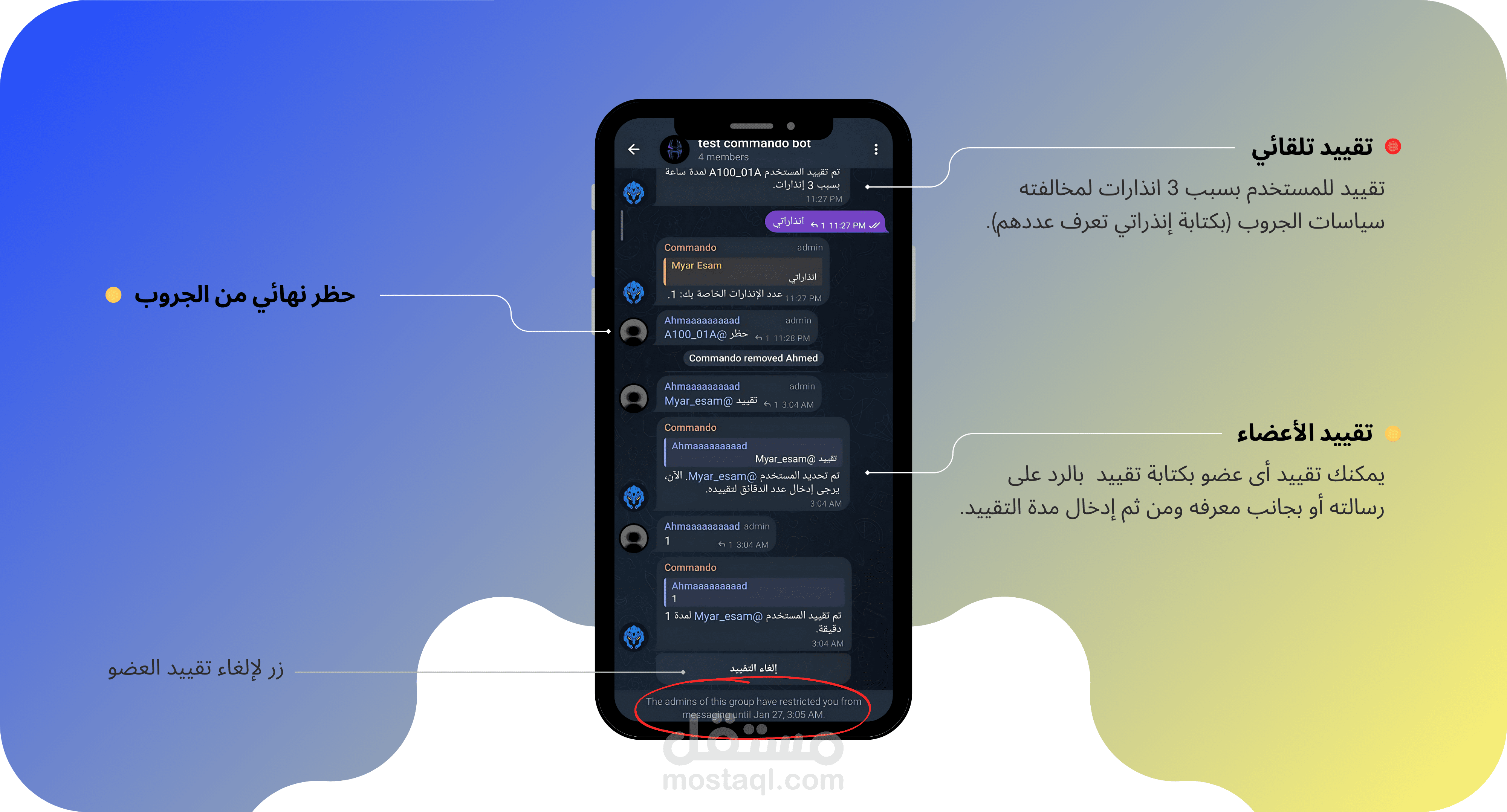 5. تقييد (مدة بالدقائق): منع الشخص من الإرسال لمدة محددة.