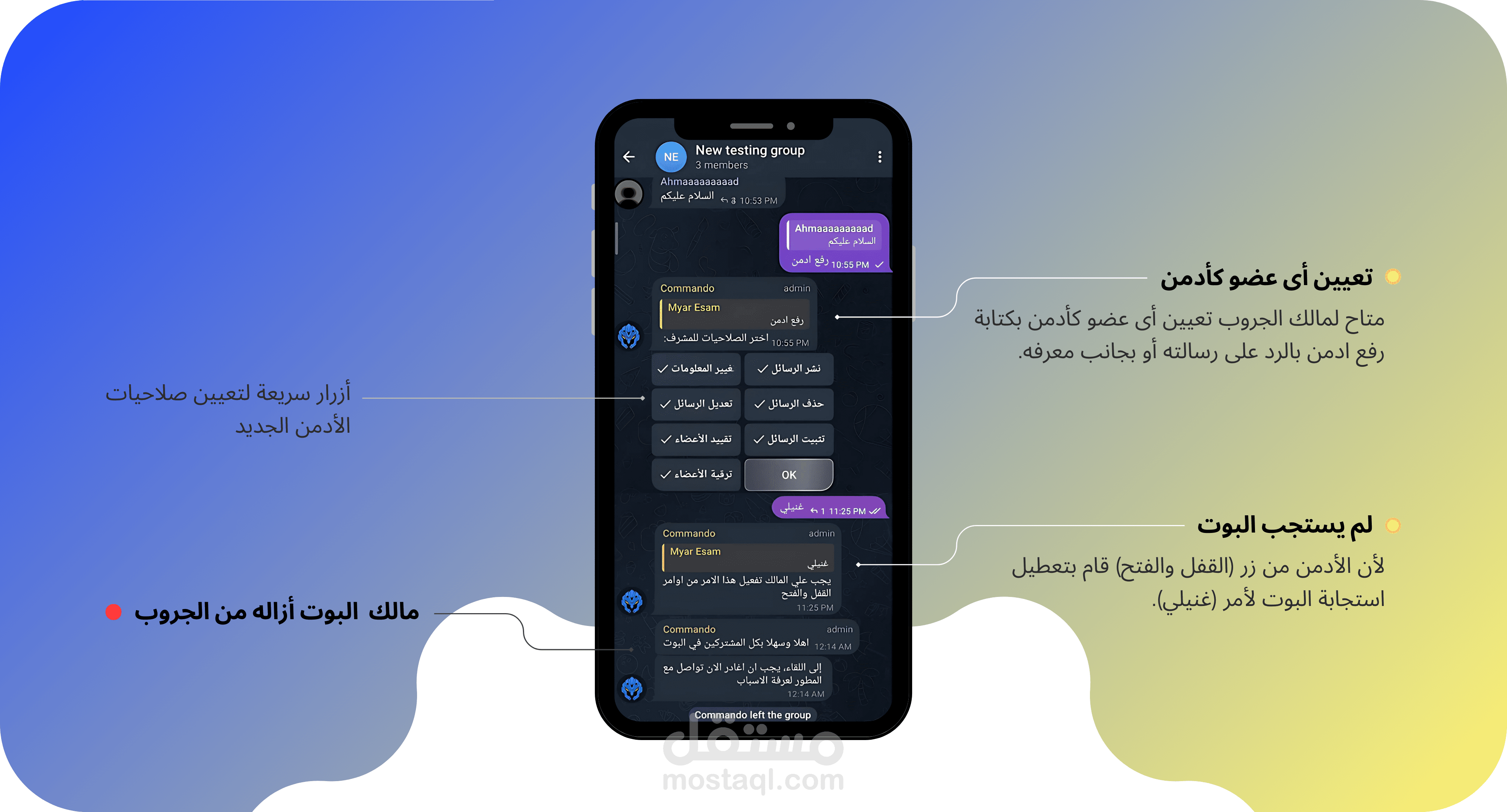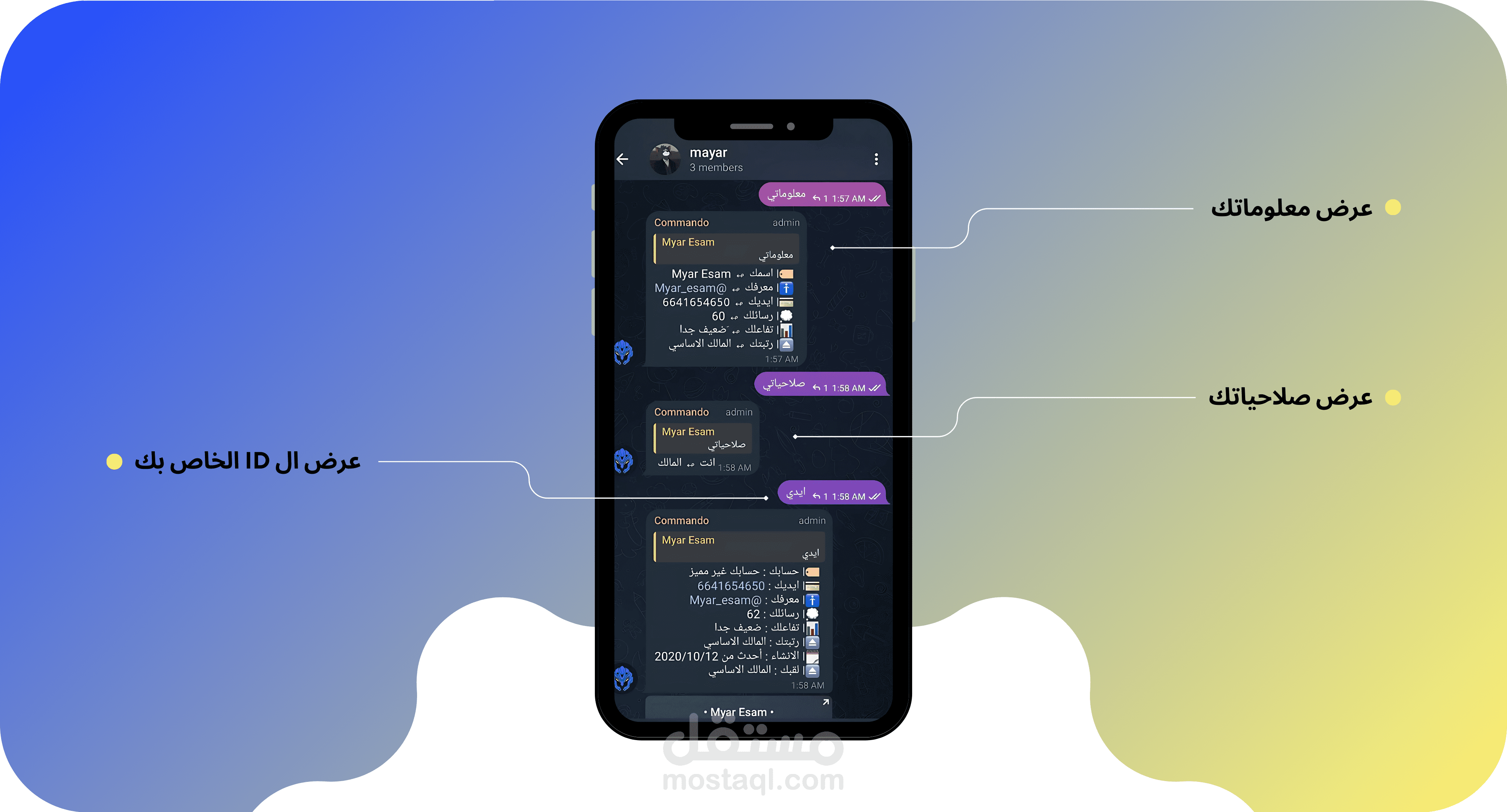 12. صلاحياته: معرفة صلاحيات أي شخص في الجروب.